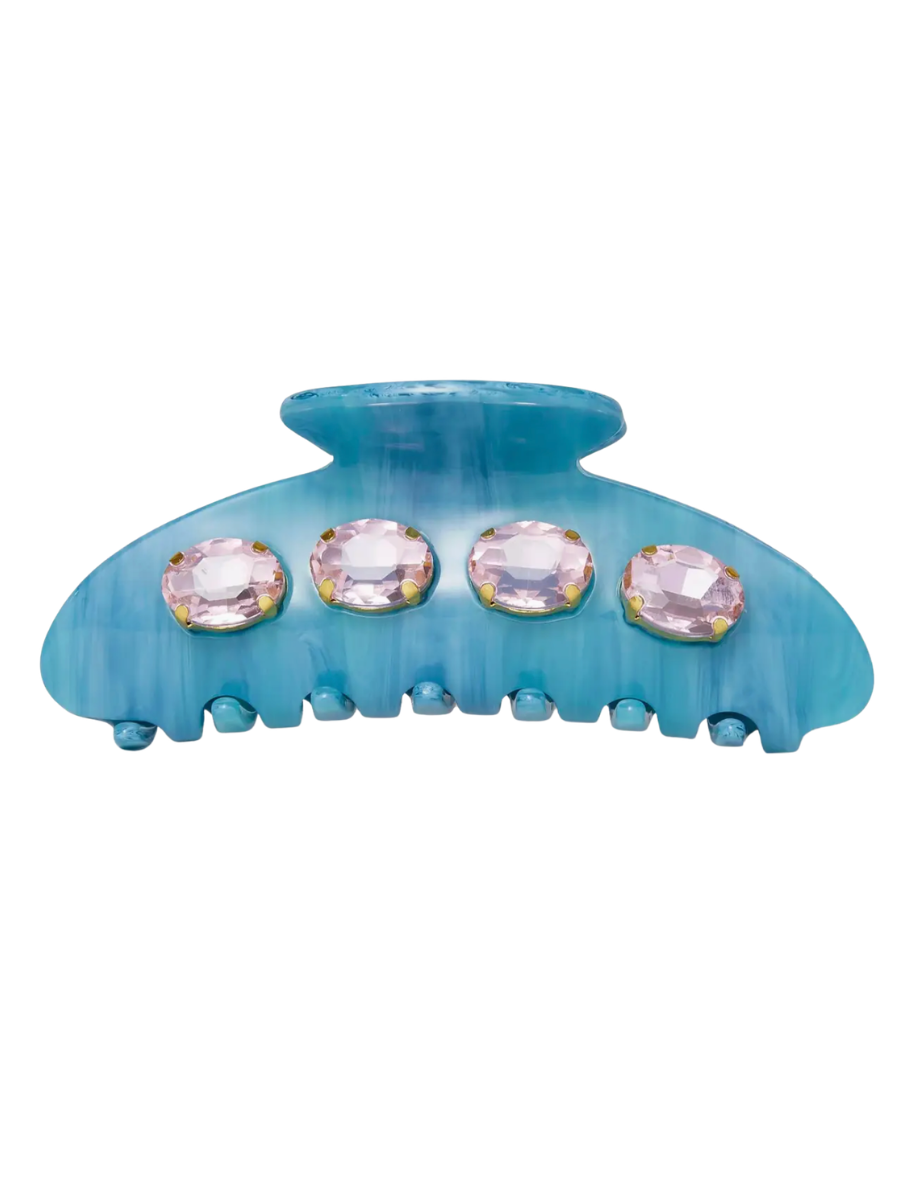 Make a statement with this oversized claw clip, hand-crafted from azure acetate with a mesmerizing swirled finish. Delicate light rose oval crystals are meticulously hand-set across the surface, catching light with every movement. It's the perfect size to secure thick hair while adding an elegant touch to any look. A luxe accessory that transforms an everyday essential into something truly special.