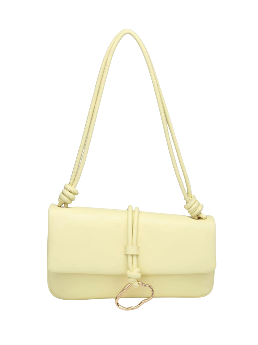 Belina Crossbody — a sleek baguette handbag silhouette with knotted shoulder strap and sculptural hardware. Vegan-leather, cruelty-free finish, structured yet soft, with a magnetic flap, internal zip pocket and slip organizer. Compact for essentials, roomy enough for phone, wallet and keys. Wear it as a shoulder or crossbody for effortless day-to-night polish.