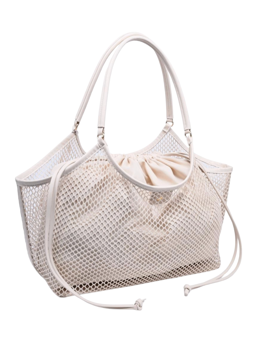 A chic mesh silhouette with a secure drawstring pouch, double handles and trimmed edges for polished structure. Made from vegan-friendly materials, it’s lightweight, durable and roomy enough for daily essentials while keeping valuables discreet. Versatile for work or weekends, pairs effortlessly with contemporary trends. Thoughtful details, easy-care finish and practical organization deliver a polished, ethical accessory that performs as beautifully as it looks.