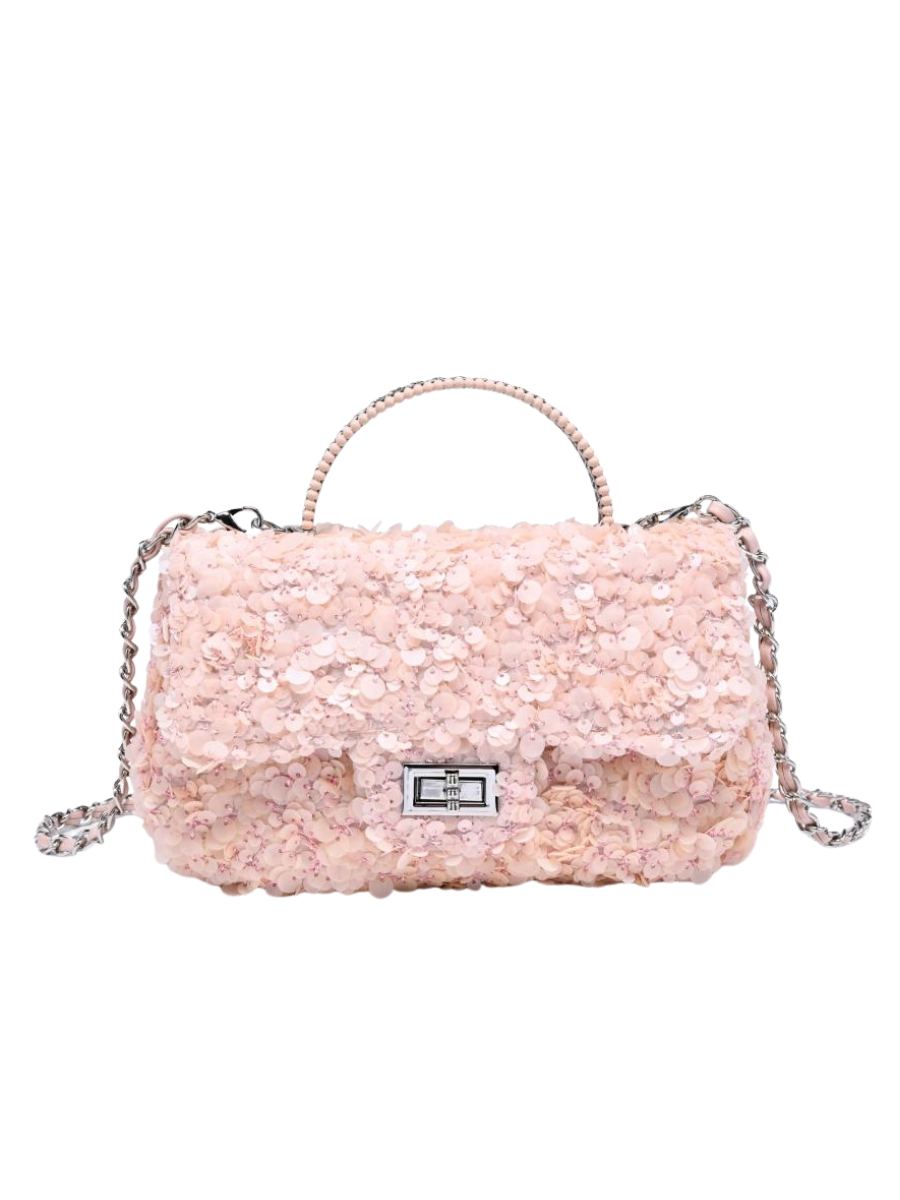 Sequin-covered Ella Evening Bag with sculpted beaded top handle that catches light for modern glamour. Chain-link shoulder strap and secure turn-lock keep your essentials protected, while vegan-friendly materials and polished hardware deliver luxury without compromise. Compact yet practical—perfect for cocktails, parties, and nights out.