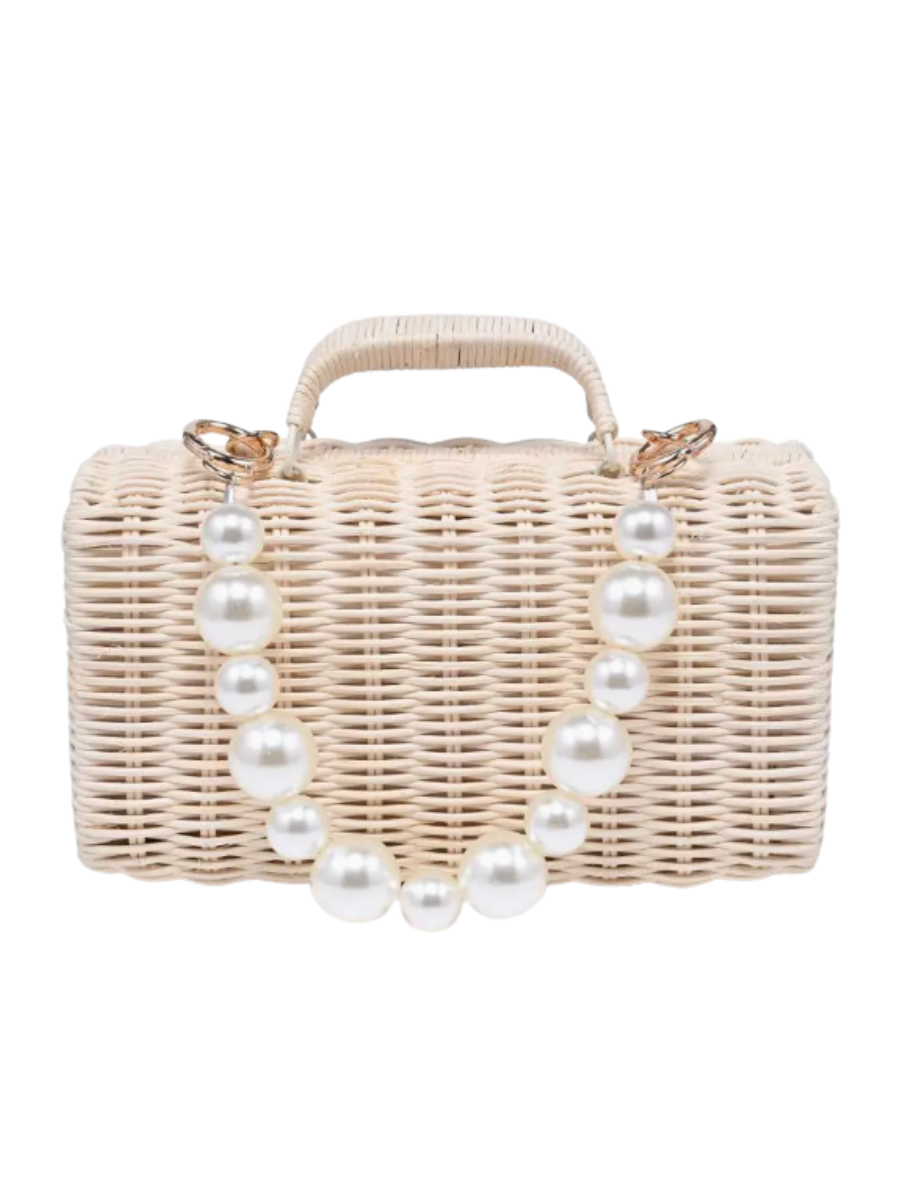 Everly Evening Bag — pearl-strung wicker box for cocktail nights. Boxy woven silhouette with a wrapped top handle, removable oversized pearl strap and gleaming ring hardware. Vegan-friendly, lightweight design, interior fits essentials: phone, cards, lipstick. Wear as a chic top-handle clutch or attach the pearl strap for shoulder carry. A modern, timeless statement for weddings, dinners and summer soirées.