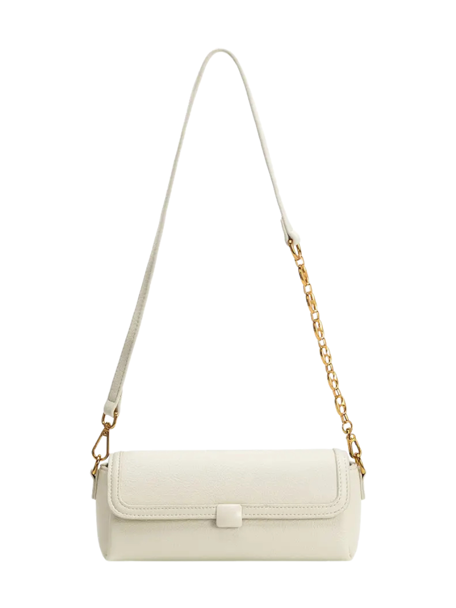 Polished and practical, the Fancy bag features a faux leather finish with a snap-closure flap, a zippered compartment, and an organized interior pocket. It includes two straps—a crossbody strap and a shoulder strap finished with a chain detail—for versatile styling.