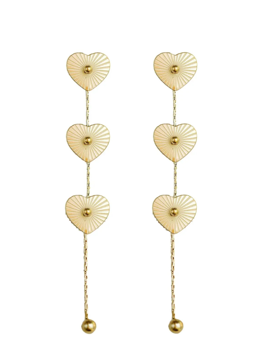 Add a sleek and modern touch to your everyday wardrobe with these easy and on-trend gold plated stainless steel earrings. Featuring three delicate heart charms that swing and sparkle with every movement, these weightless earrings are the perfect easy, seasonless update to pair with both neutrals and prints.
