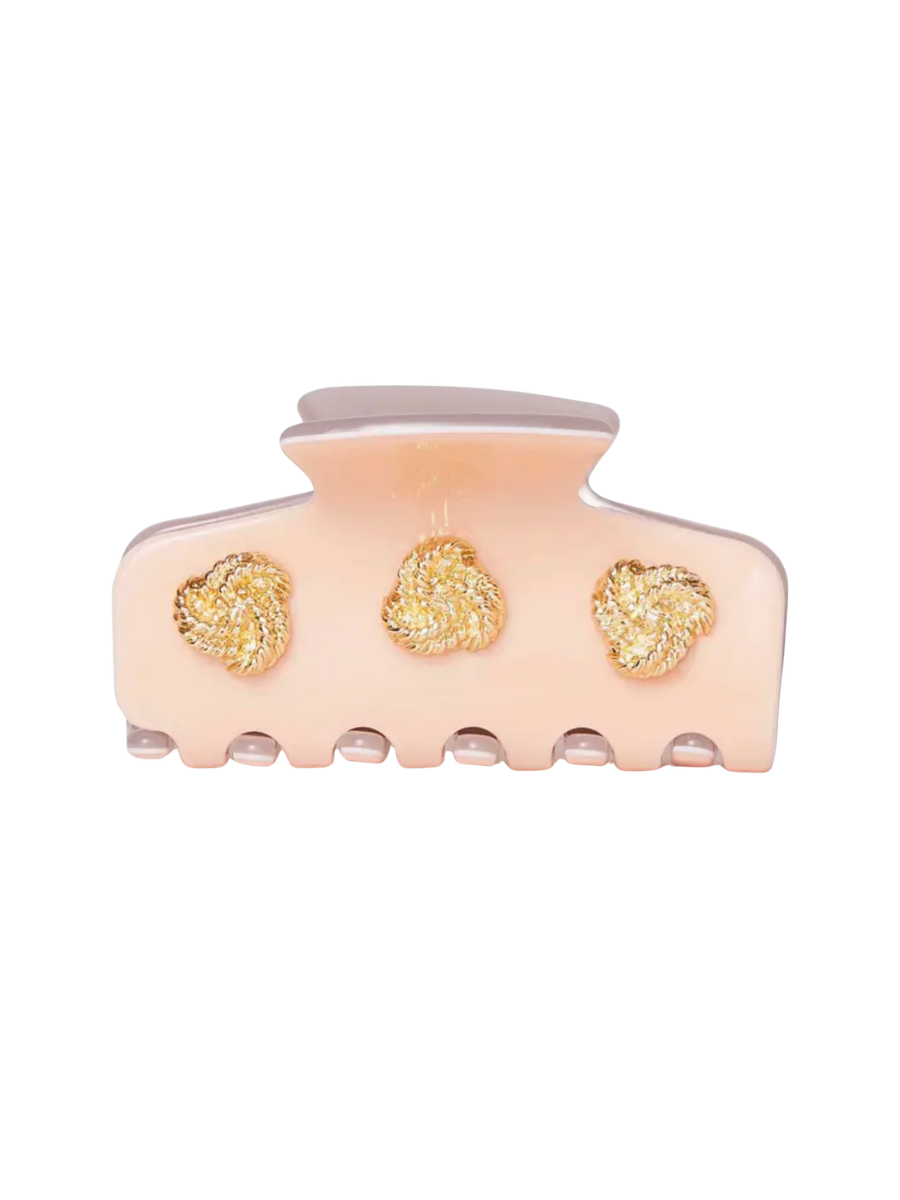 Delicate peach-toned mini claw clip featuring elegant gold knot details on both sides. Perfect for securing small sections of hair with a touch of sophistication. The compact design makes it ideal for everyday styling, updos, or adding a subtle accessory accent to your look. Lightweight and gentle on hair.