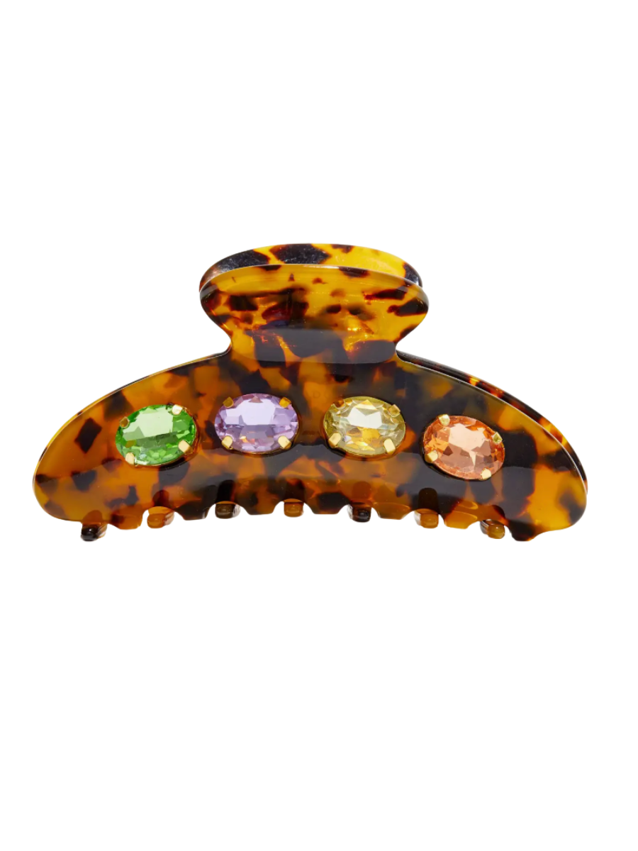 Hold your hair in effortless style with this tortoise large claw clip, adorned with shimmering multi-color crystal details along both sides. The classic tortoiseshell pattern pairs beautifully with sparkling accents for a touch of glamour. Perfect for securing thick or voluminous hair while adding a sophisticated finishing touch to any look.