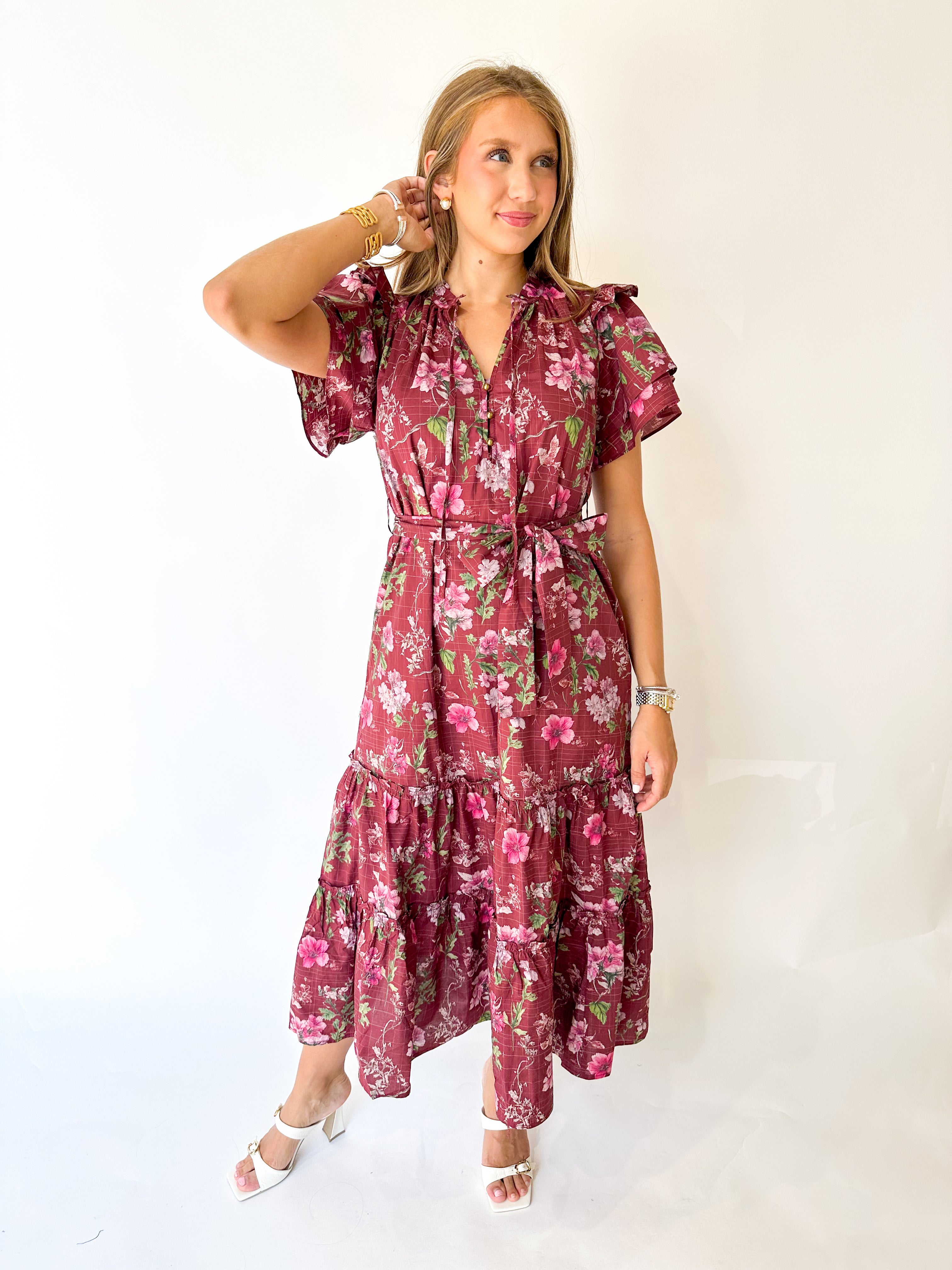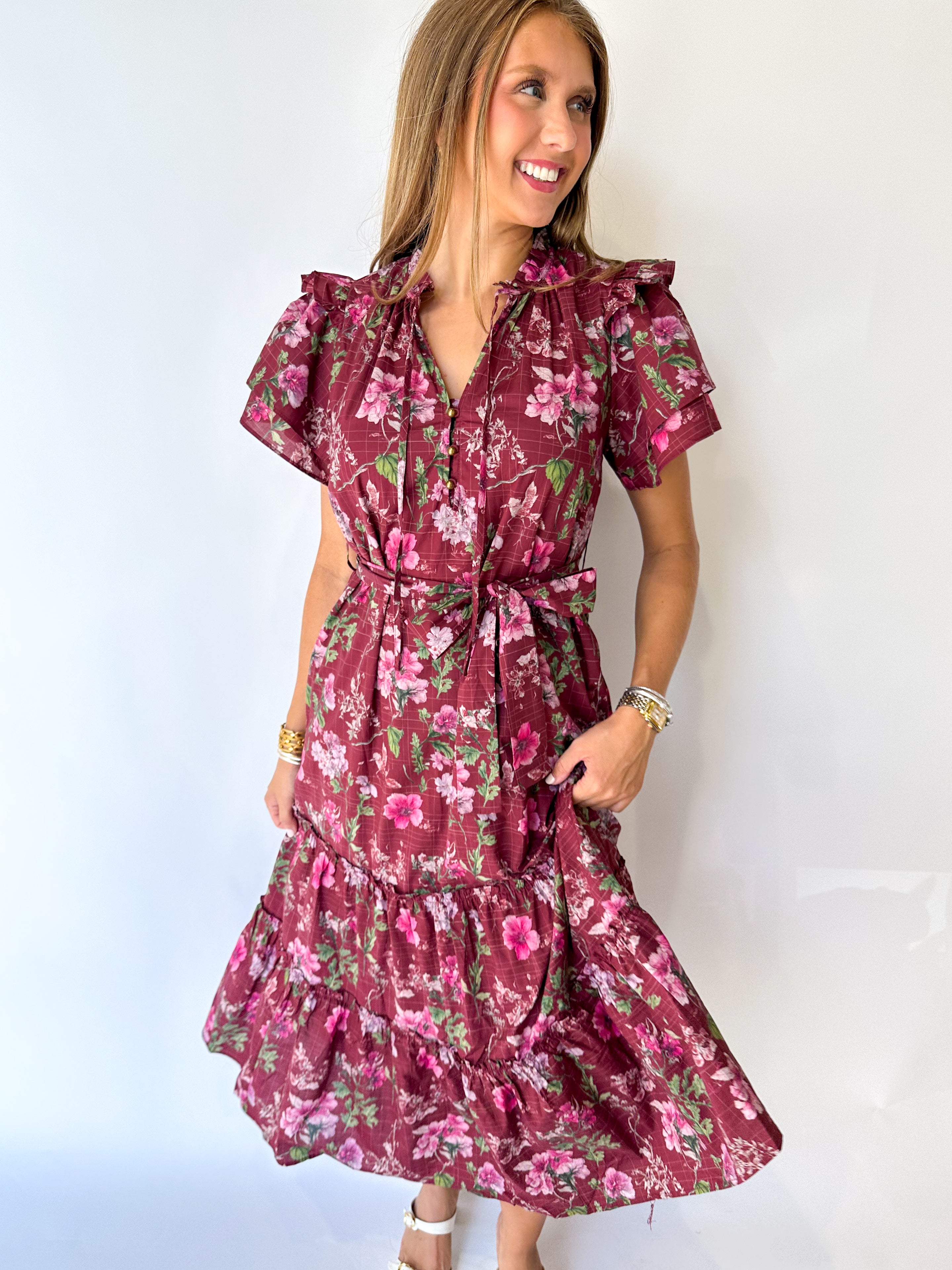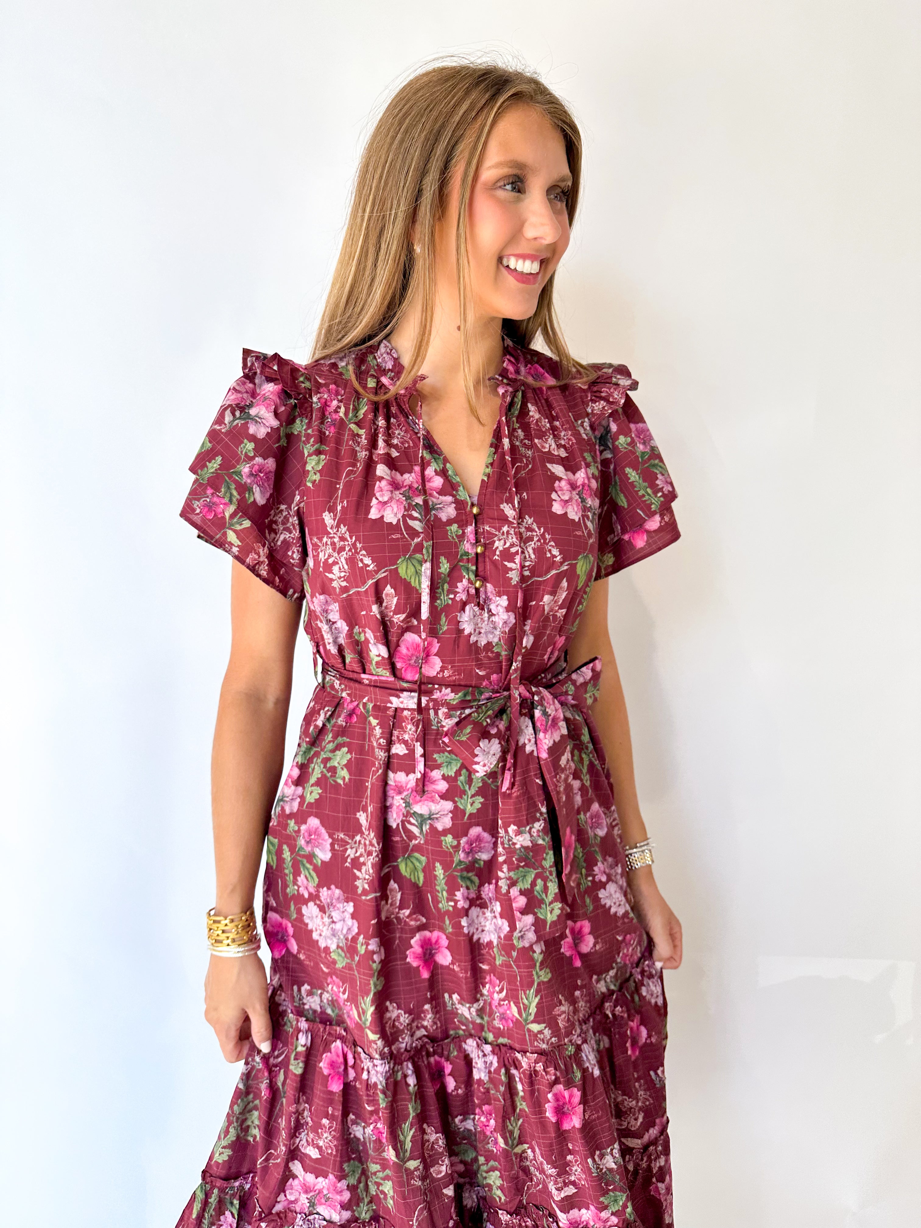 Embrace effortless elegance with this burgundy midi dress featuring a delicate floral print and flattering short sleeves. The self-tie waist accentuates your figure, making it perfect for family pictures or any fall occasion. Its button-down design adds a classic touch while ensuring comfort and style throughout the day.