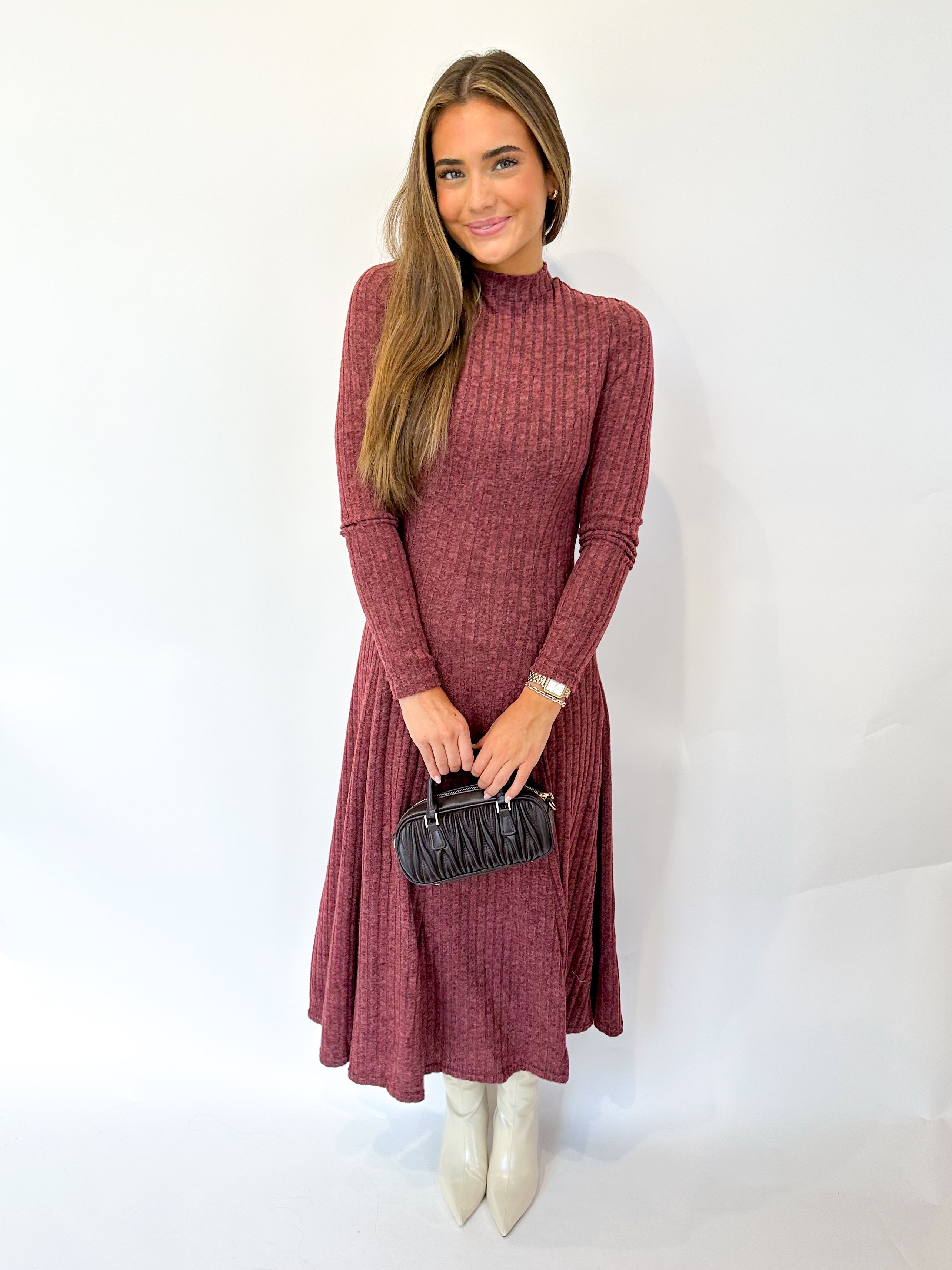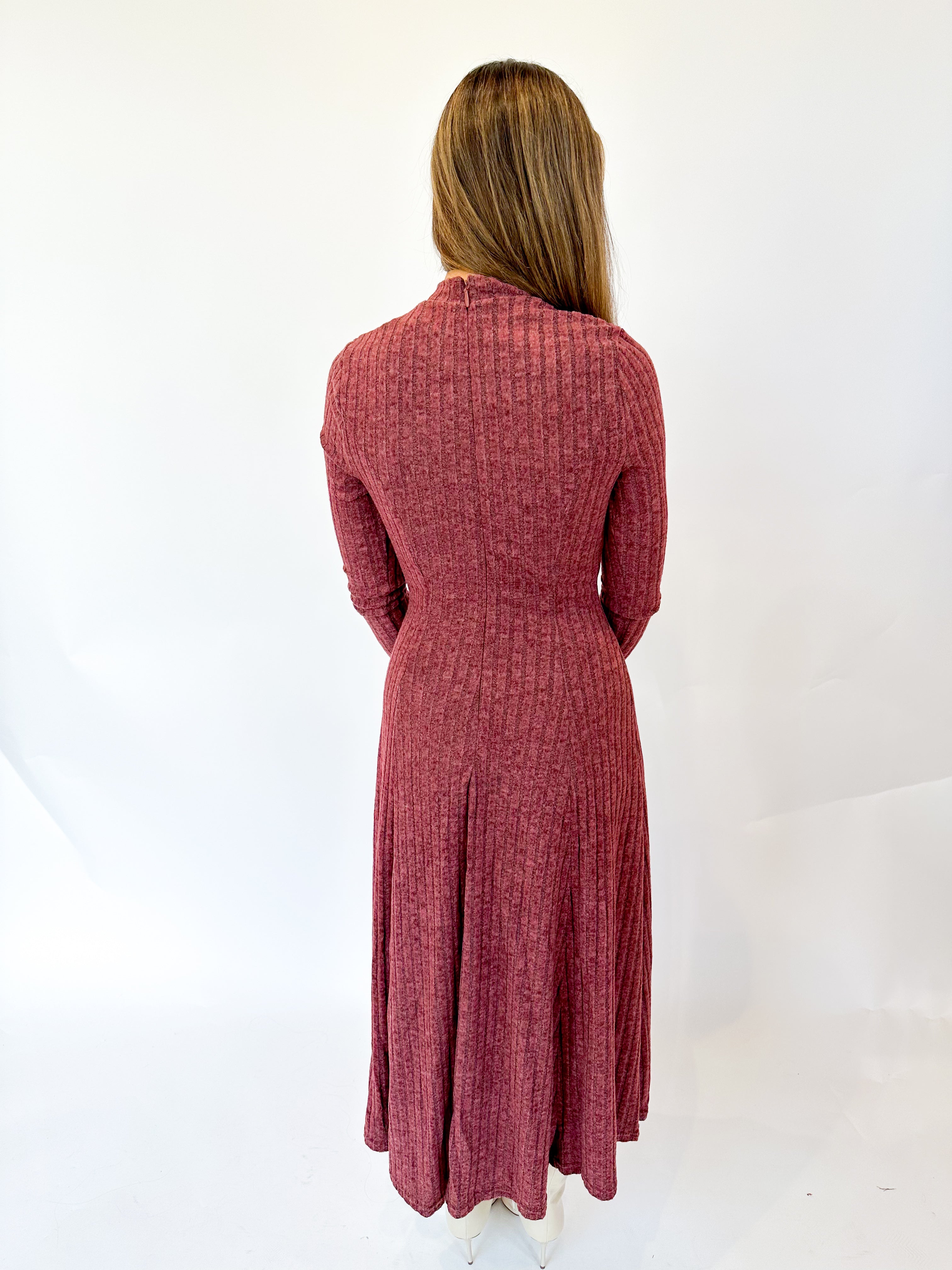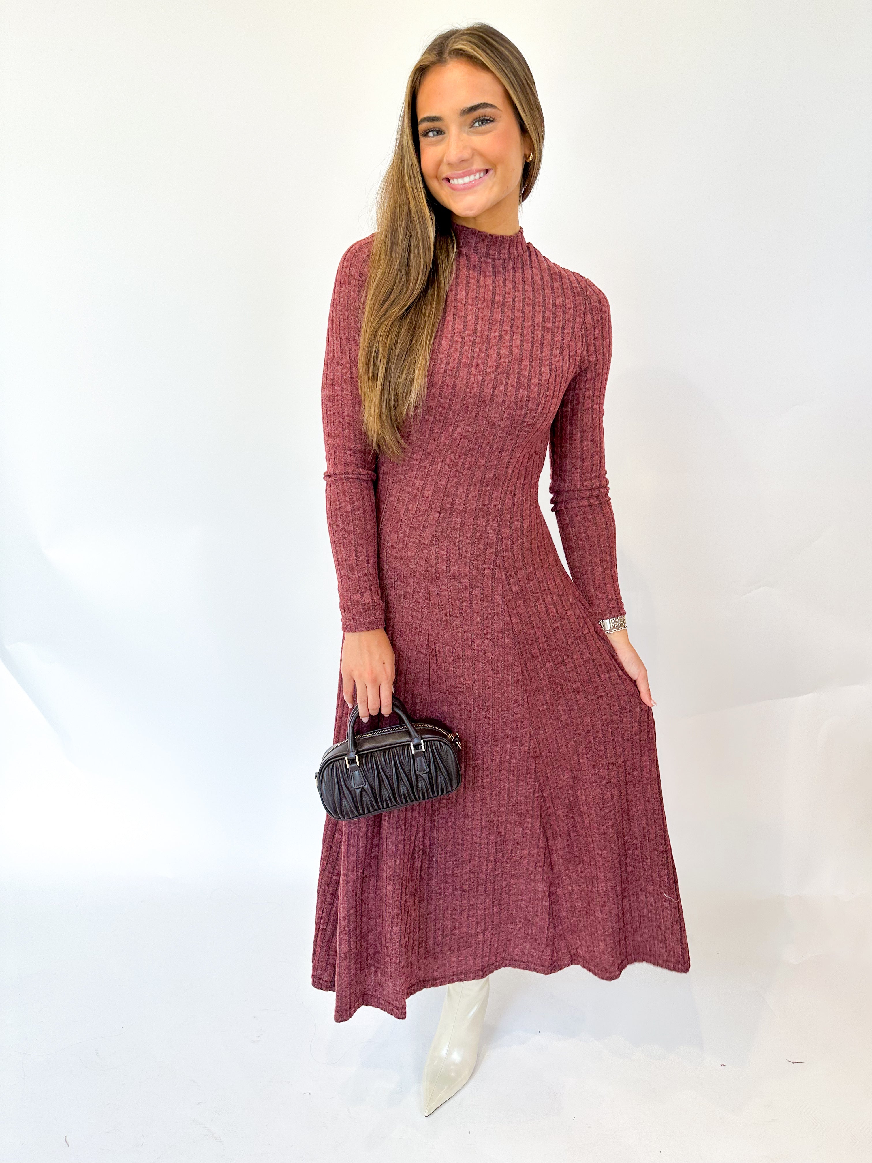 Embrace timeless elegance with this ribbed brushed knit midi dress, designed to flatter every silhouette. The mock neckline and long sleeves provide a refined look, while the flowing circle skirt adds graceful movement. A discreet back zipper ensures a seamless fit, making it perfect for day-to-night wear. Comfortable and stylish, this dress is an effortless choice for any occasion.