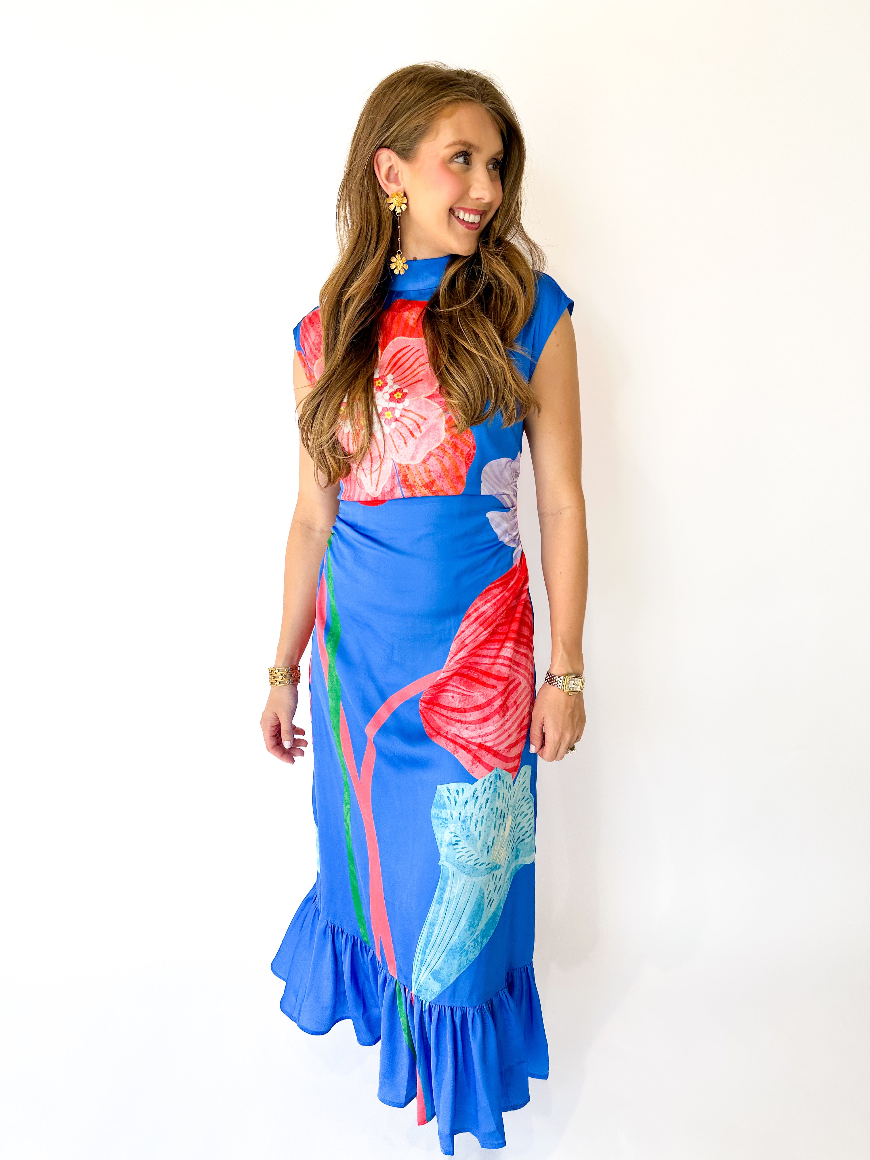 Say hello to our gorgeous Estelle dress! This form-fitting and classic, maxi style frock with cap sleeves and ruffle details will be the perfect addition to your spring closet. We are swooning over the beautiful blue and poppy combo for your next Spring event!