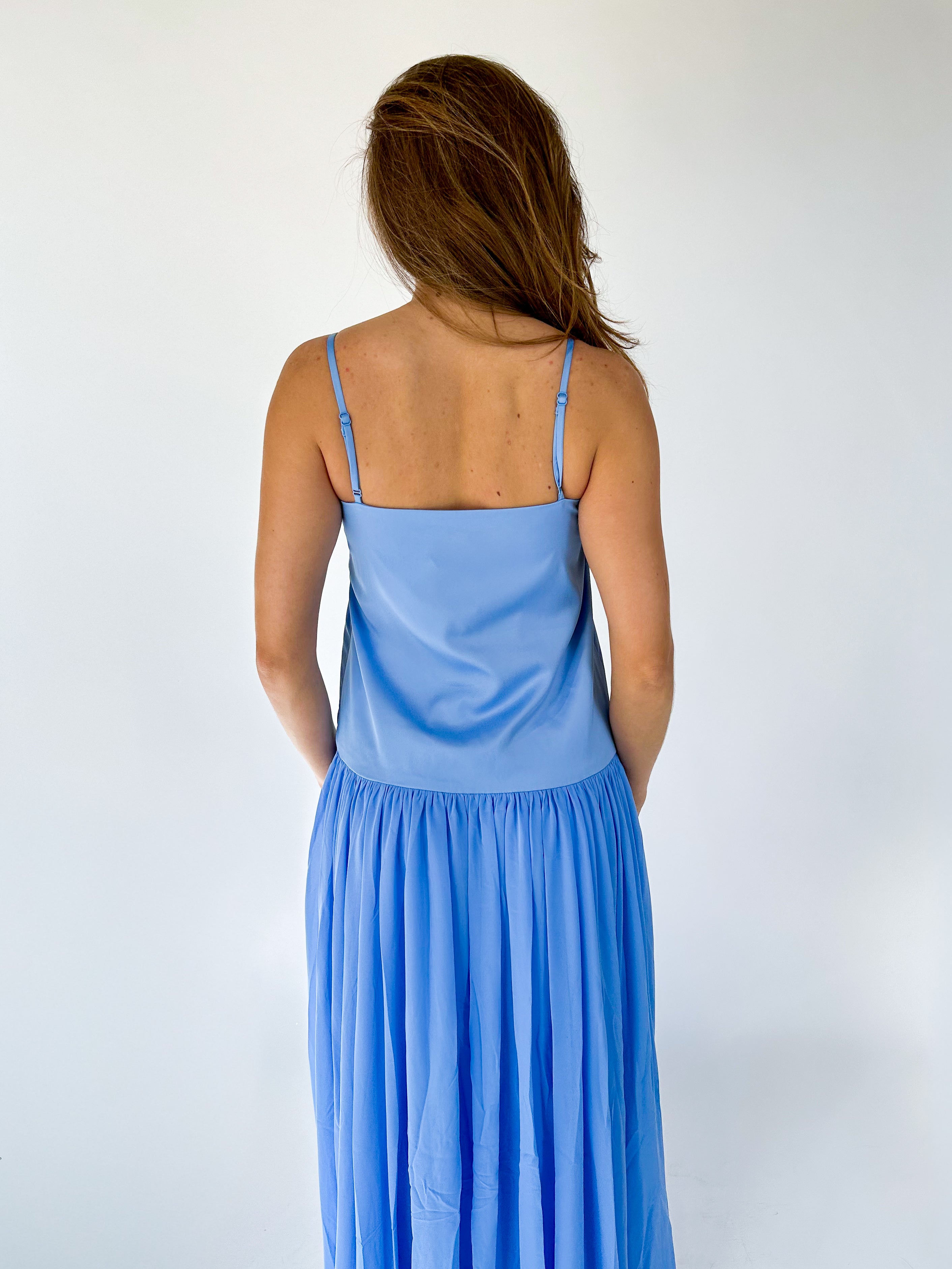 The Marina Silky Maxi Dress combines timeless elegance with modern sophistication. This stunning piece features a drop waist silhouette that flatters every frame, paired with a flowing chiffon skirt for graceful movement. The square neckline and delicate spaghetti straps create a refined, feminine look. This maxi dress transitions seamlessly from spring weddings to cocktail events, making it an essential addition to your elevated wardrobe.