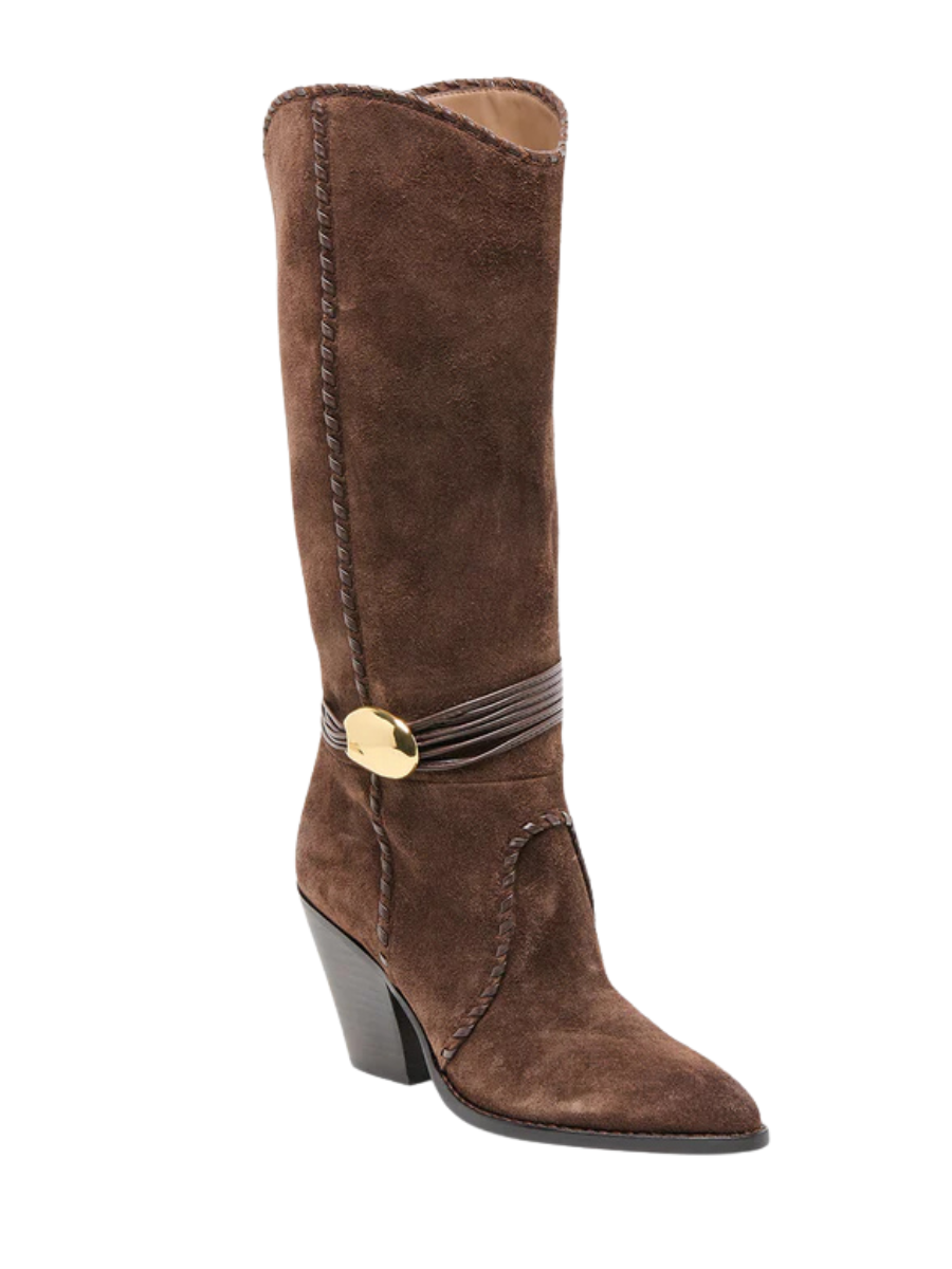 Jodie is western-inspired and ready for everyday wear. This knee-high boot’s traditional details, like a stacked block heel and pointed toe, are elevated with a gold metal accent. Style her neutral suede color ways with jeans on the weekend and midi skirts during the week.