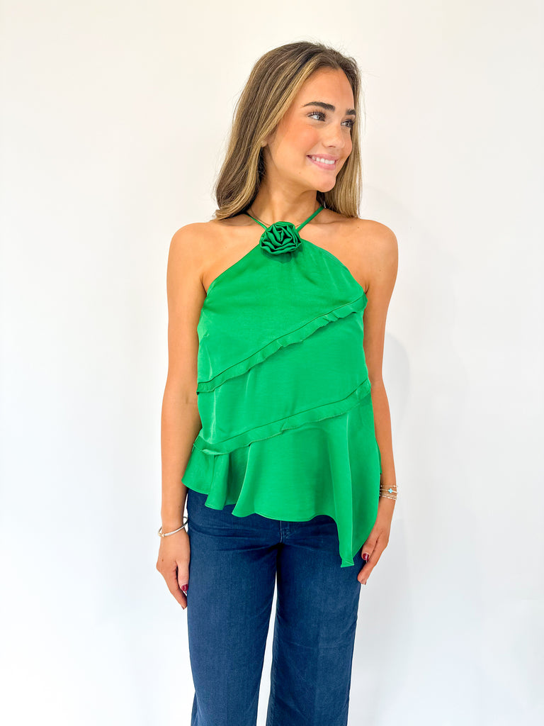 It is constructed with a dramatic halter neckline that wraps around the neck, showcasing the shoulders and back. The standout detail is the prominent asymmetric rosette (a large floral embellishment) placed on the bodice, which adds couture-level texture and visual interest. The top appears fitted through the bodice, creating a sleek foundation for the statement detail.