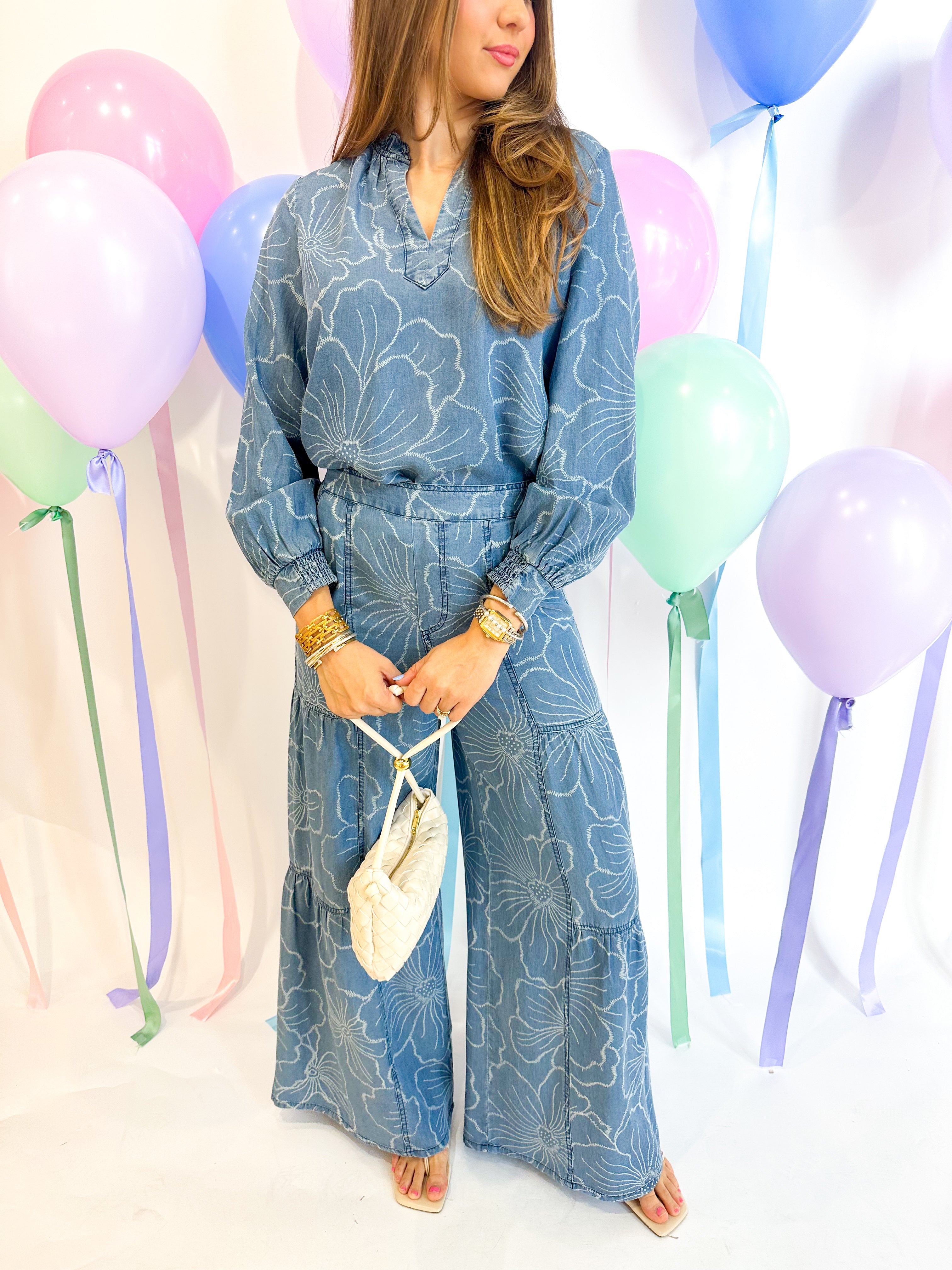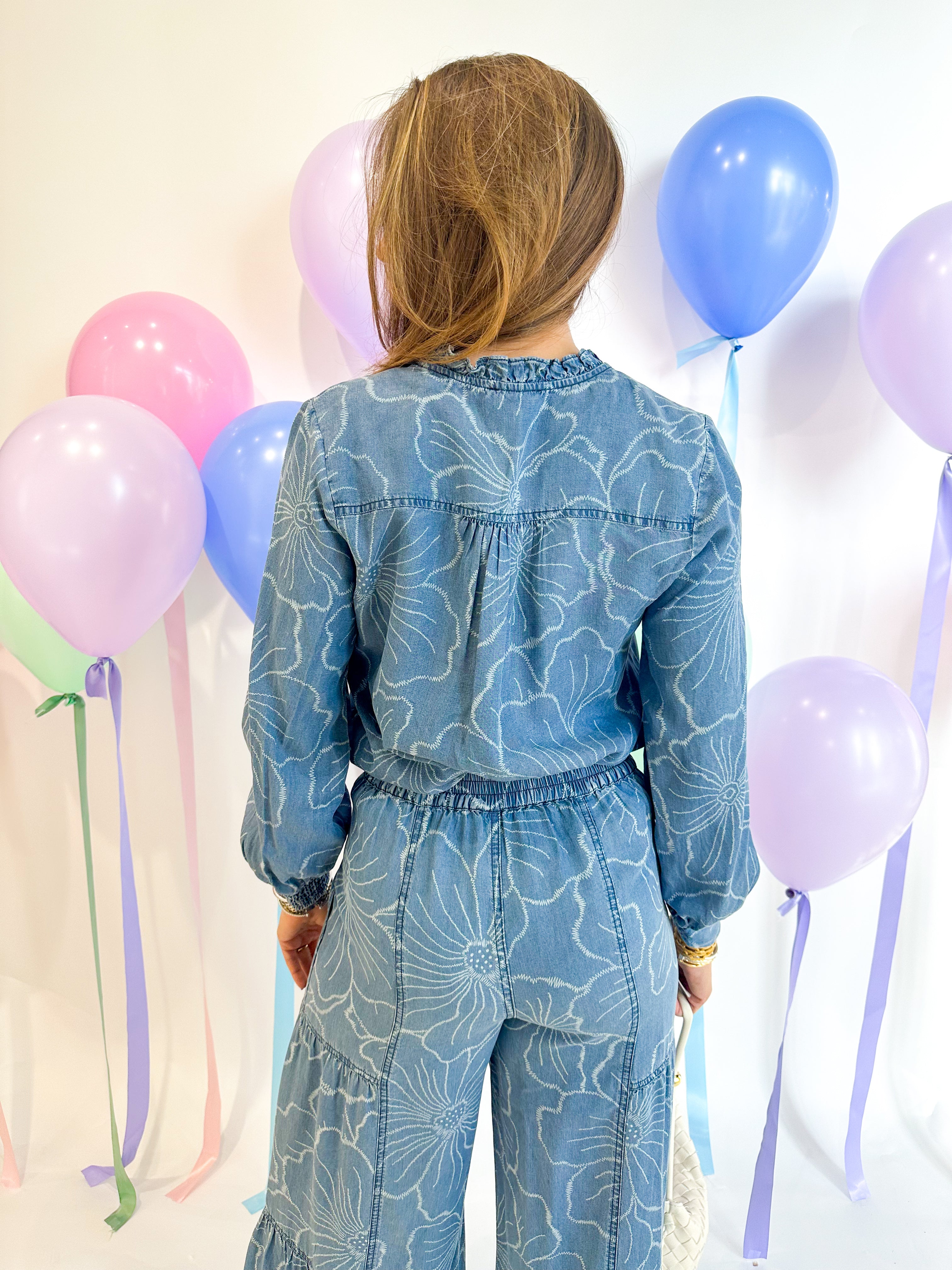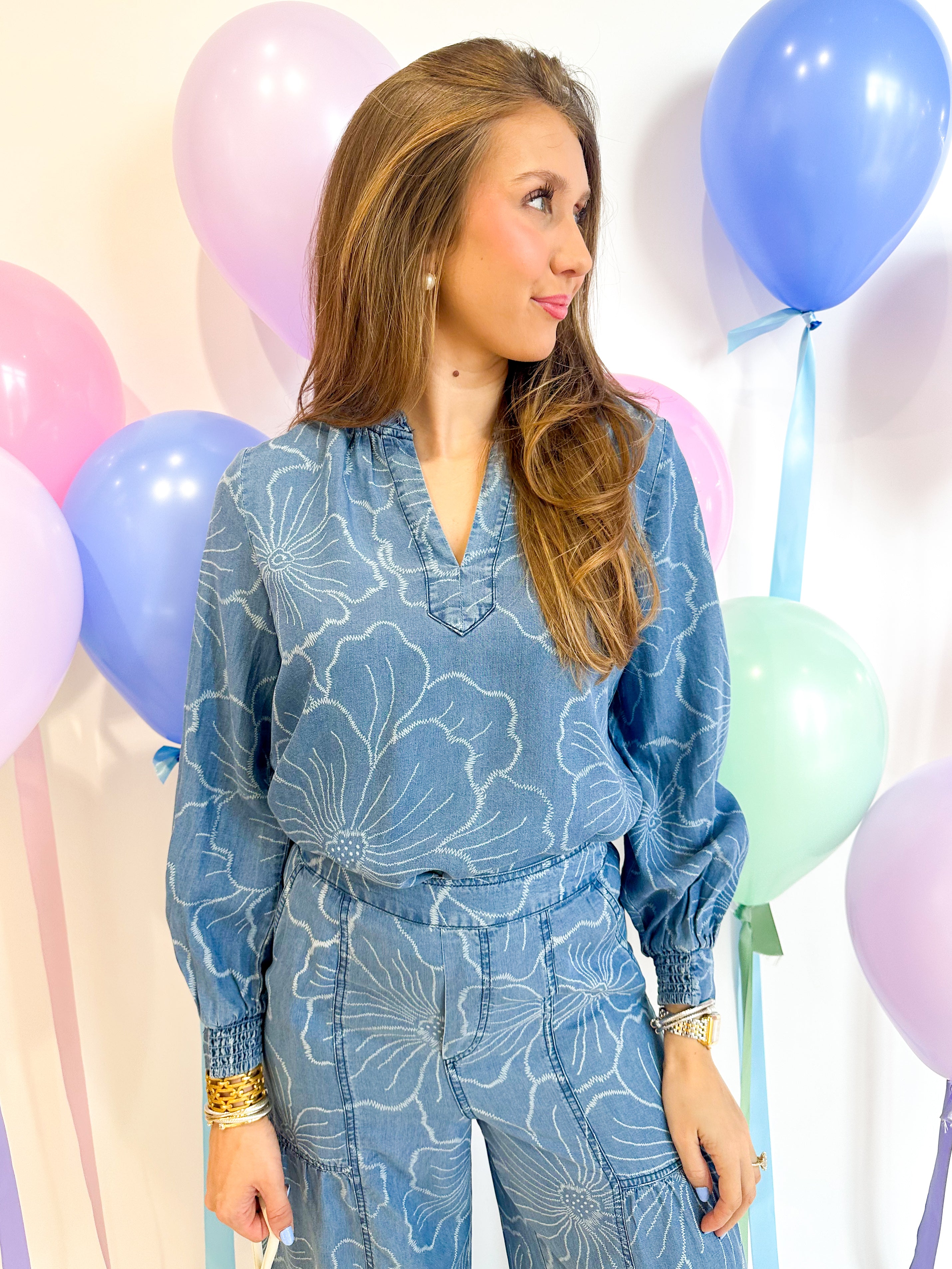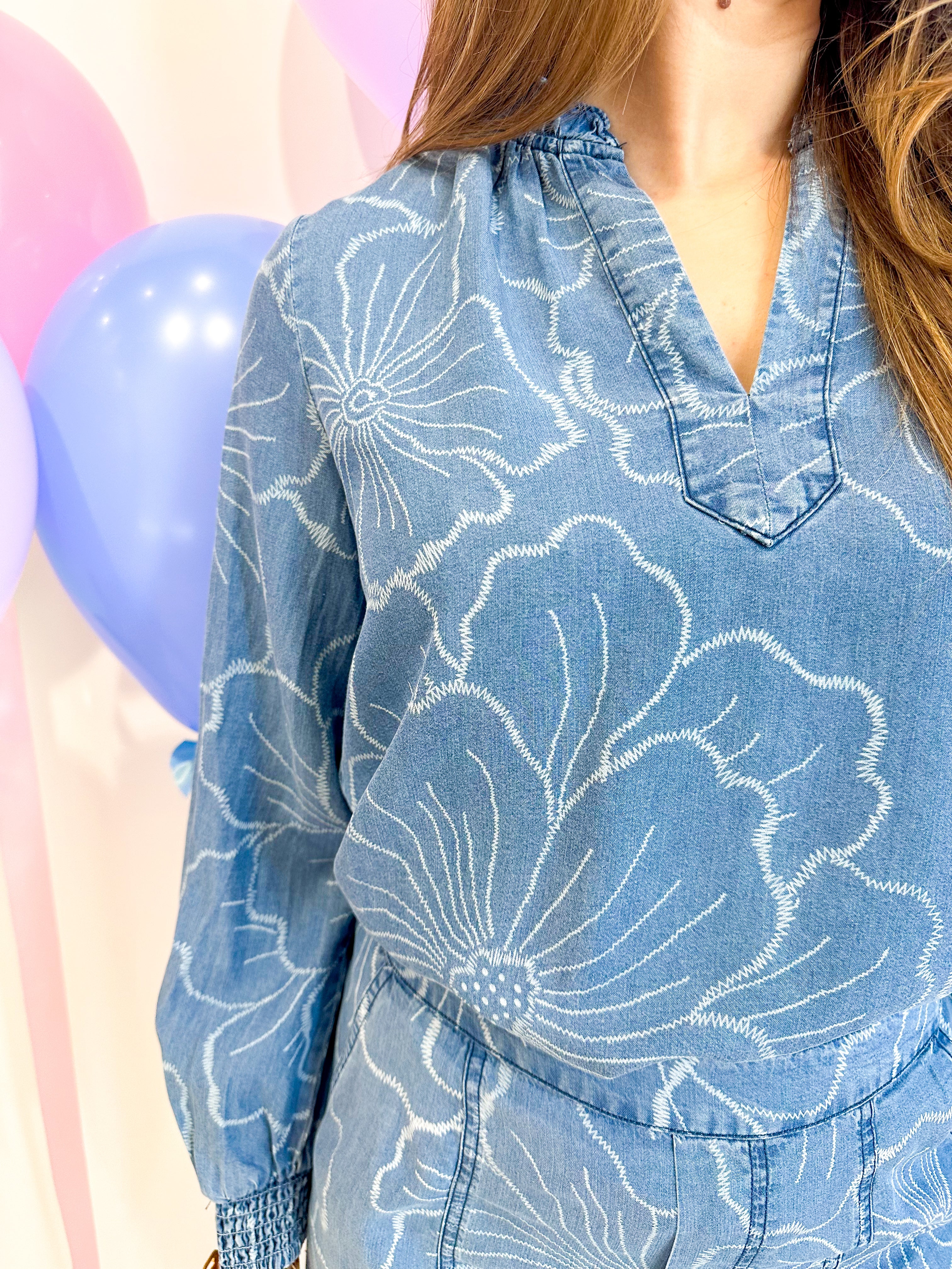 Effortlessly charming, this floral chambray blouse brings soft elegance to your everyday wardrobe. The ruffled v-neckline adds a delicate touch, while long sleeves with smocked cuffs provide polished detail. Cut in a relaxed fit that moves with you, it's the perfect piece for layering or wearing solo. Versatile enough for casual days and put-together enough for the office.