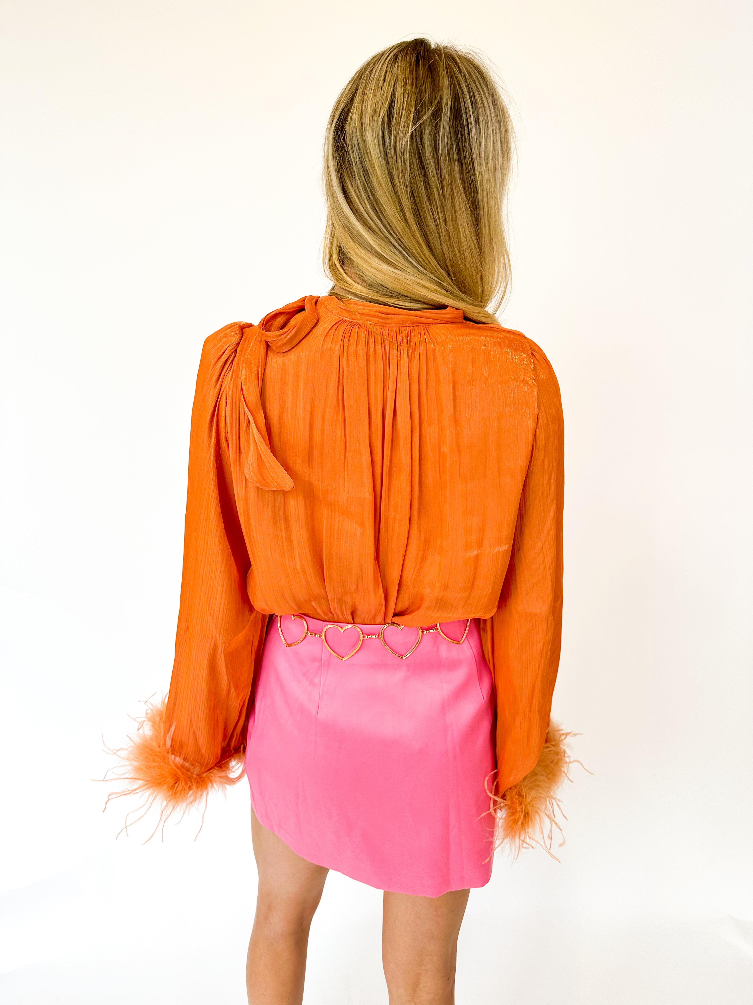 Elevate your look with this show-stopping blouse featuring a chic bow tie neckline and shimmering metallic details. The feather hem adds a touch of whimsy and movement, making it perfect for nights out or special occasions. Playful, polished, and undeniably fabulous.