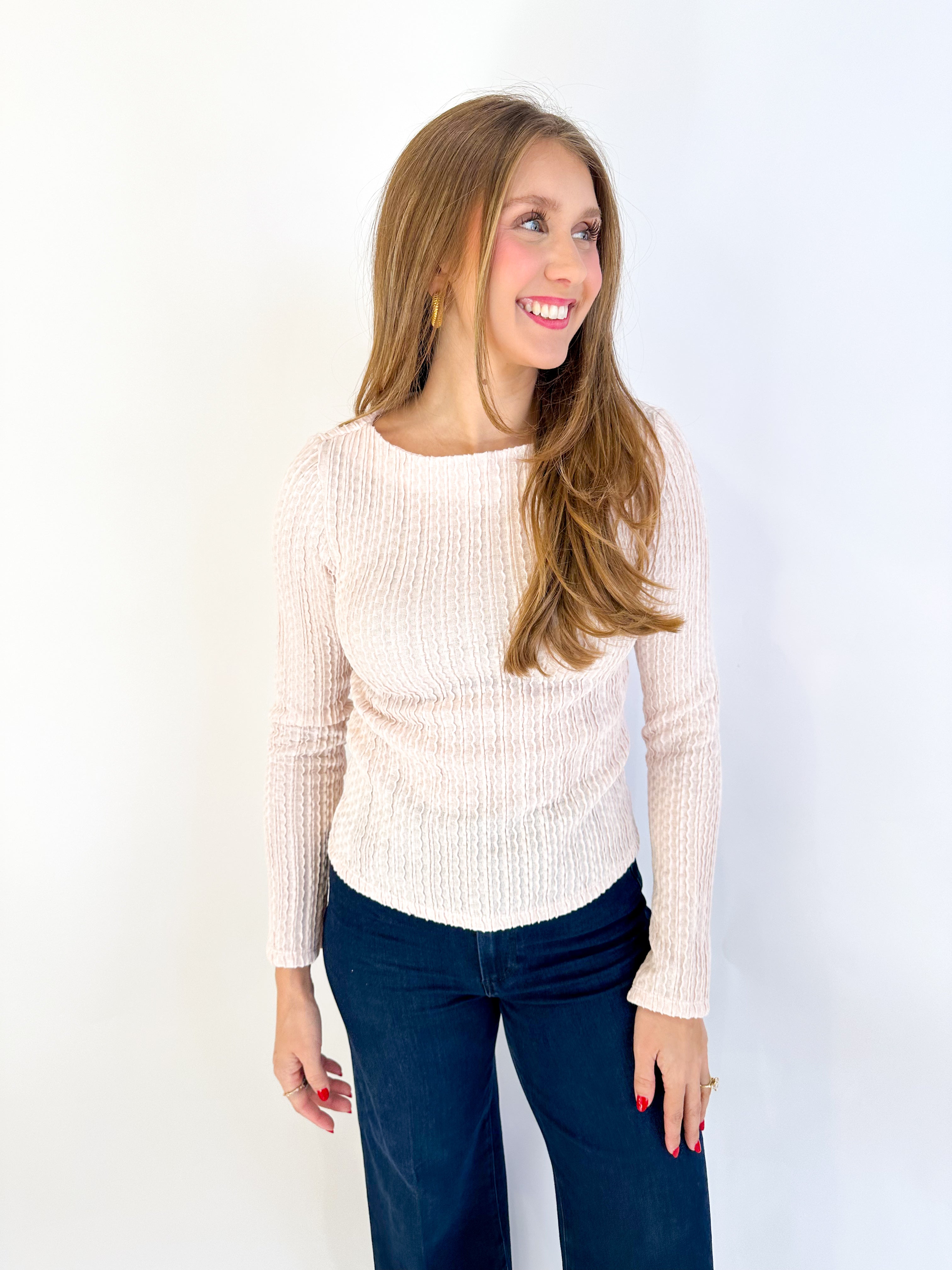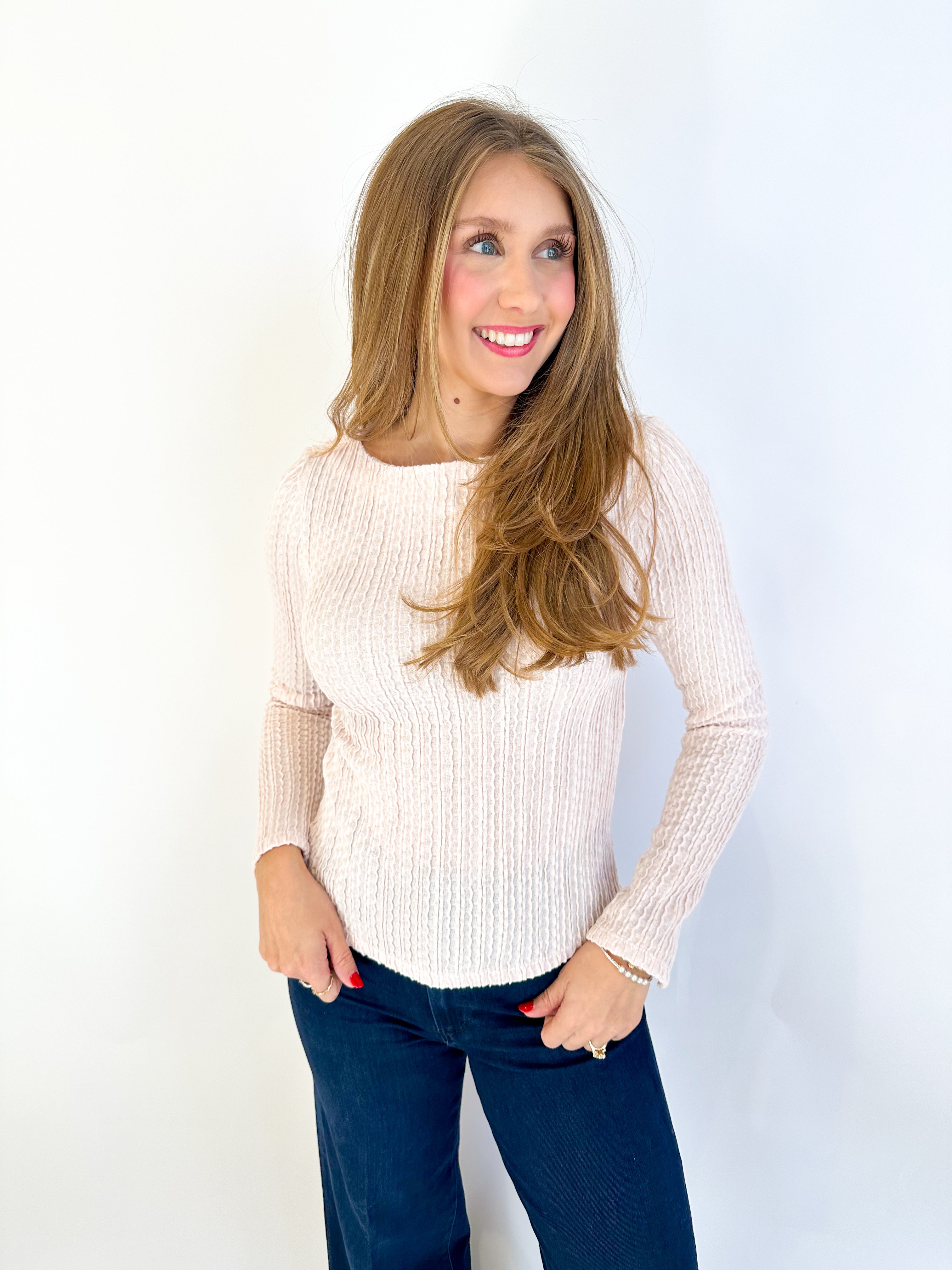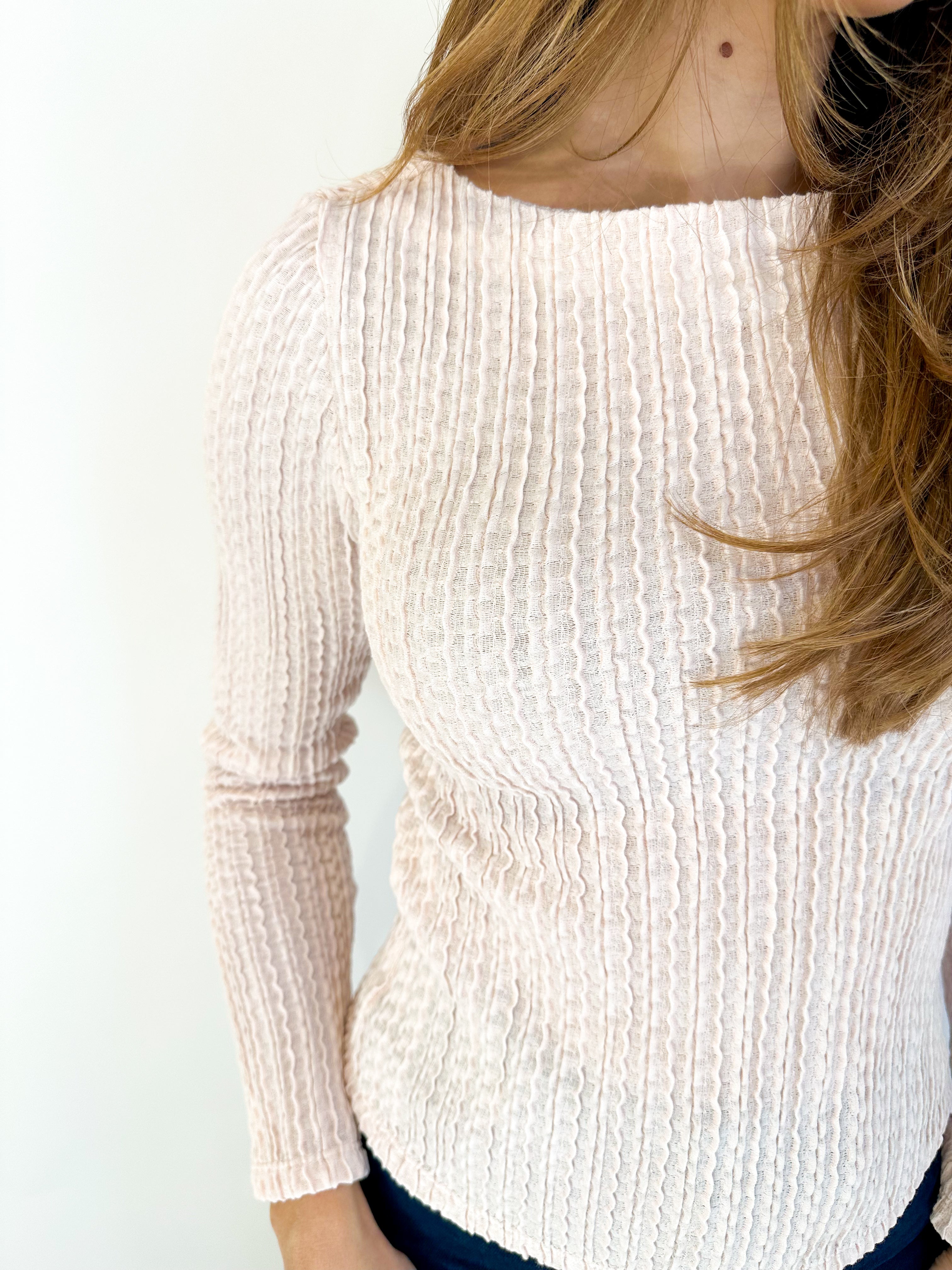 Introducing the Boatneck Textured Top—your new wardrobe essential that bridges seasons with effortless sophistication. This light pink long sleeve features a classic boatneck neckline and subtle texture that elevates any casual outfit. Versatile enough to layer under blazers or wear solo, it's the refined basic you'll reach for again and again as you transition from winter into spring. Timeless style meets modern comfort.