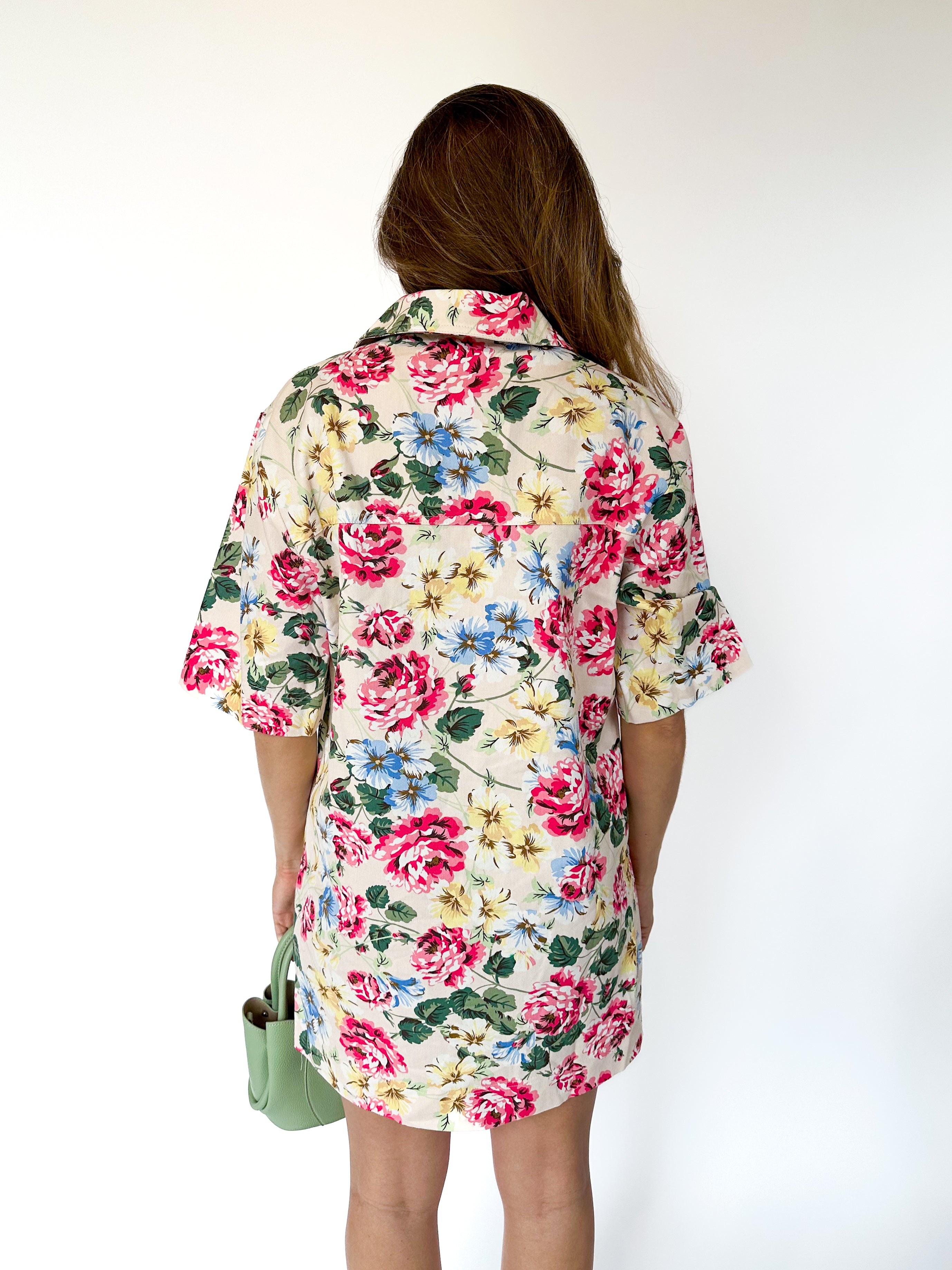 Our Lyla Floral Collard Dress features a soft open V neck with a relaxed pointed collar and easy slip on style with a boxy shift silhouette that drapes loosely on the body.