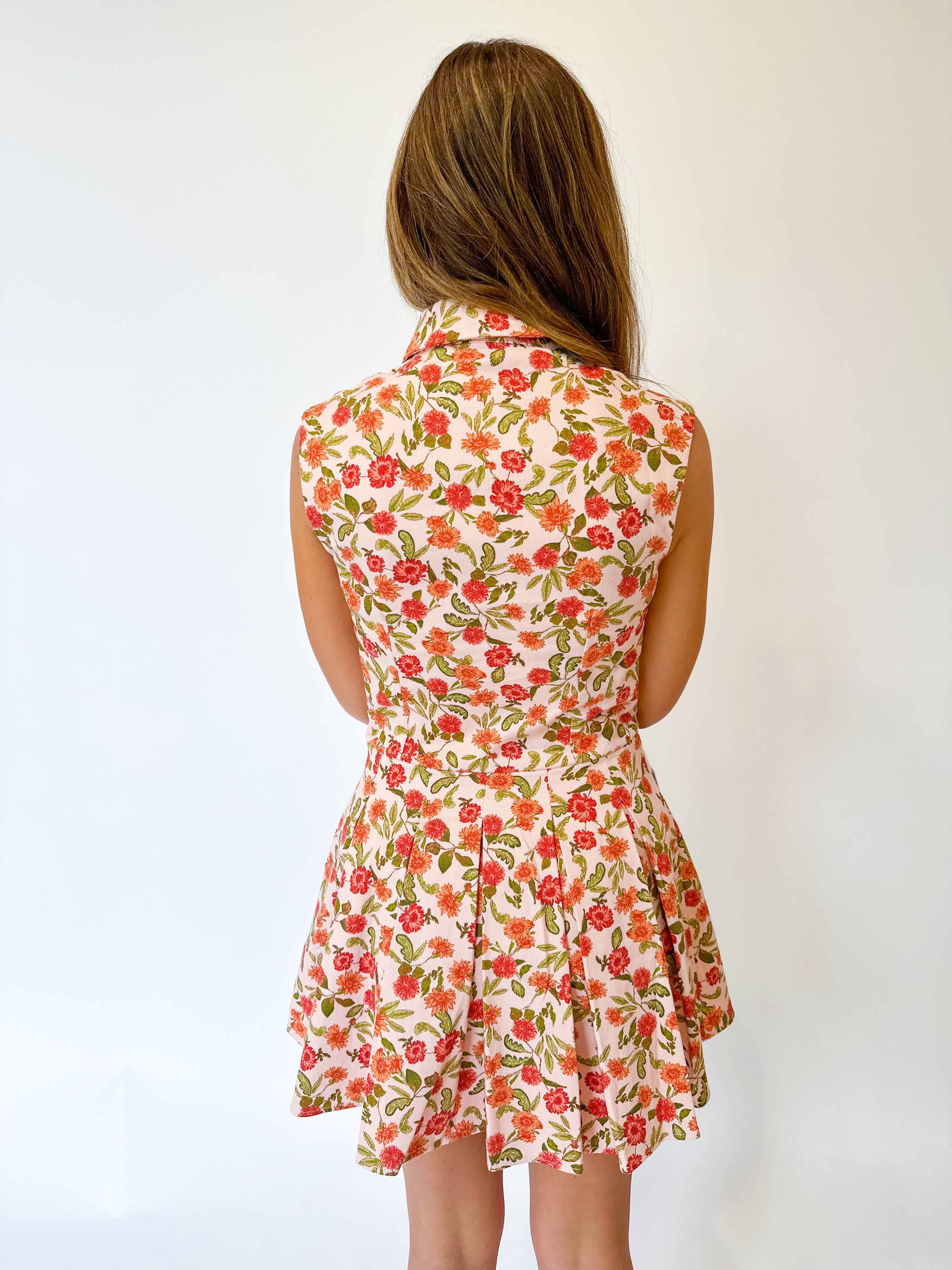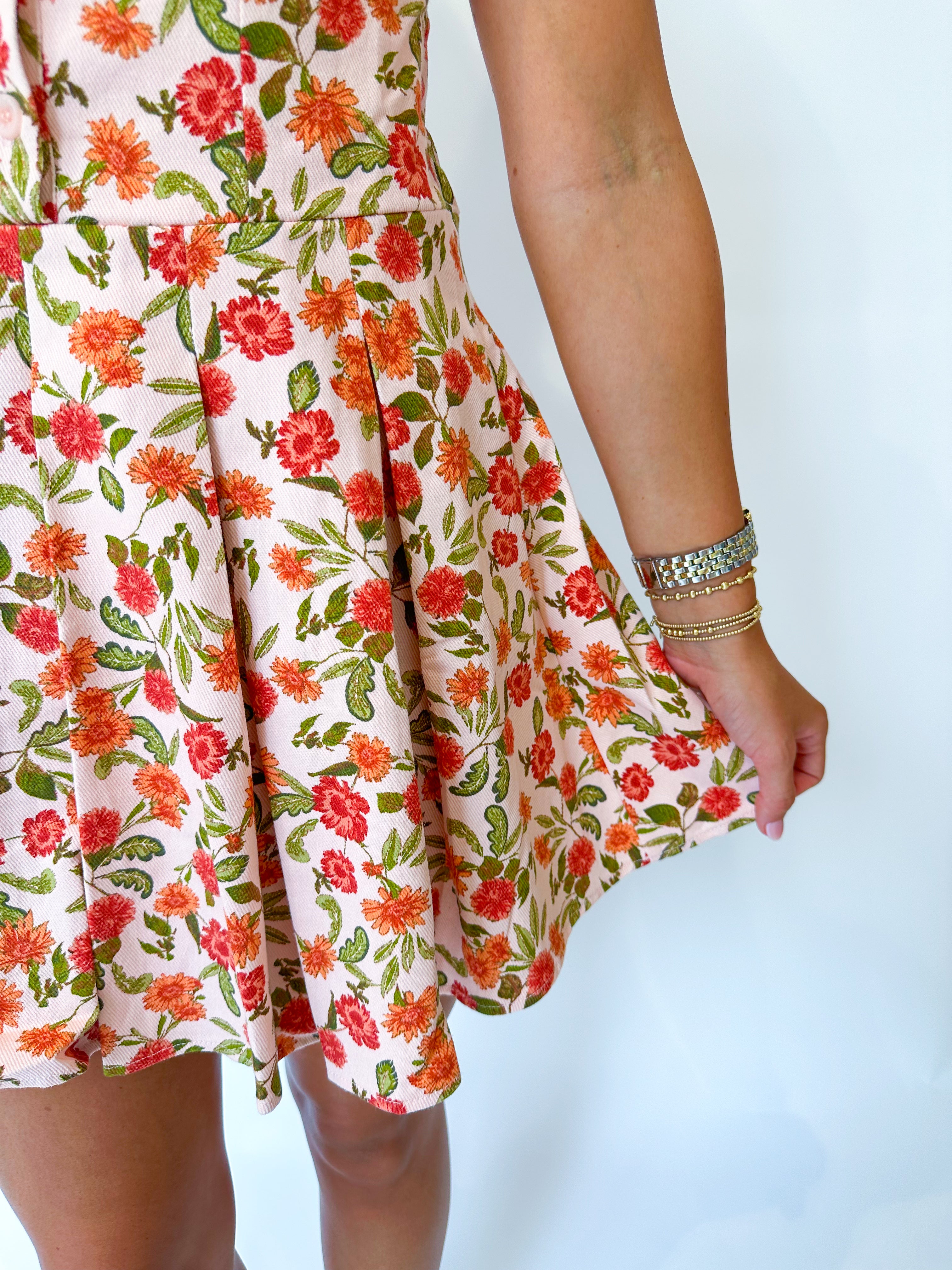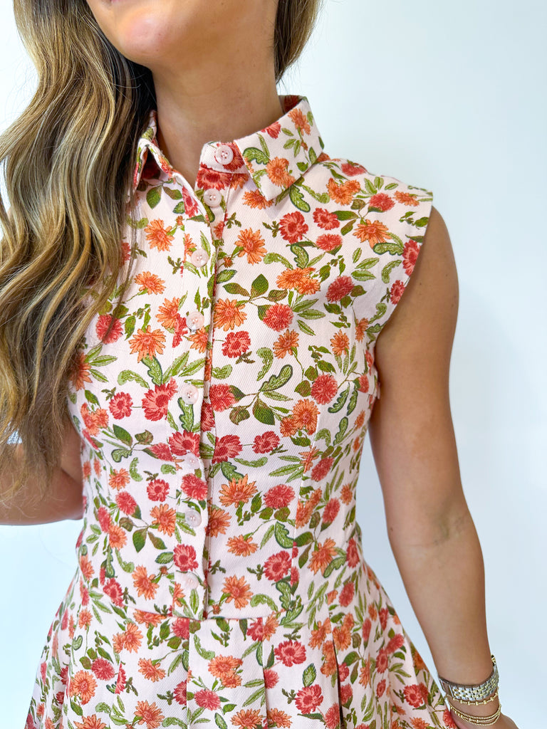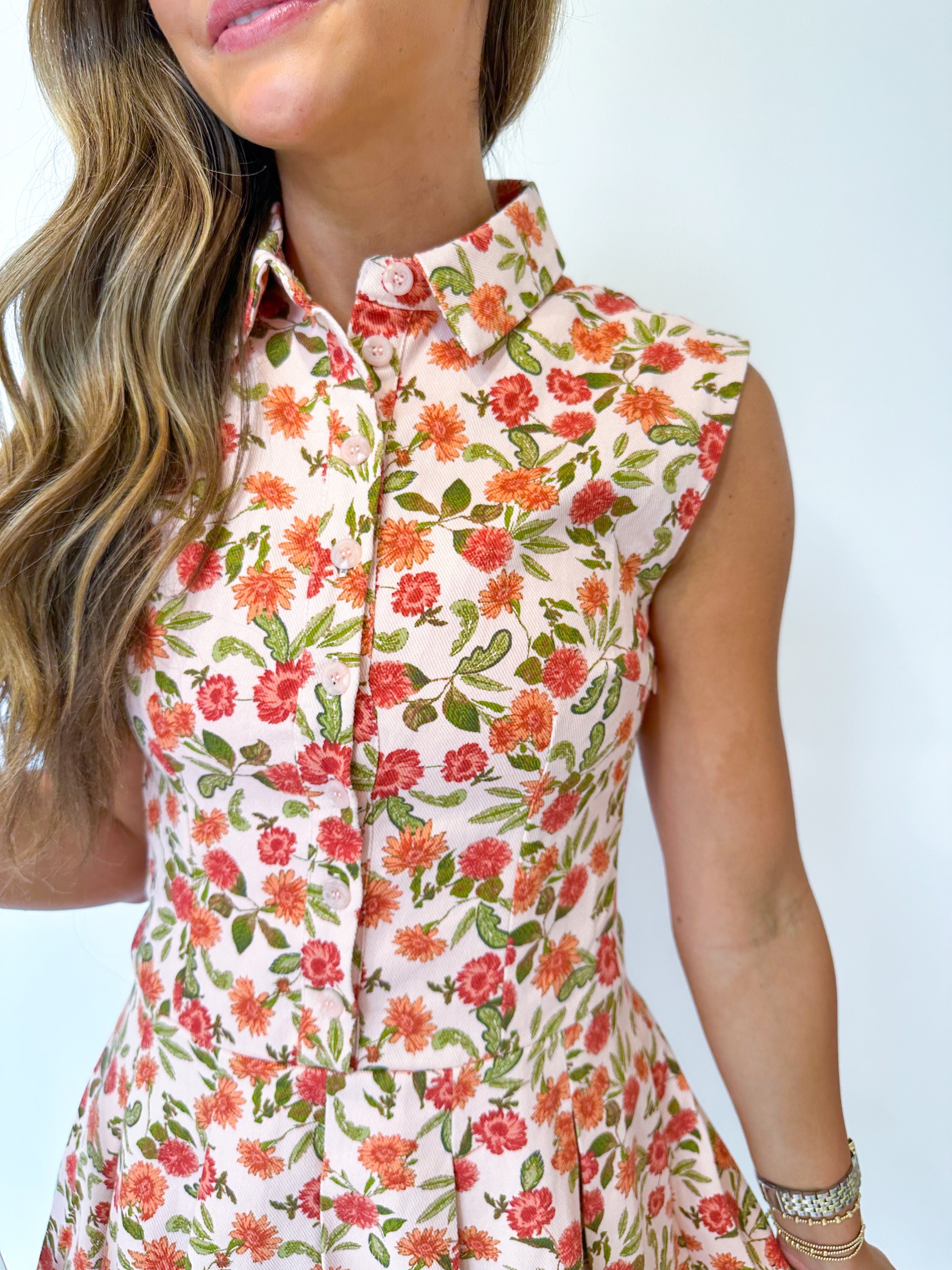 The Marley Floral Dress features a button-front design and a sleeveless cut, perfect for layering or wearing on its own. Its pleated skirt adds a touch of movement and charm, while the fall floral pattern makes it a versatile choice for any season. Easy to style with sneakers for a casual look or boots for a chic edge, this mini dress effortlessly blends comfort and style for day-to-night wear.
