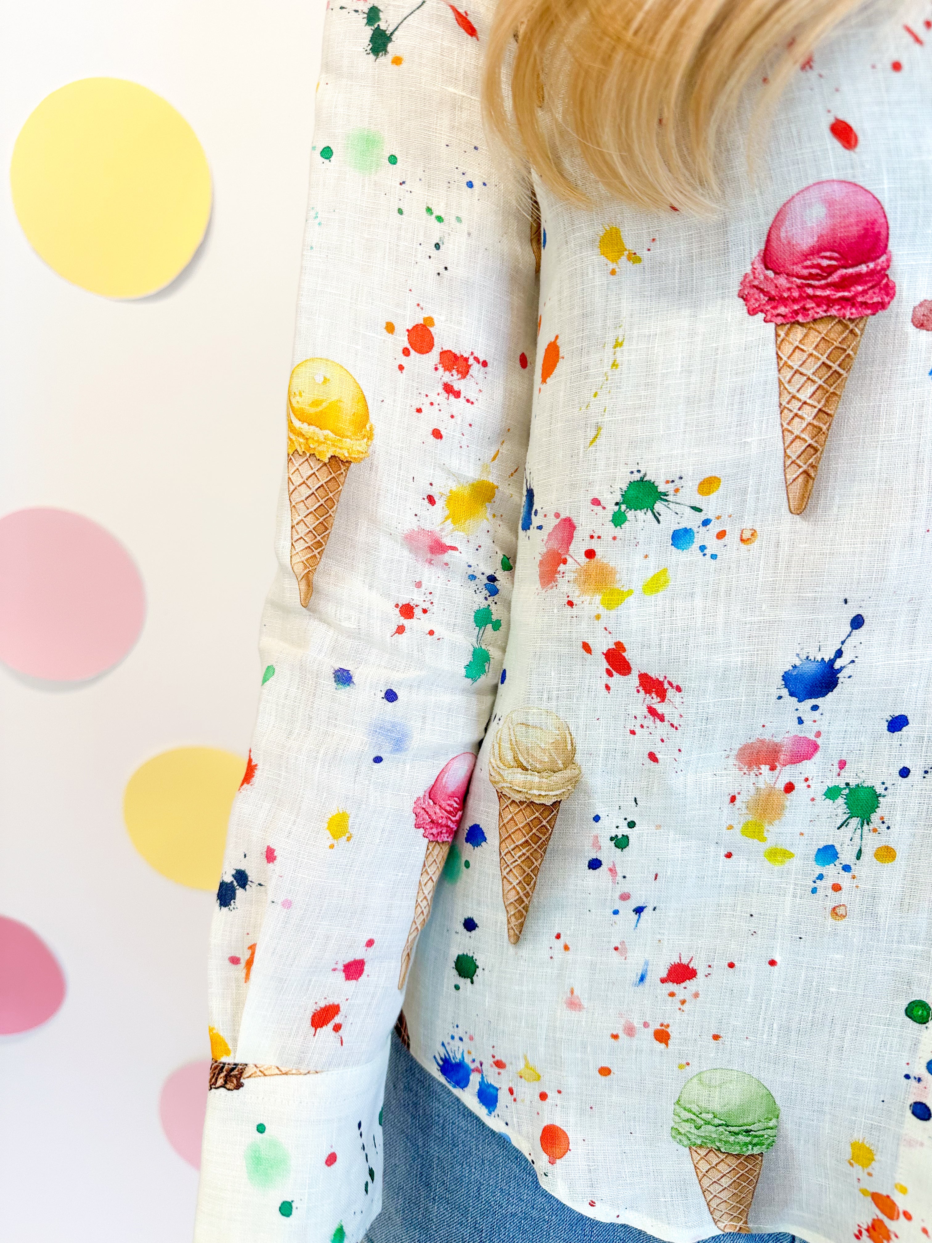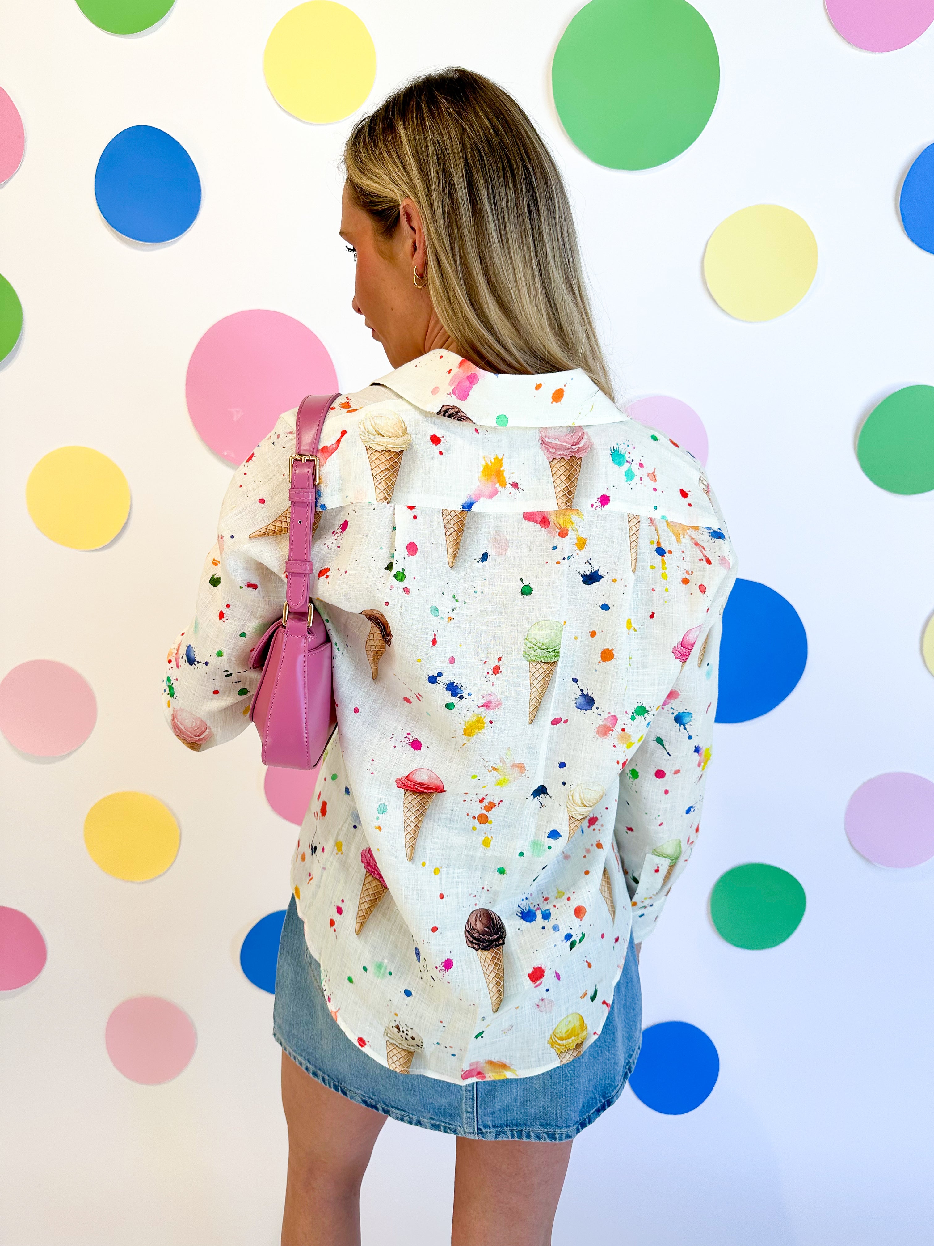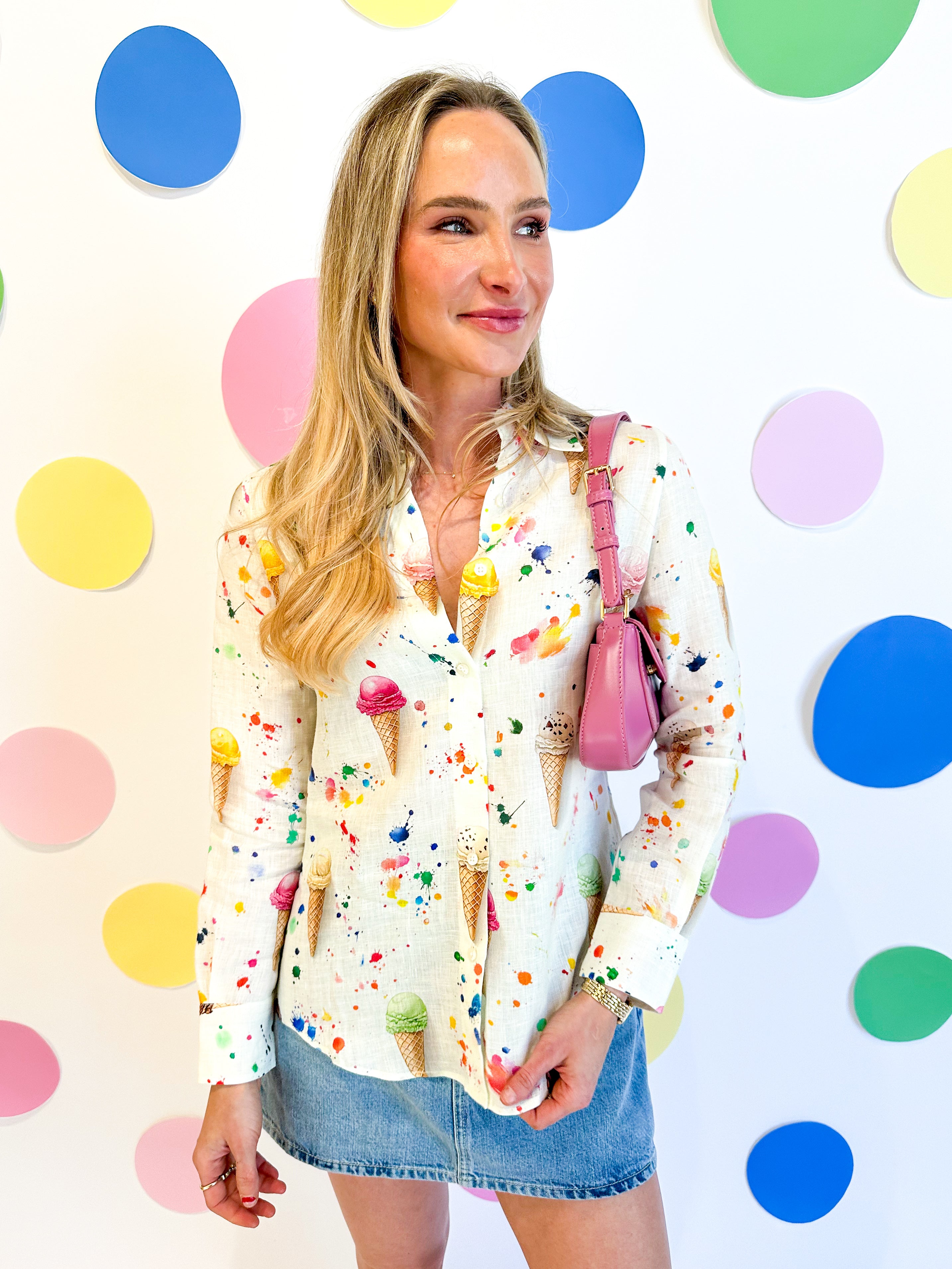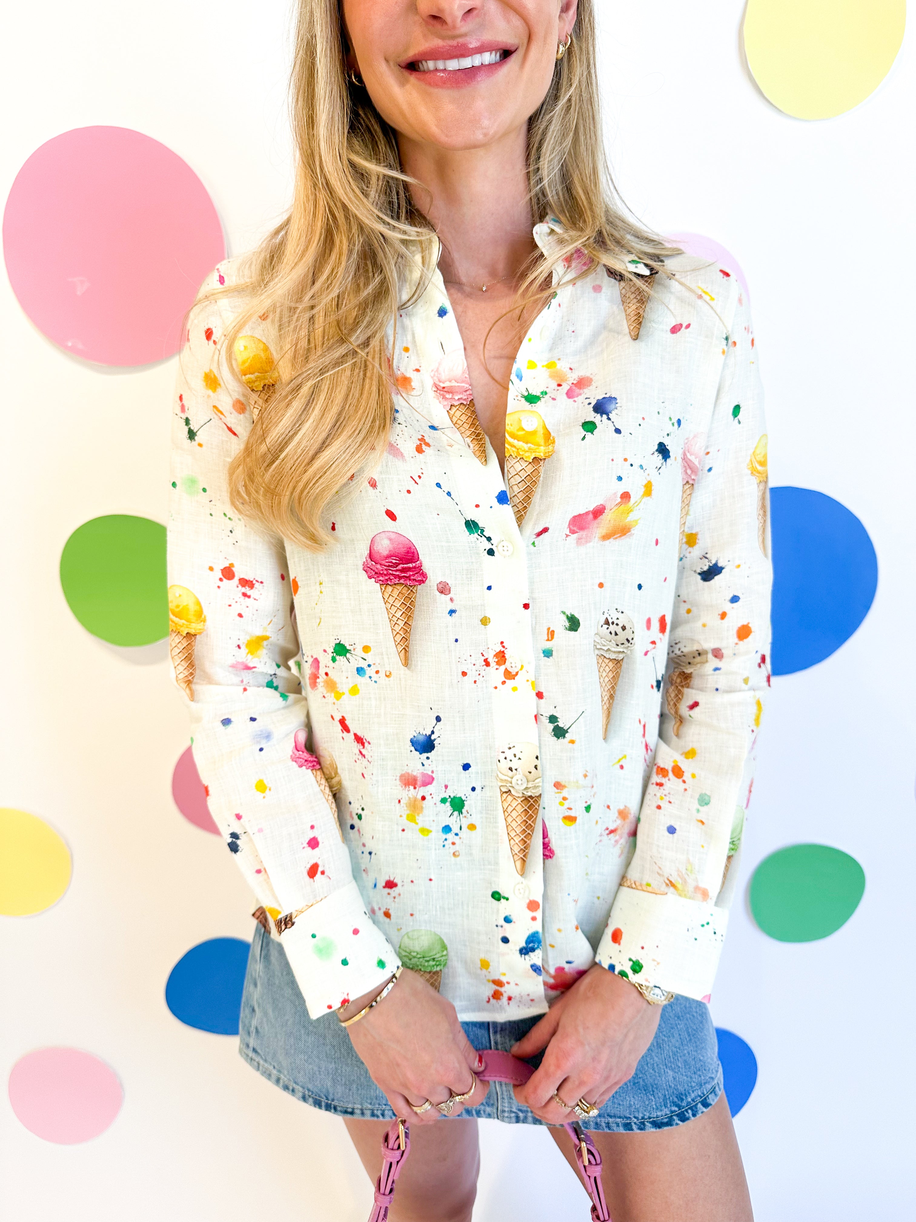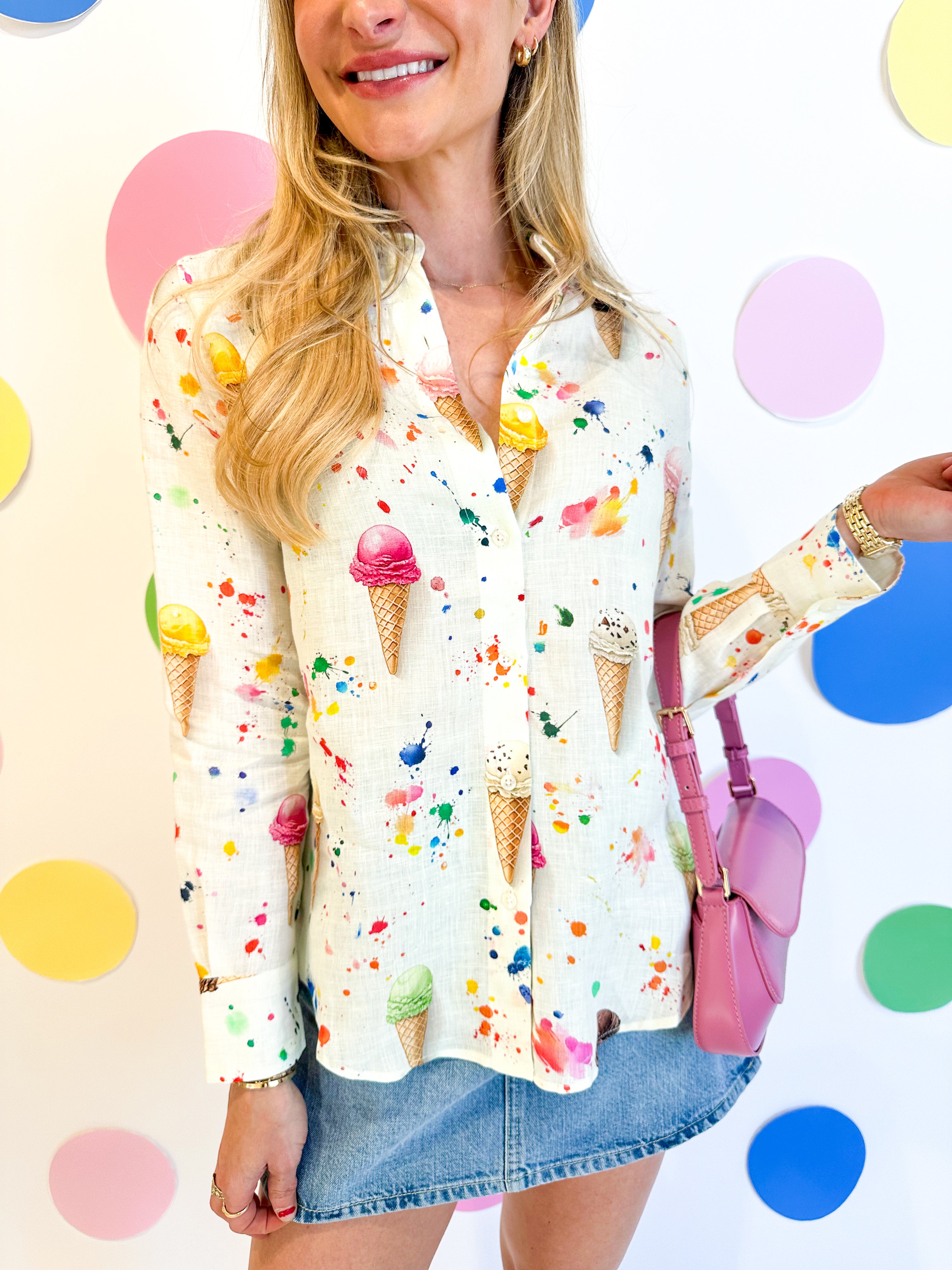 Scoop up style with this playful ivory button-down featuring a whimsical all-over print of ice cream cones and colorful paint splatters. Perfect for adding a fun, artistic touch to your everyday wardrobe, this piece combines classic tailoring with creative flair. The crisp ivory base keeps the bold print balanced and wearable, making it ideal for casual outings or dressed-up occasions. A statement piece that celebrates individuality and joy.