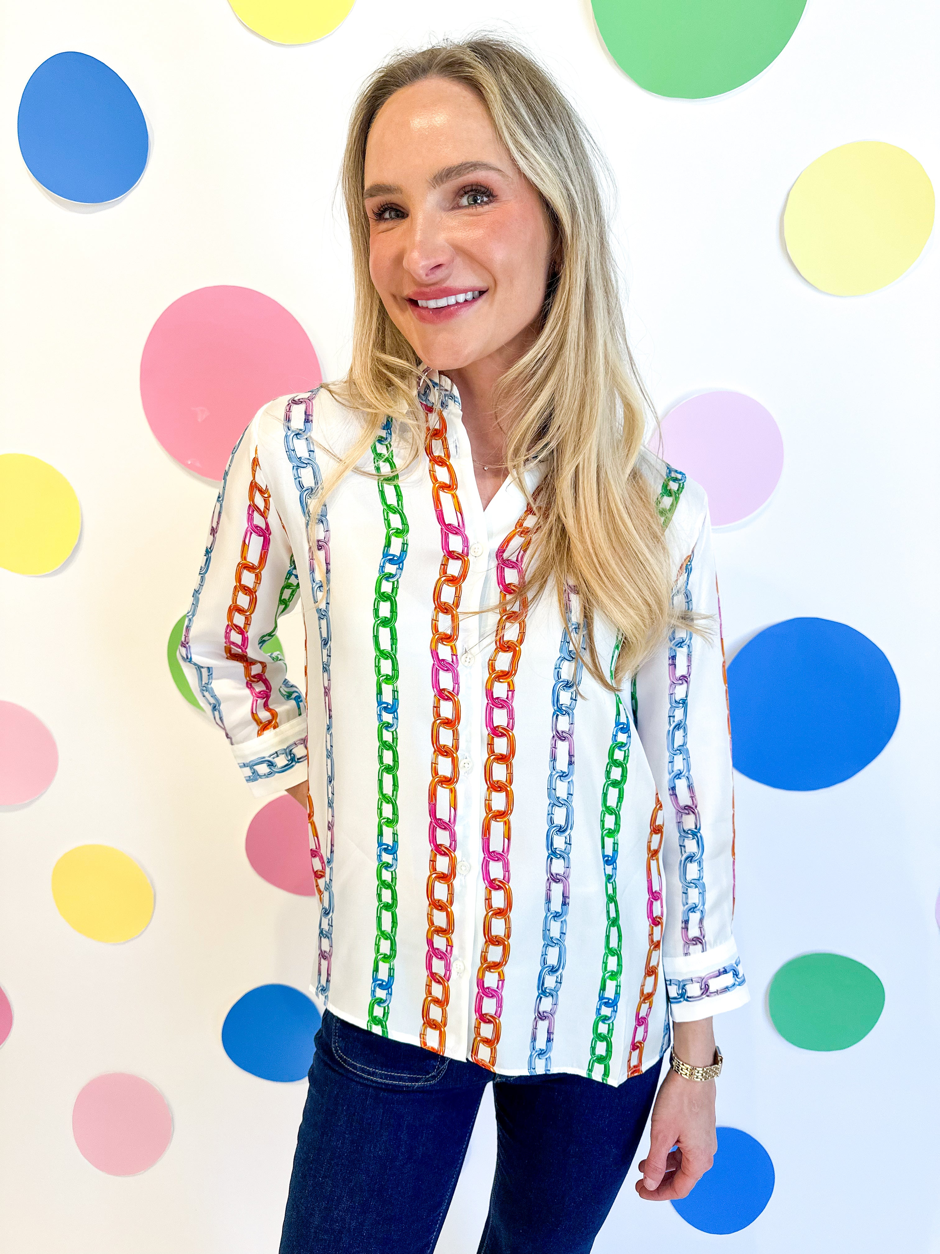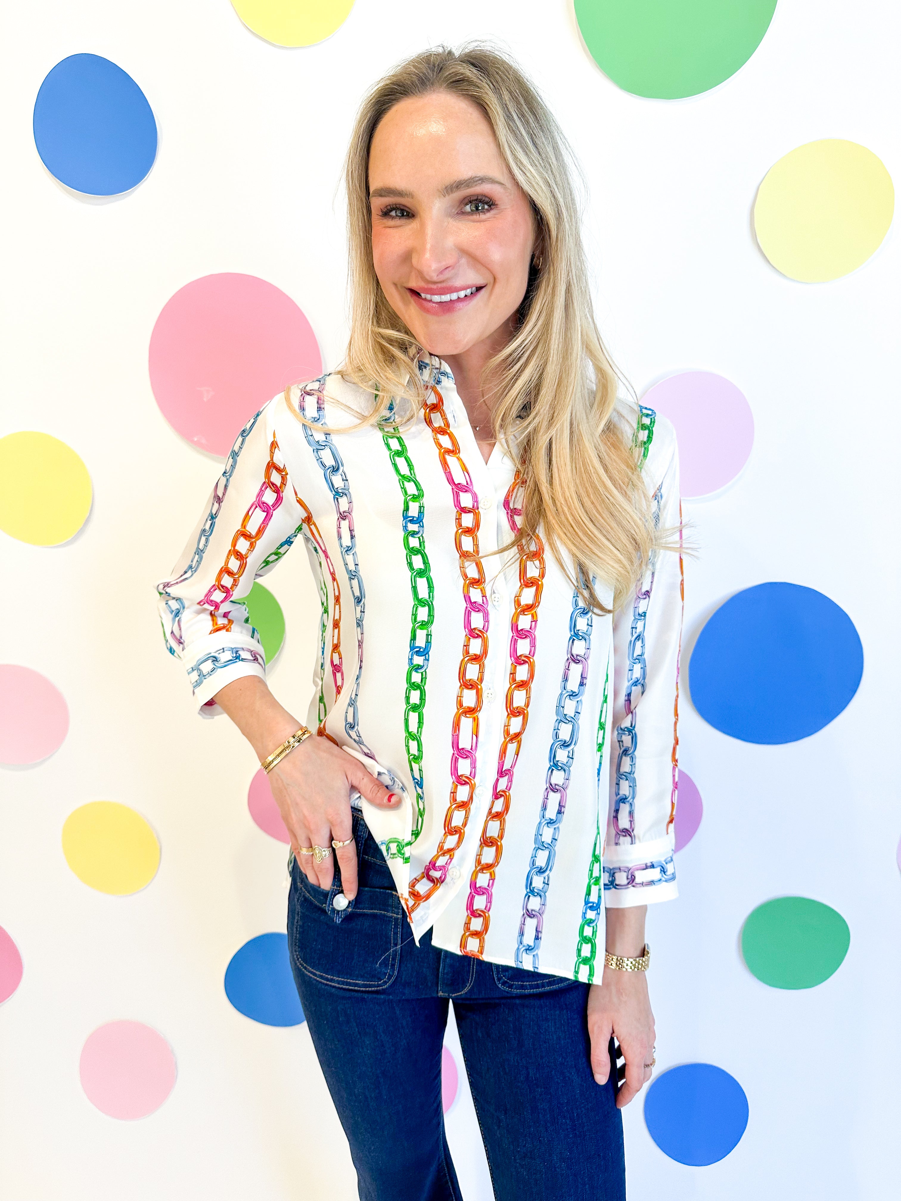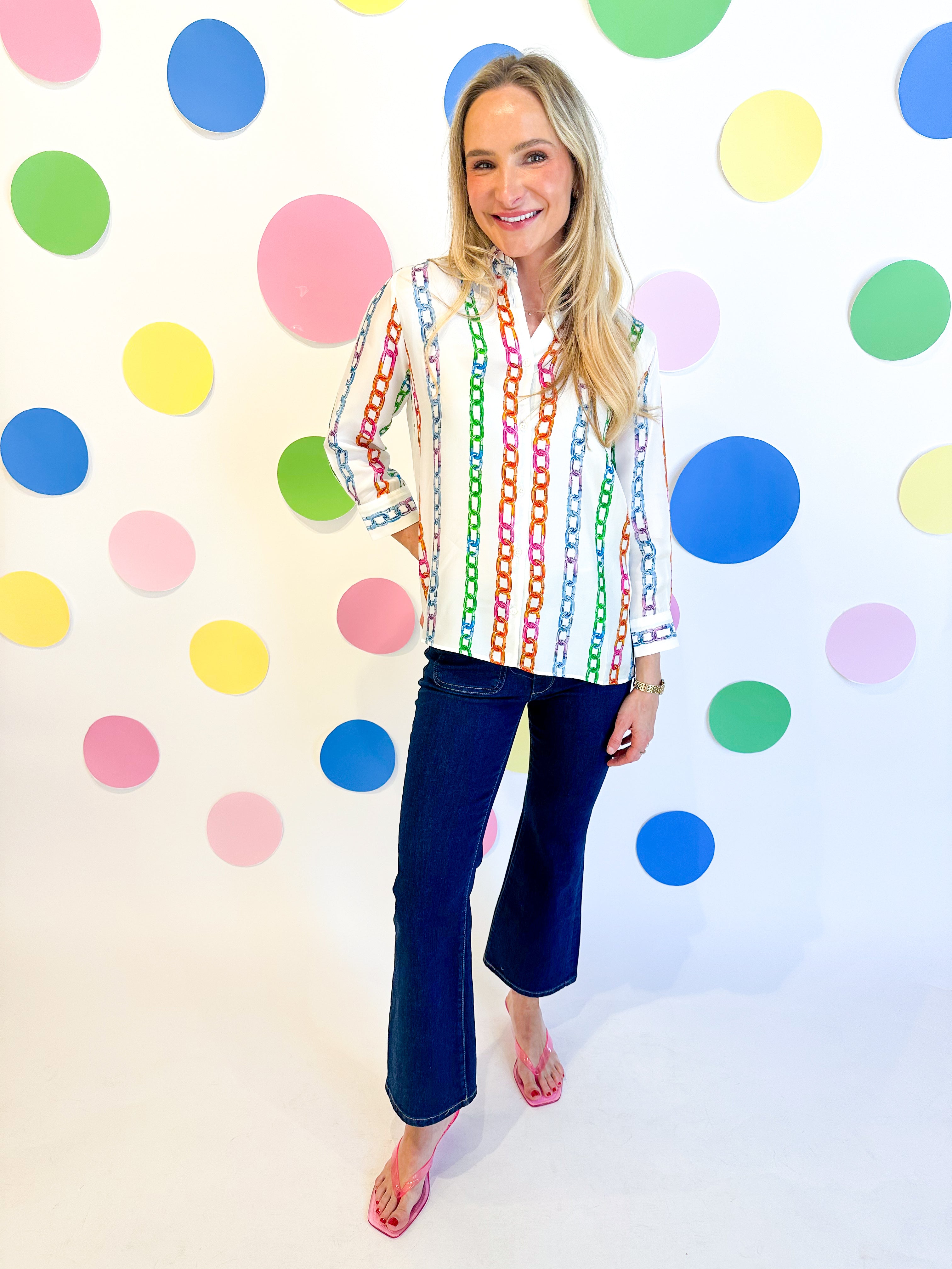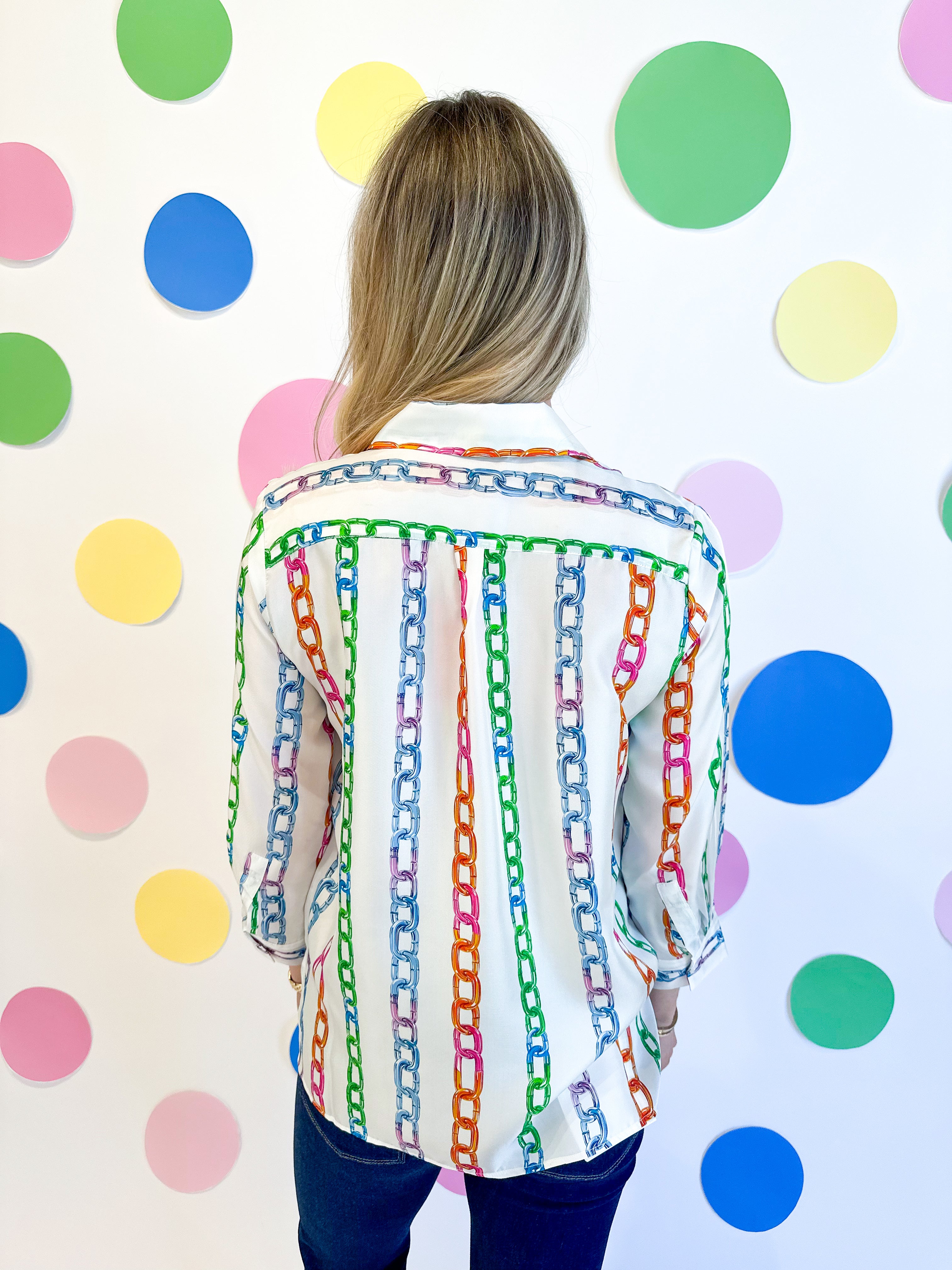Elevate your wardrobe with the Seda Chainlink Print Top, a sophisticated satin blouse featuring a timeless button-front design. The entire garment showcases a striking multi-color chainlink print that adds visual interest and versatility to your styling options. Crafted from luxurious satin fabric, this long-sleeve top drapes beautifully and transitions seamlessly from office to evening wear. Perfect for layering or wearing solo, it's a wardrobe essential that combines elegance with contemporary flair.