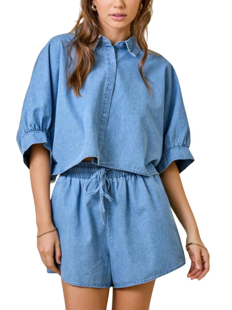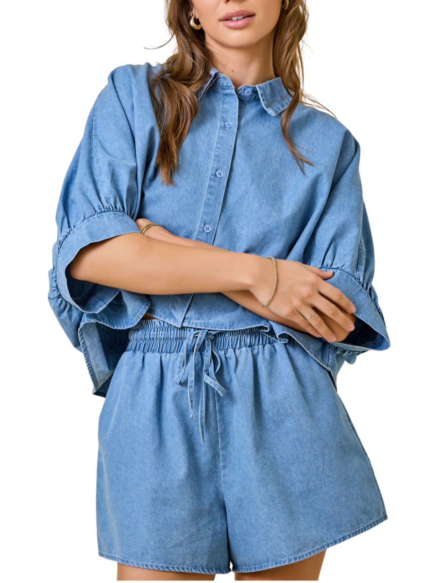 Effortless style meets comfort in this oversized denim button-down. The cropped silhouette flatters every frame while the relaxed fit keeps you cool and casual. Pair it with our matching shorts to create an instantly put-together look that takes you from errands to evening without missing a beat.