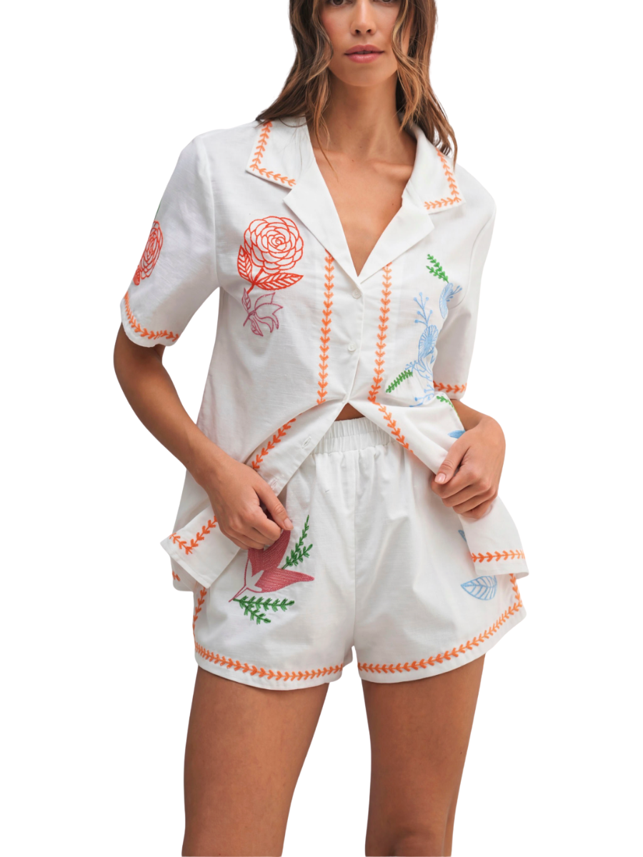 Embroidered Button Shirt Top And Shorts Set