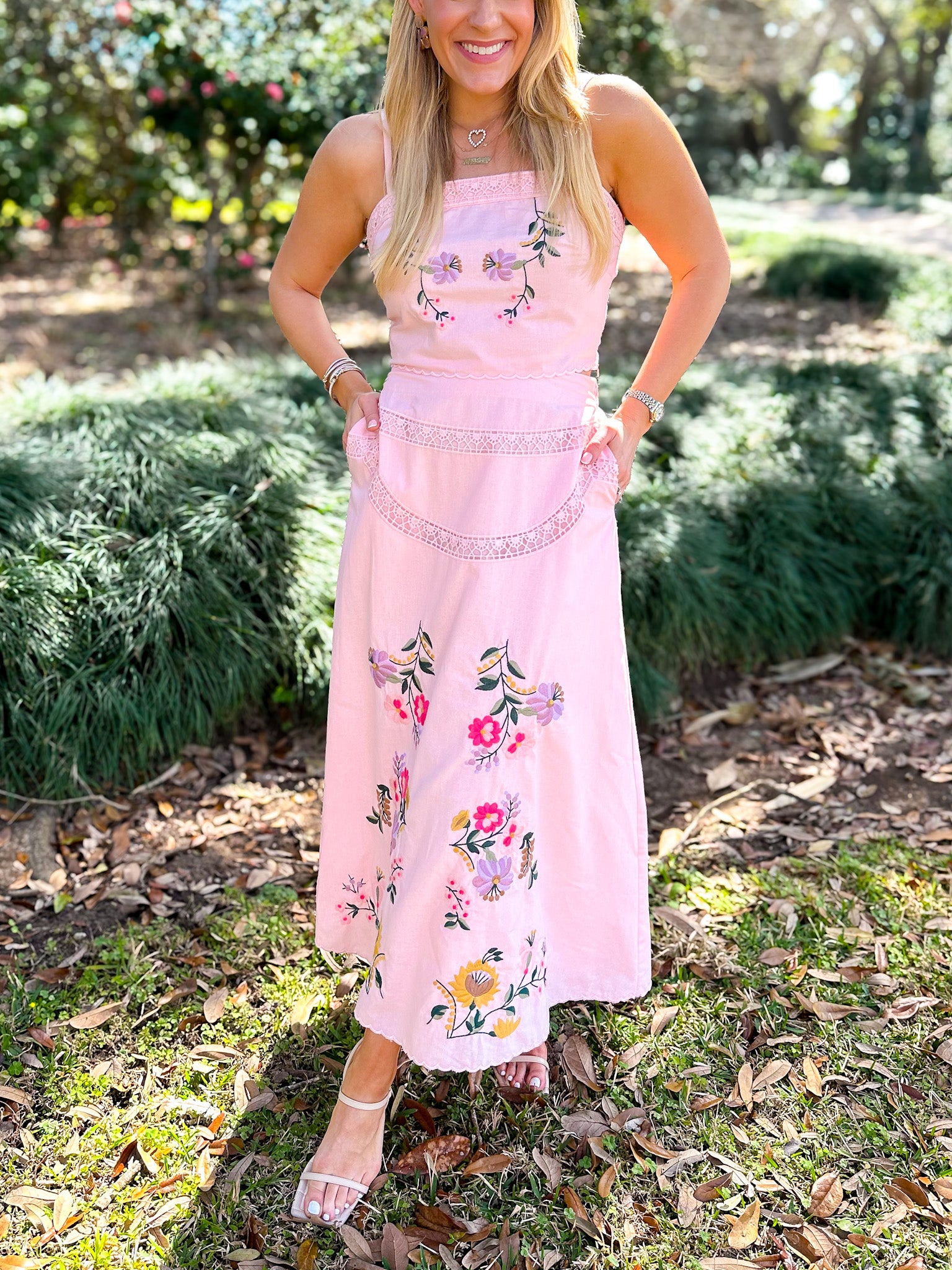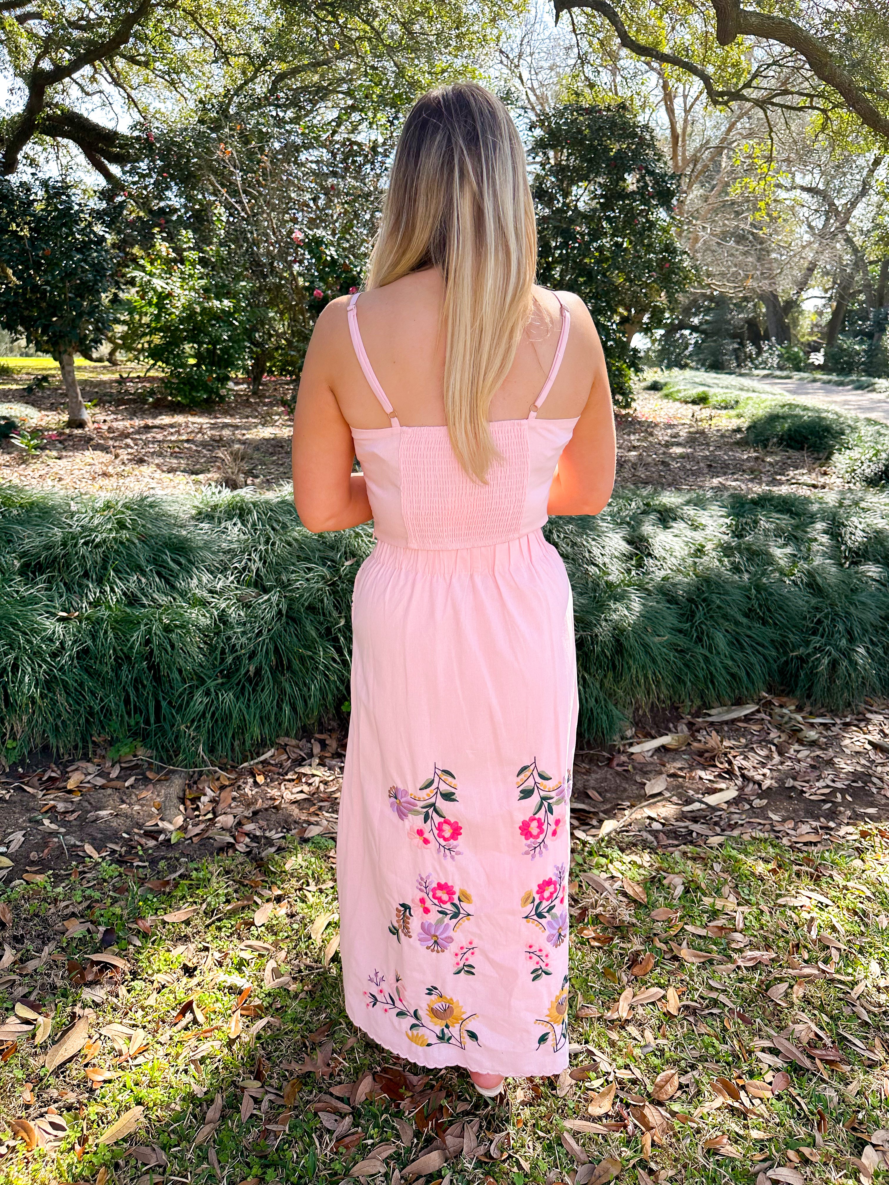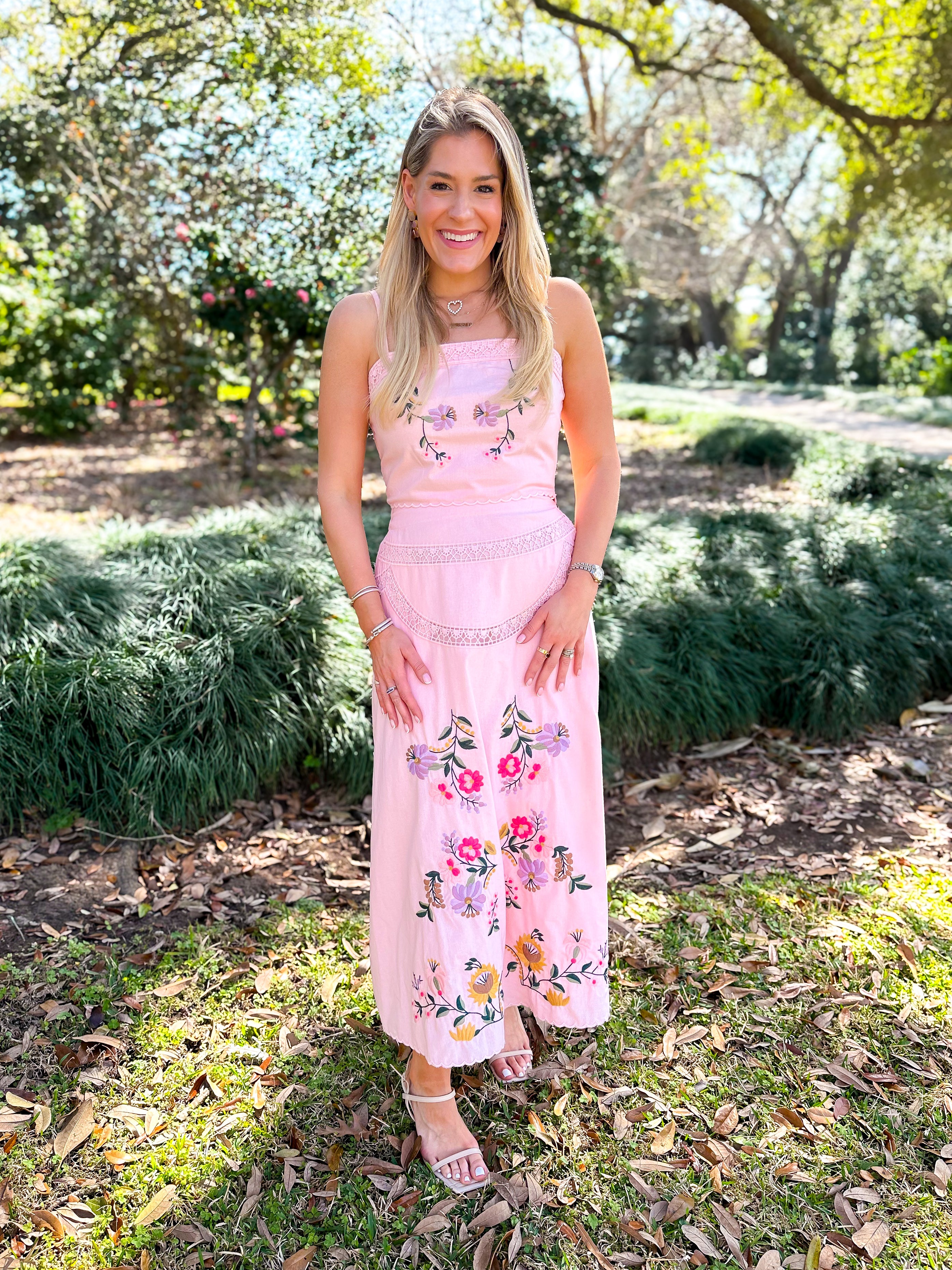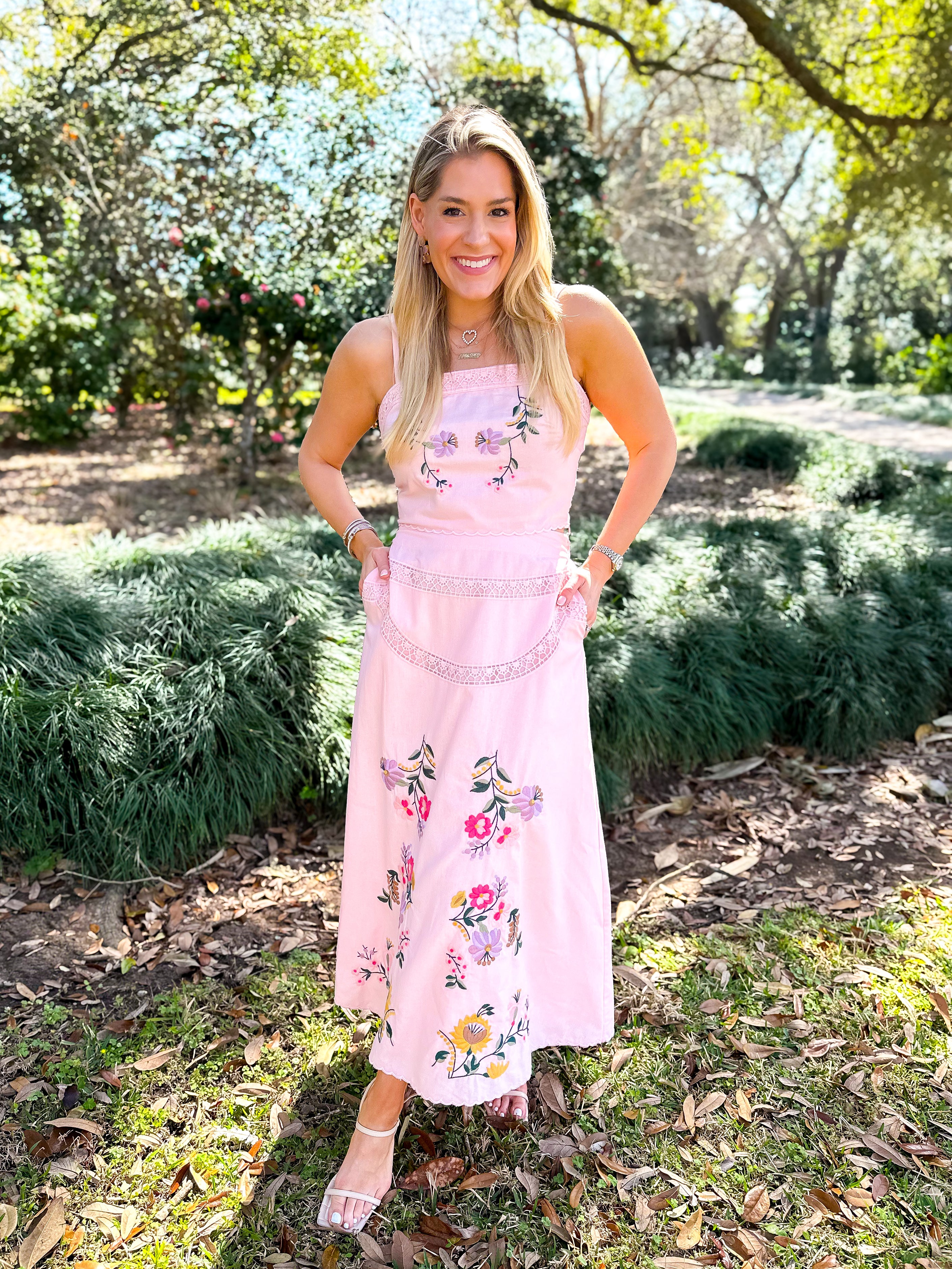 Elevate your wardrobe with this stunning two-piece set featuring intricate multi-color floral embroidery and delicate crochet lace details throughout. The sleeveless crop top showcases adjustable straps, elastic smocking at the back, and a scalloped embroidered hem, while the A-line midi skirt offers practical side pockets and a comfortable elastic waist. Pairs effortlessly with your favorite wedges for the perfect Spring look.