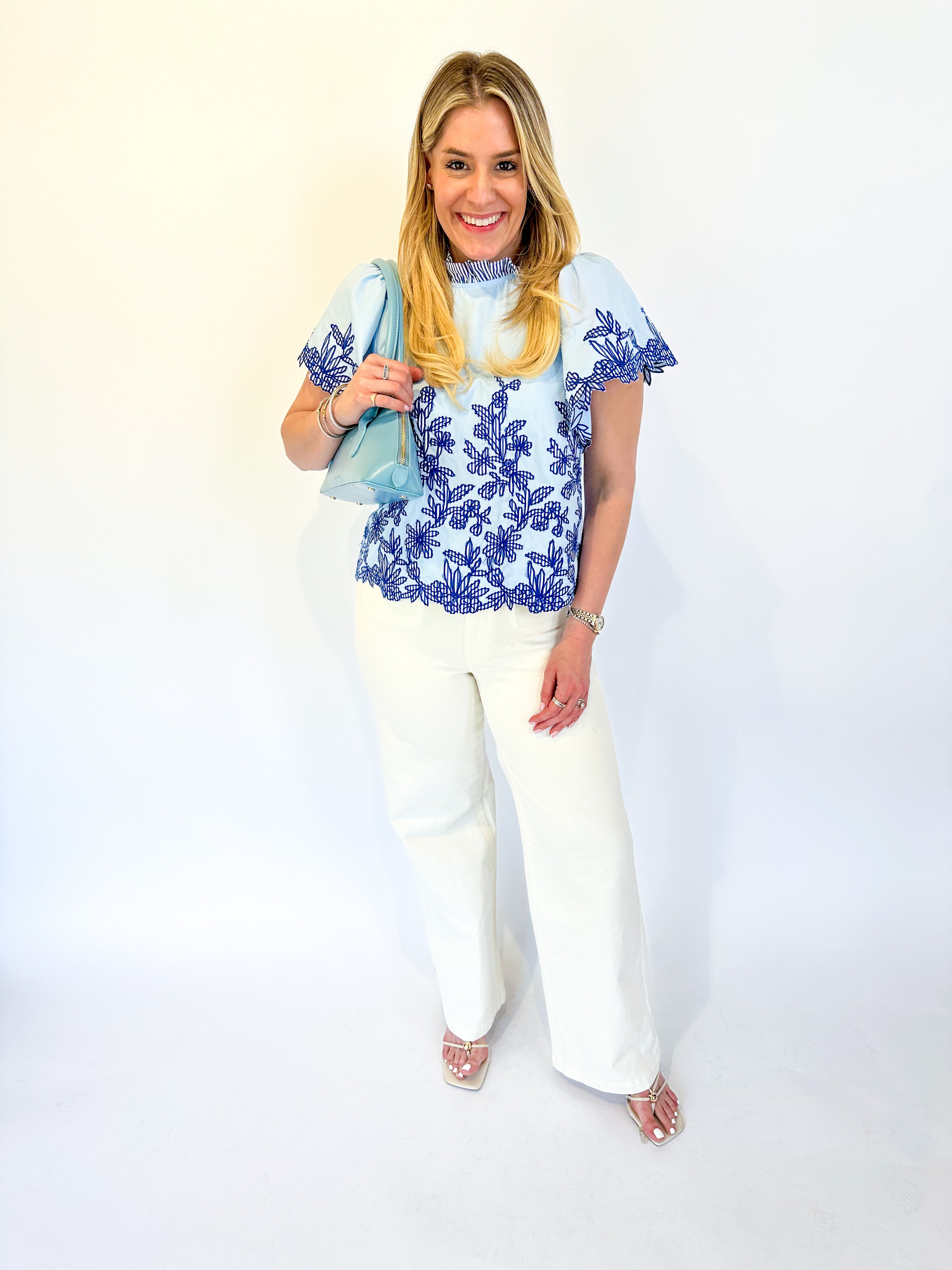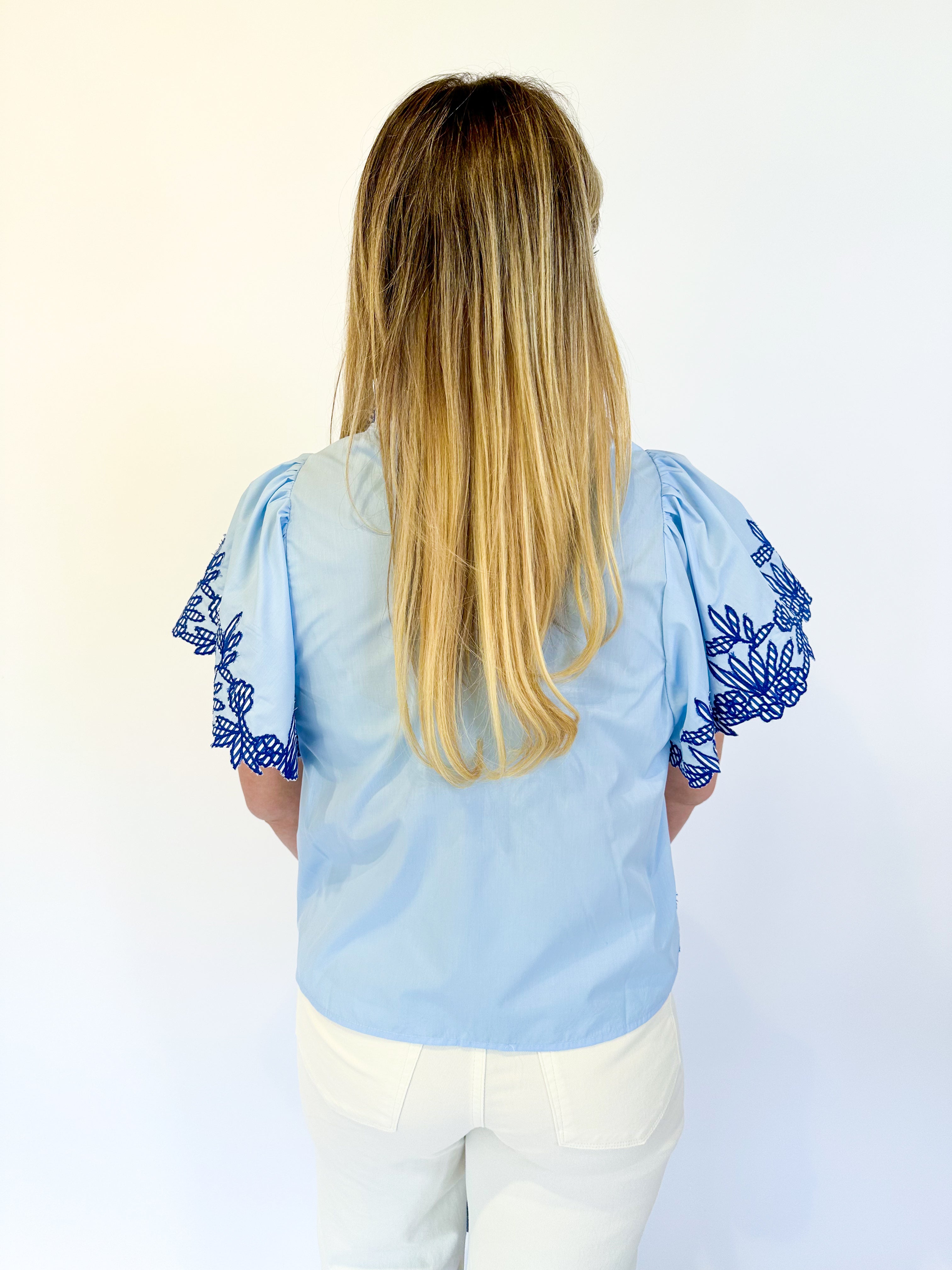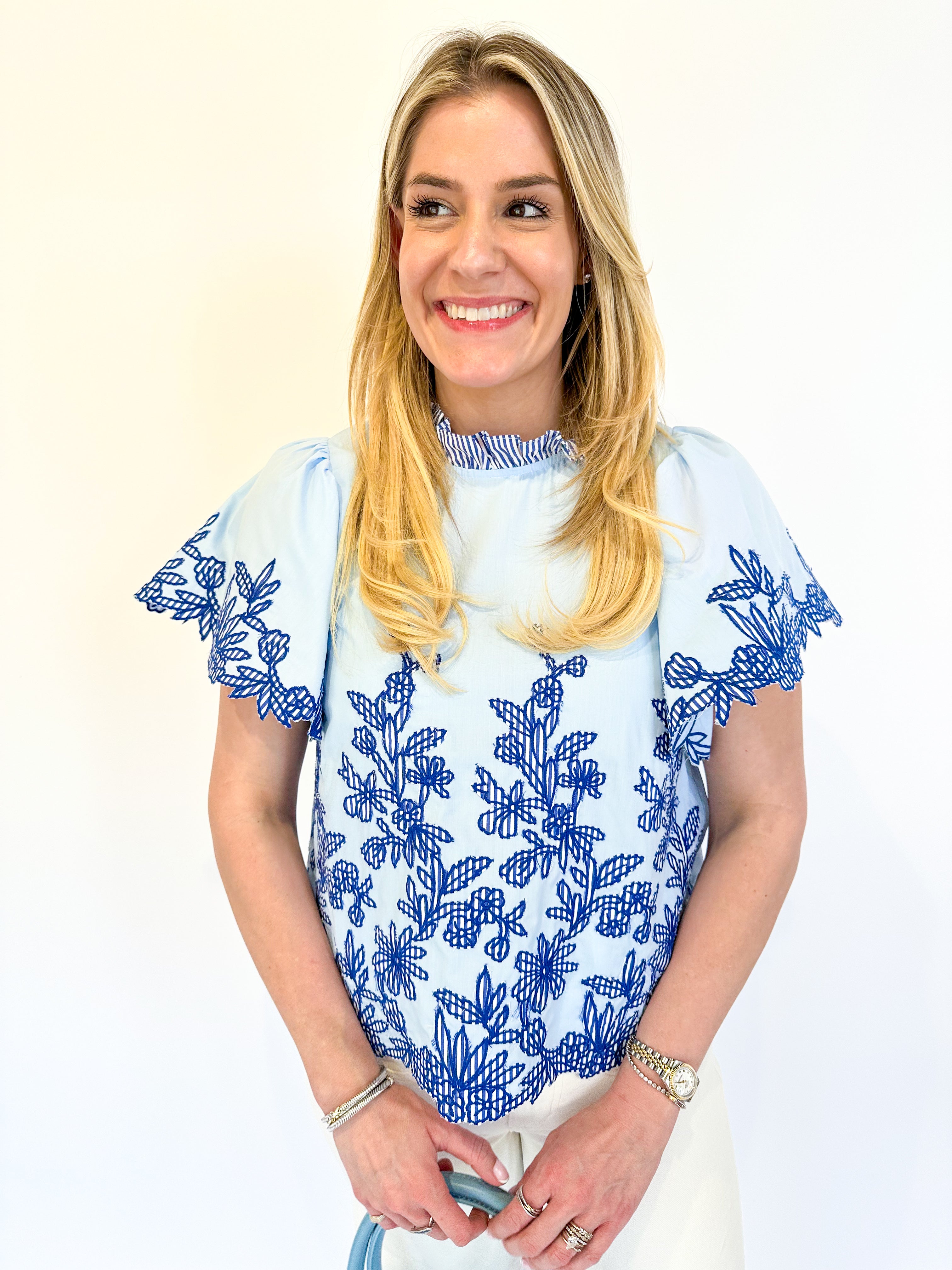 Elevate your everyday wardrobe with this charming short sleeve top crafted from crisp poplin. A delicate ruffle neckline frames the face beautifully, while intricate embroidered florals cascade from the mid-bodice to hem, adding sophisticated detail without sacrificing comfort. Available in versatile tan and blue, this piece transitions effortlessly from casual to polished—the elevated staple you've been searching for.