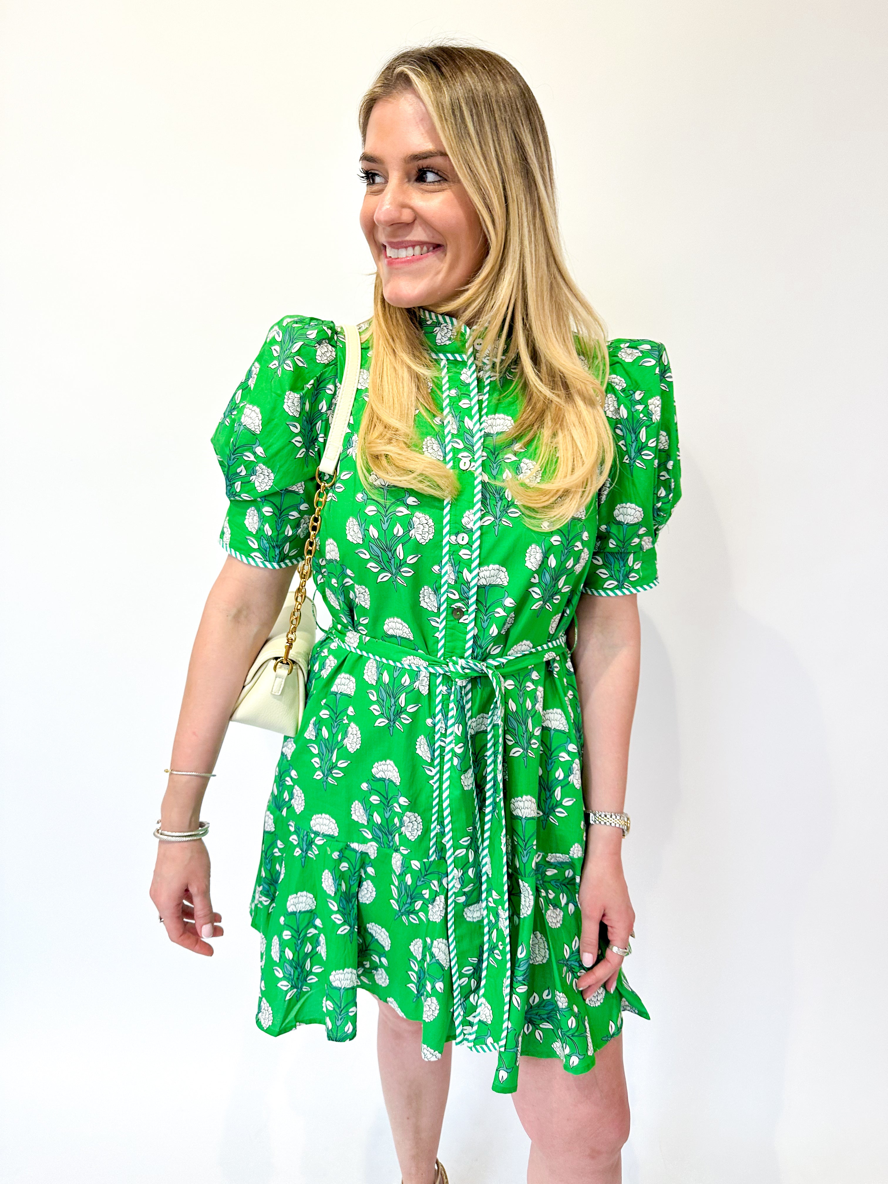 Elevate your wardrobe with this charming floral mini dress featuring romantic puff sleeves and a flattering self-tie belt that cinches at the waist. Functional front buttons make dressing effortless, while crisp green and white stripe piping adds a polished finishing touch. Perfect for brunch dates, garden parties, or any occasion calling for feminine style with an edge.