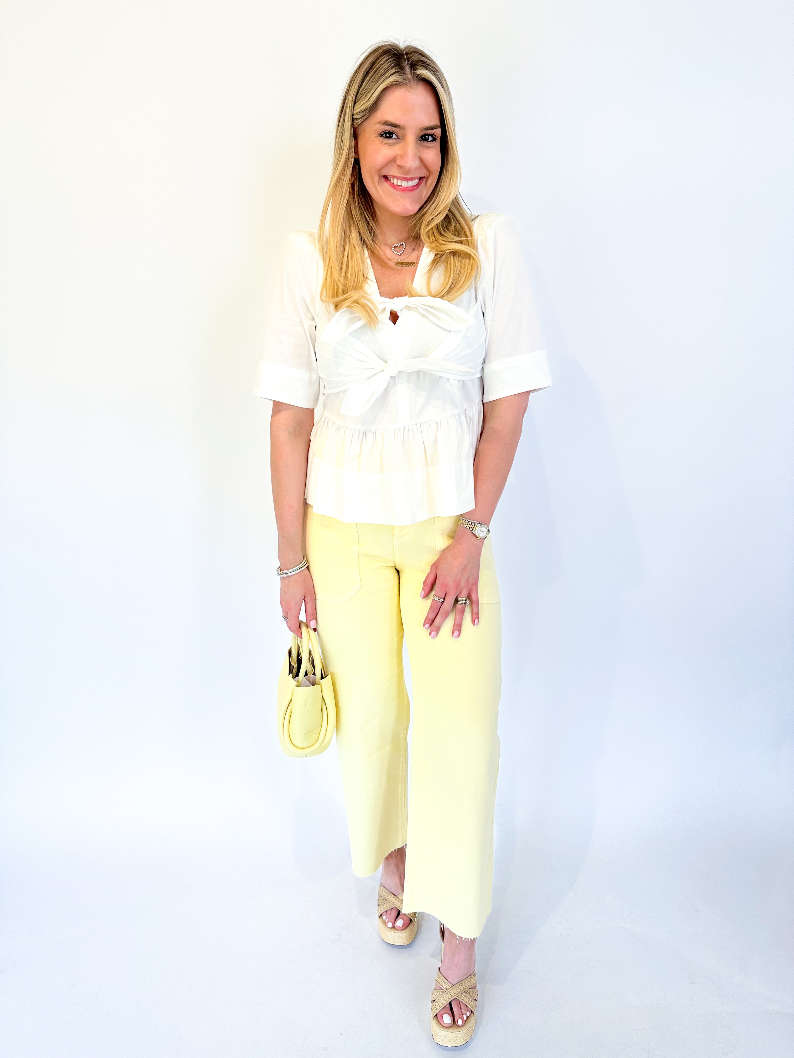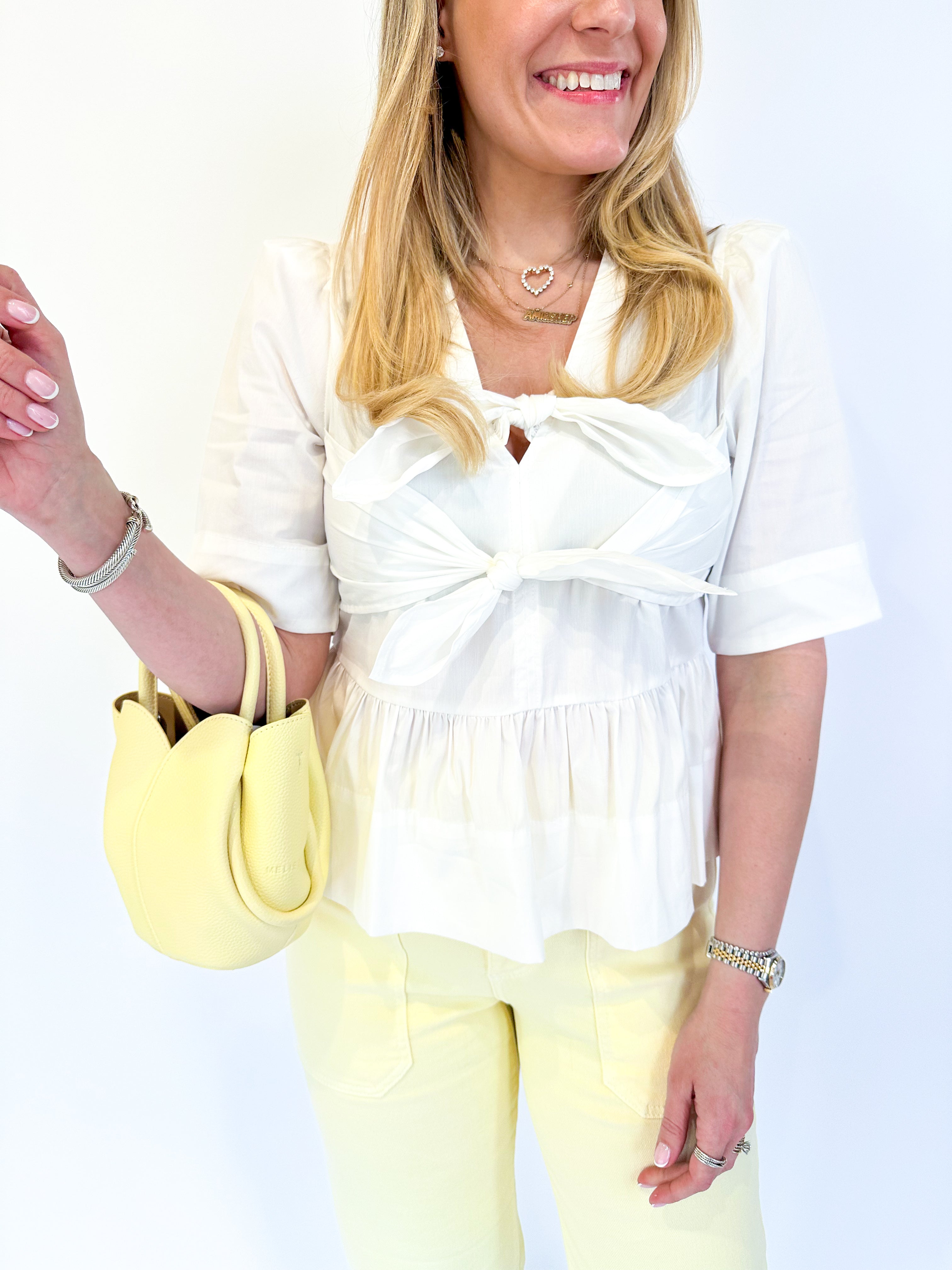Elevate your everyday style with this crisp white poplin top featuring a flattering peplum silhouette. The charming V-neckline showcases a signature double bow detail, while a self-tie bow at the back adds an unexpected touch of elegance. Perfect for dressing up or down, this short-sleeved essential brings polished sophistication to any wardrobe.
