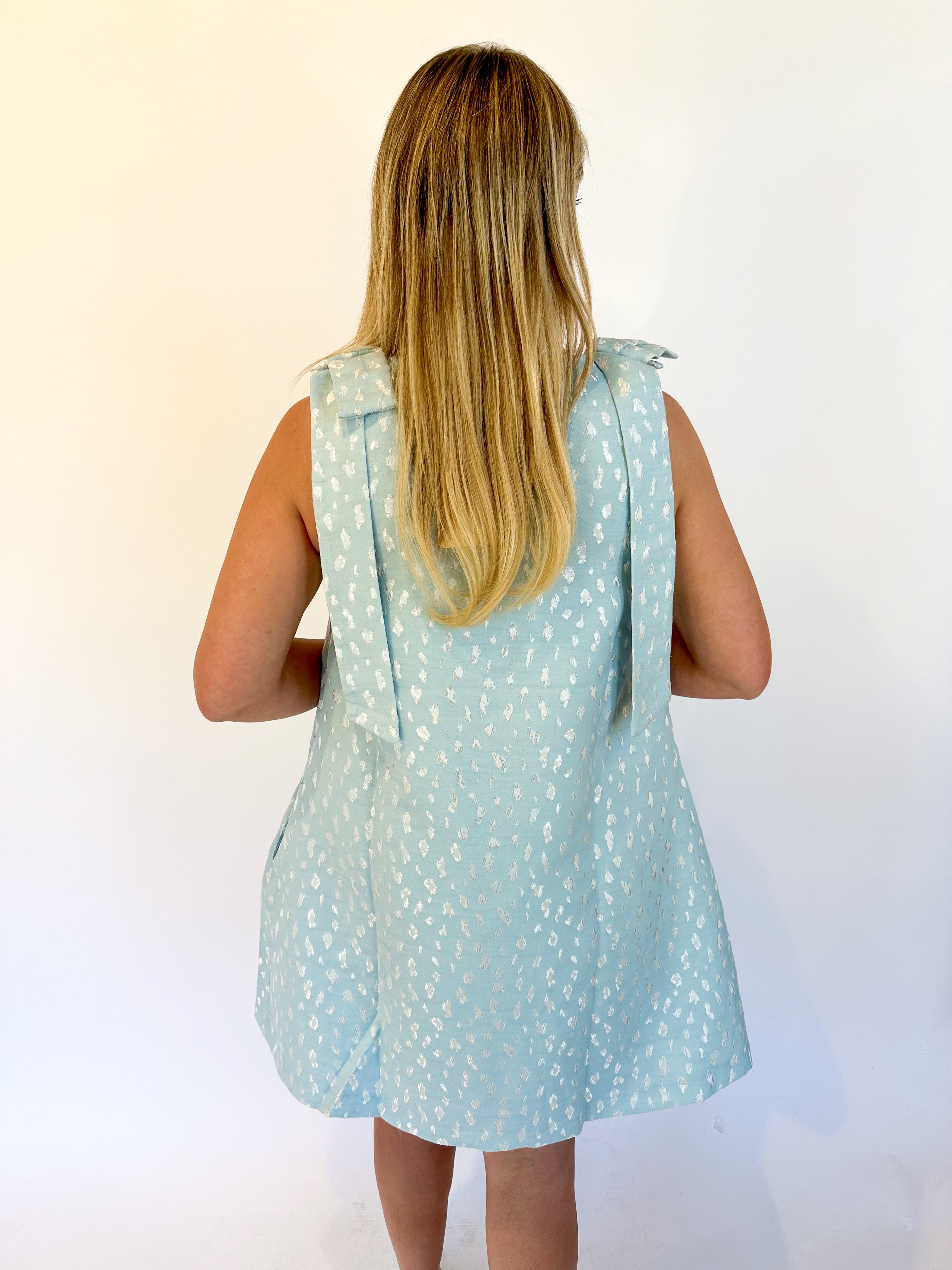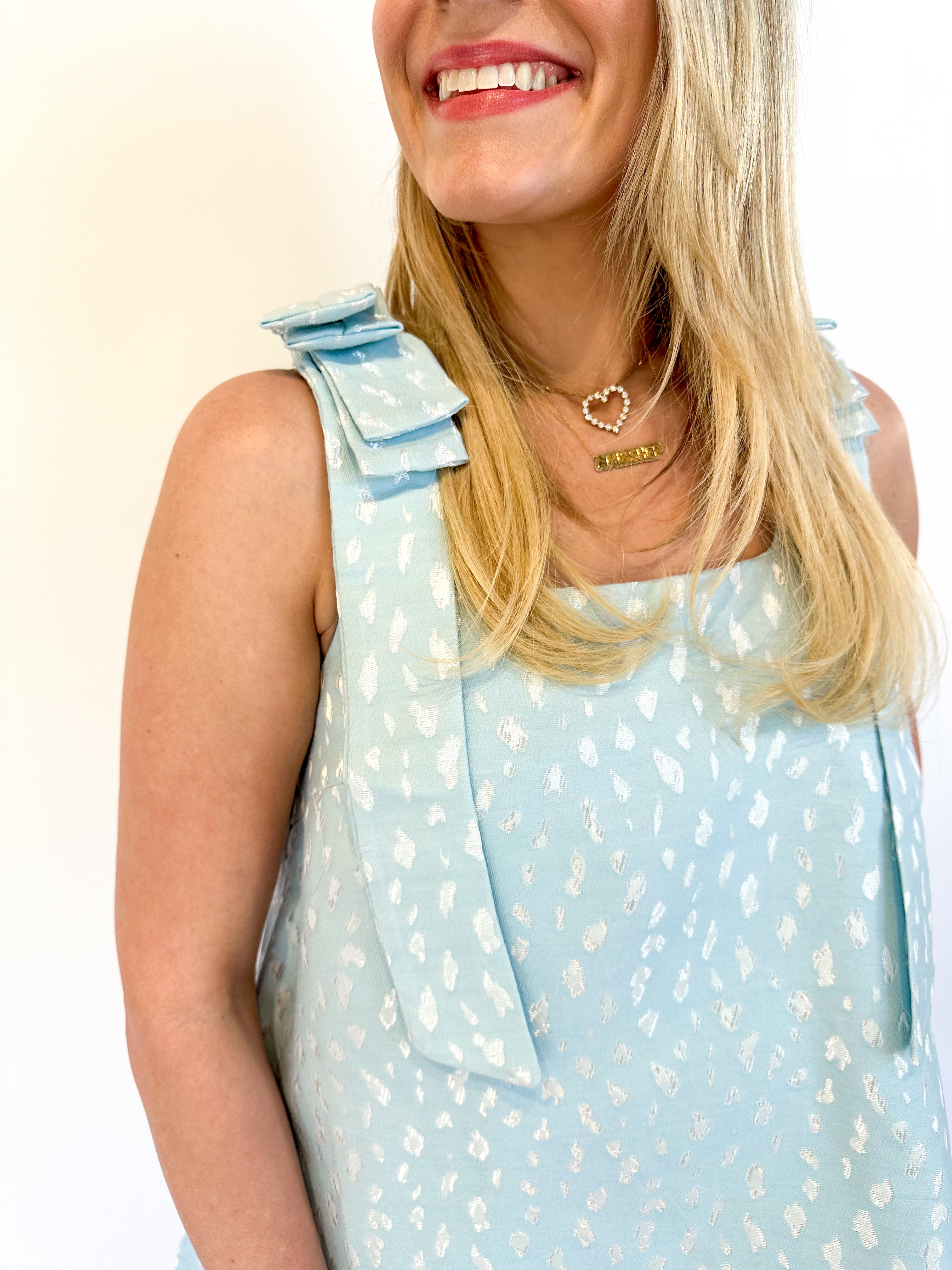 Elevate your cocktail game in this stunning aqua blue shift mini dress. Crafted from luxurious jacquard material, it features an eye-catching bow drape detail on the straps and a subtle animal spotted print throughout. The relaxed shift silhouette offers effortless elegance, making it the ideal choice for your next special occasion or night out.