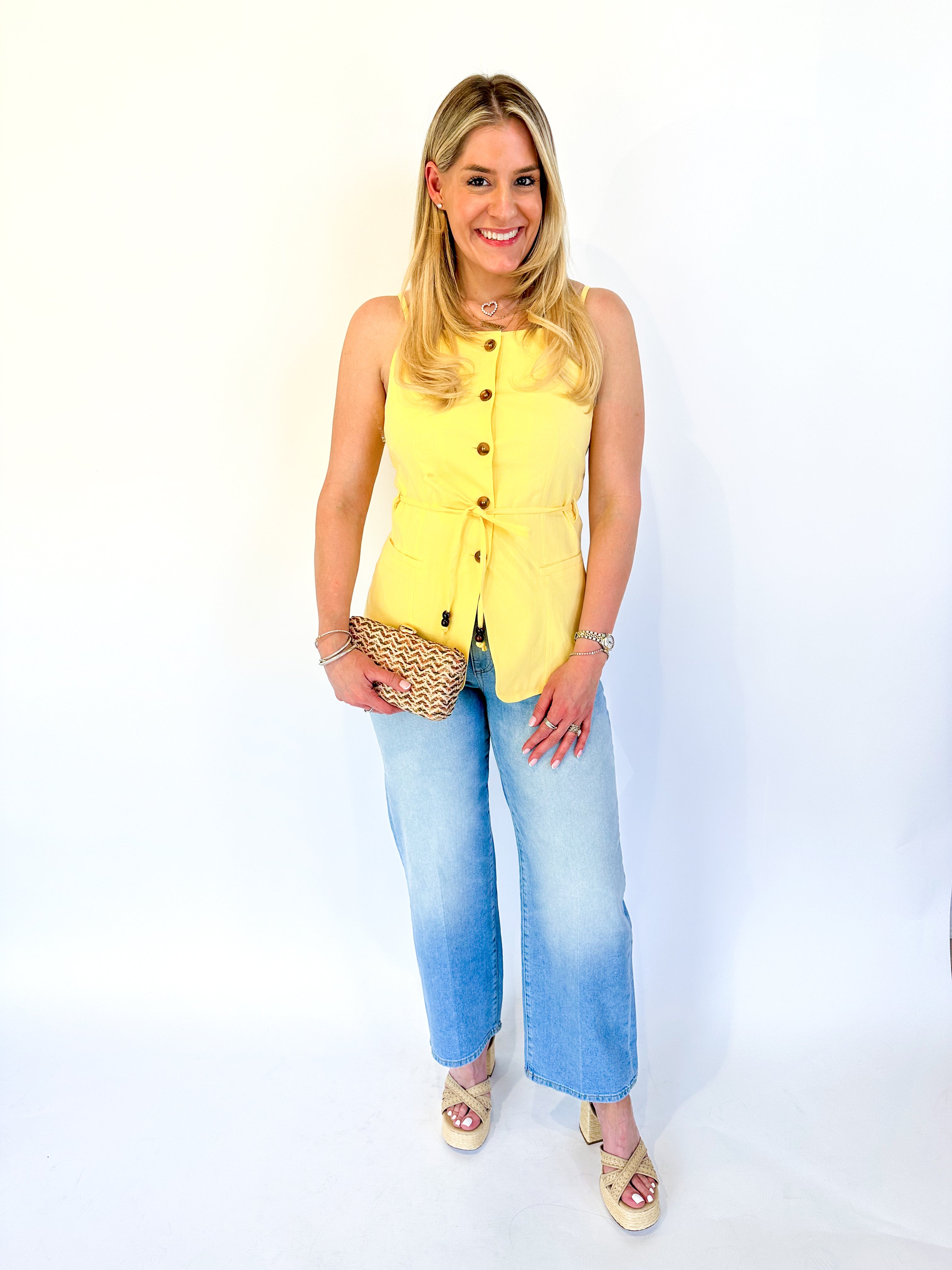 Effortless elegance meets versatile style with this linen button-front top. The self-tie waist creates a flattering silhouette, while the sleeveless design keeps you cool and comfortable. Dress it up with denim and heels for a polished look, or keep it casual with shorts and sandals. Pure wardrobe versatility.