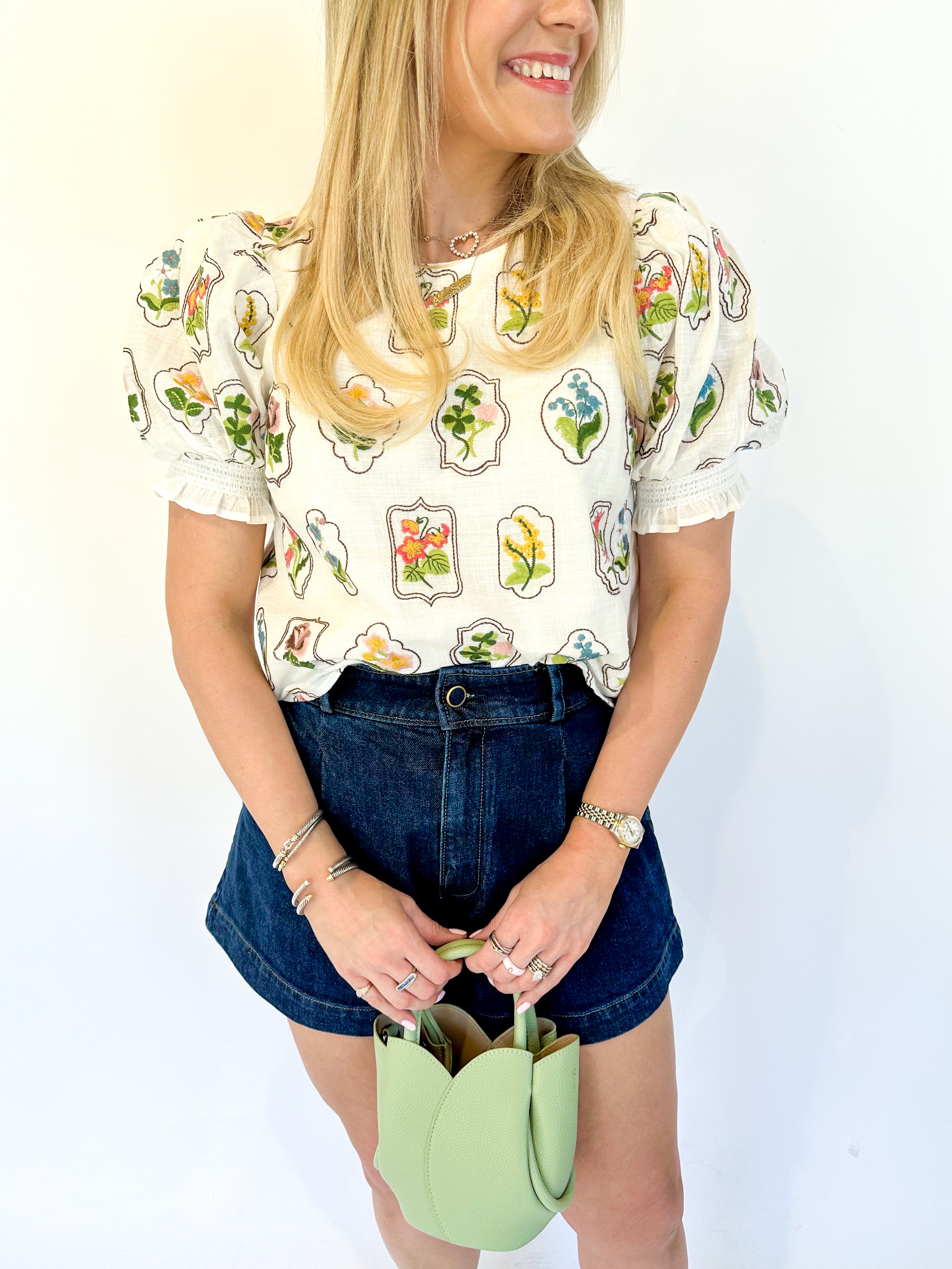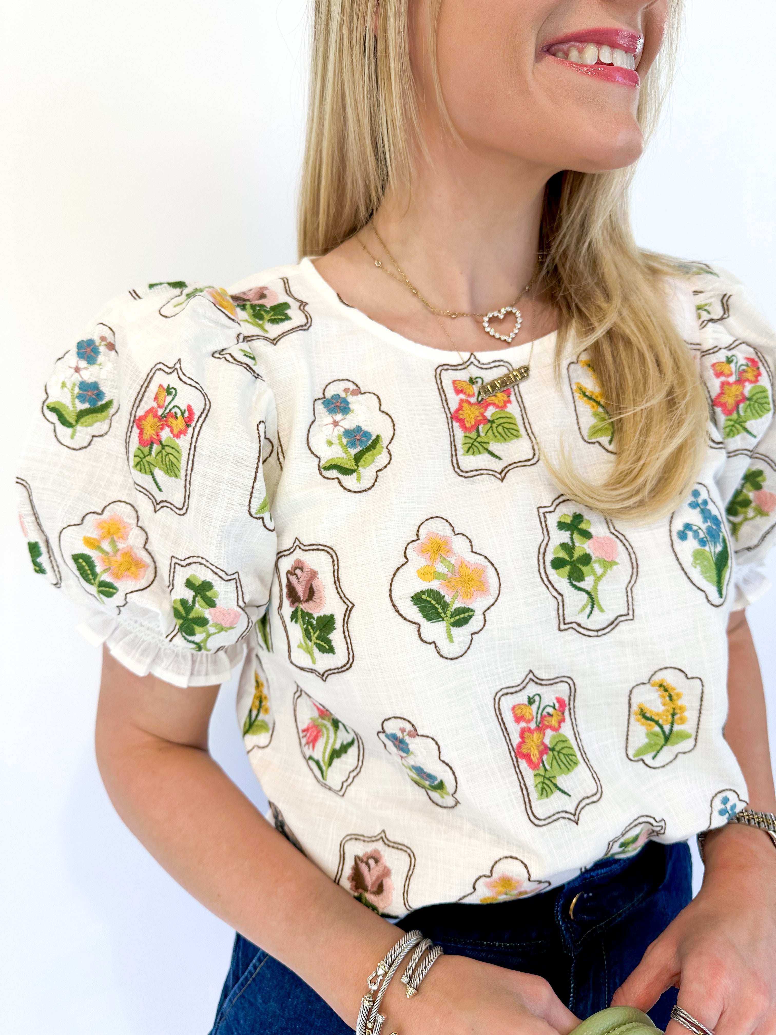 Elevate your wardrobe with this charming puff sleeve top, adorned with delicate floral embroidery that adds a touch of elegance. The smocked cuffs provide a flattering, tailored fit while the back keyhole button closure offers both style and practicality. Perfect for casual outings or dressed-up occasions, this short sleeve design is versatile enough to pair with your favorite jeans or skirts for an effortlessly polished look.