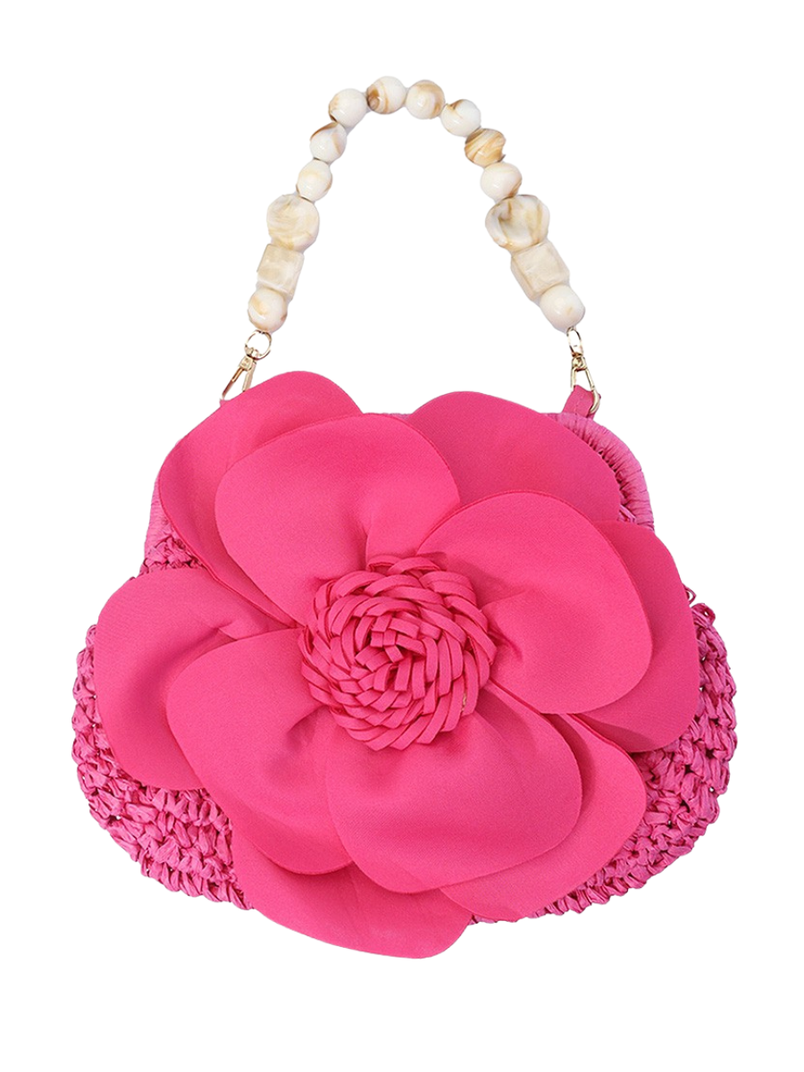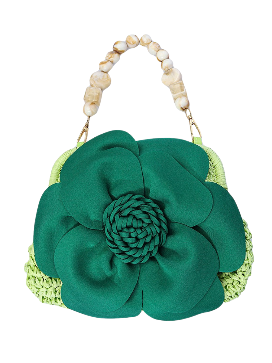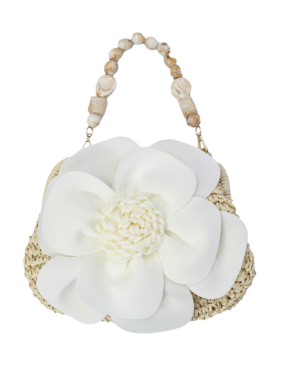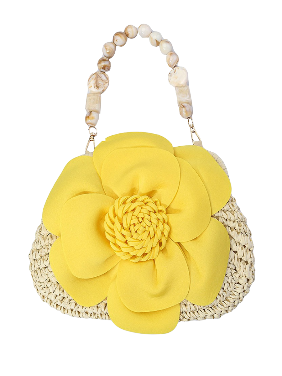 Handwoven raffia straw bag featuring a charming flower detail on the front and comfortable acetate bead short handles. Perfect for summer outings, beach days, or casual errands. This lightweight, versatile piece adds effortless style to any warm-weather wardrobe while keeping your essentials organized and accessible.