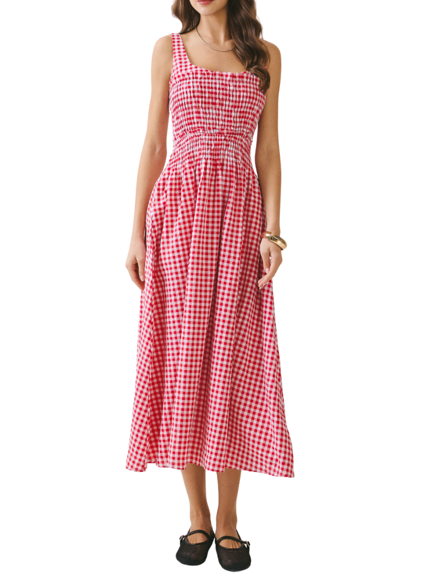 Gingham midi dress featuring a smocked bodice and pockets at the side seams. Fully lined for a smooth fit and added comfort.