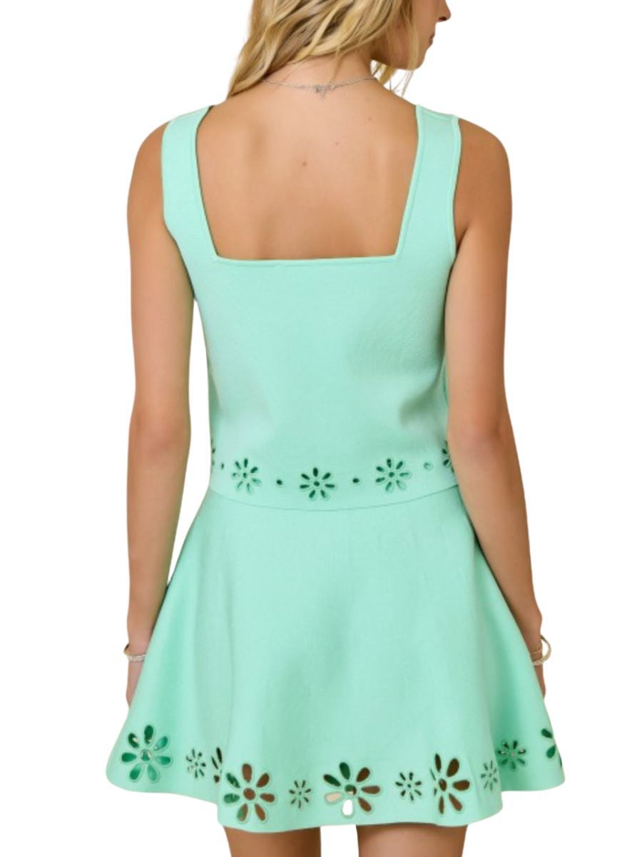 Elevate your everyday style with this high-waisted A-line knit skirt, featuring delicate flower cutouts that add a touch of feminine charm. The flattering silhouette skims your curves while the breathable knit fabric keeps you comfortable all day long. Dress it up with the matching top for a coordinated look, or keep it classic with a crisp white tee.