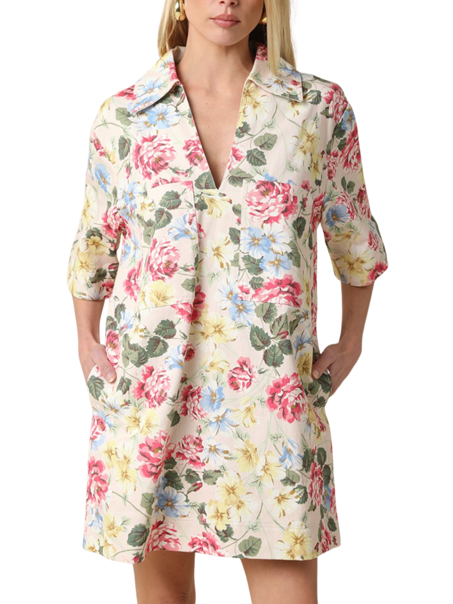 Our Lyla Floral Collard Dress features a soft open V neck with a relaxed pointed collar and easy slip on style with a boxy shift silhouette that drapes loosely on the body.