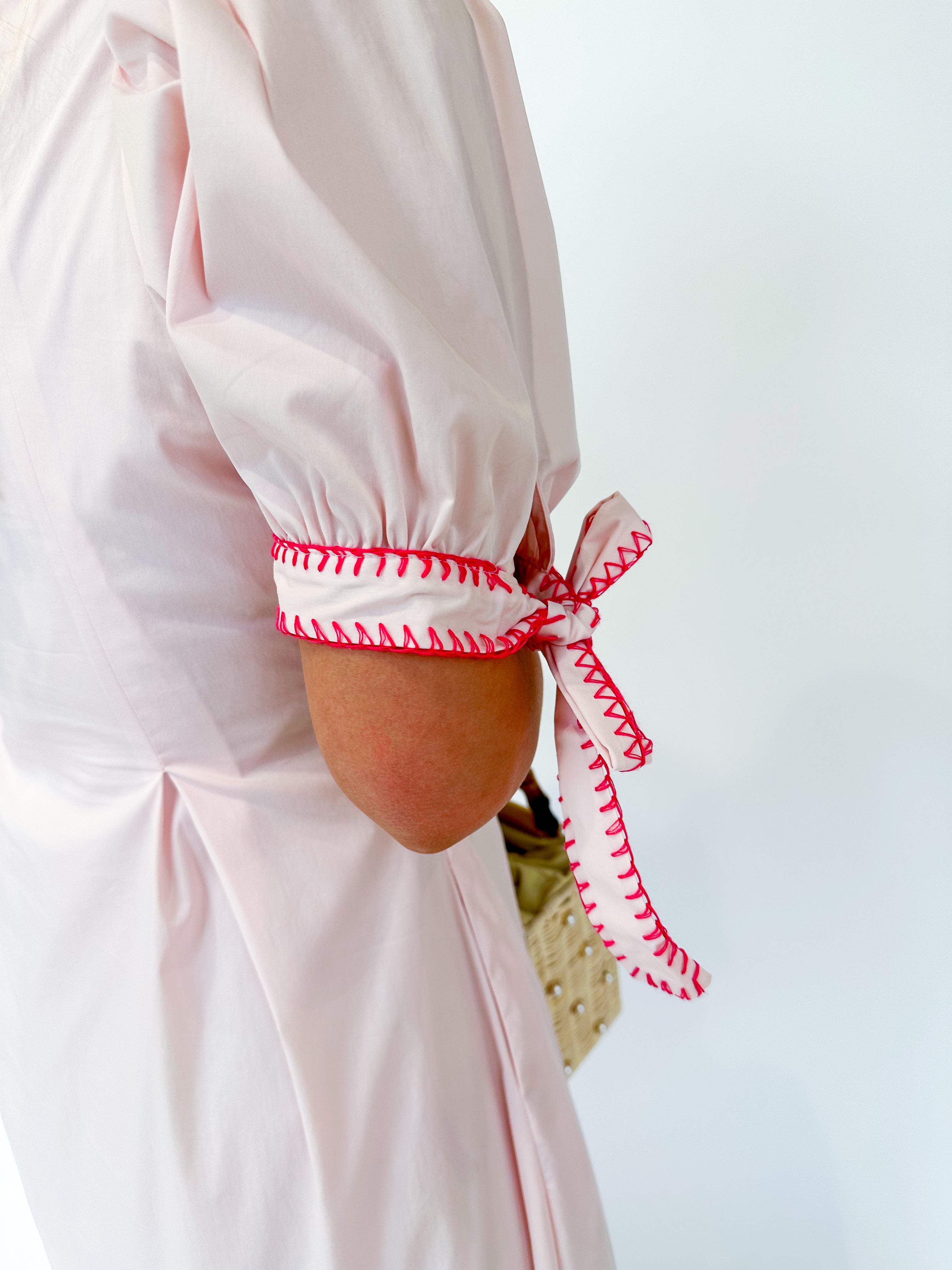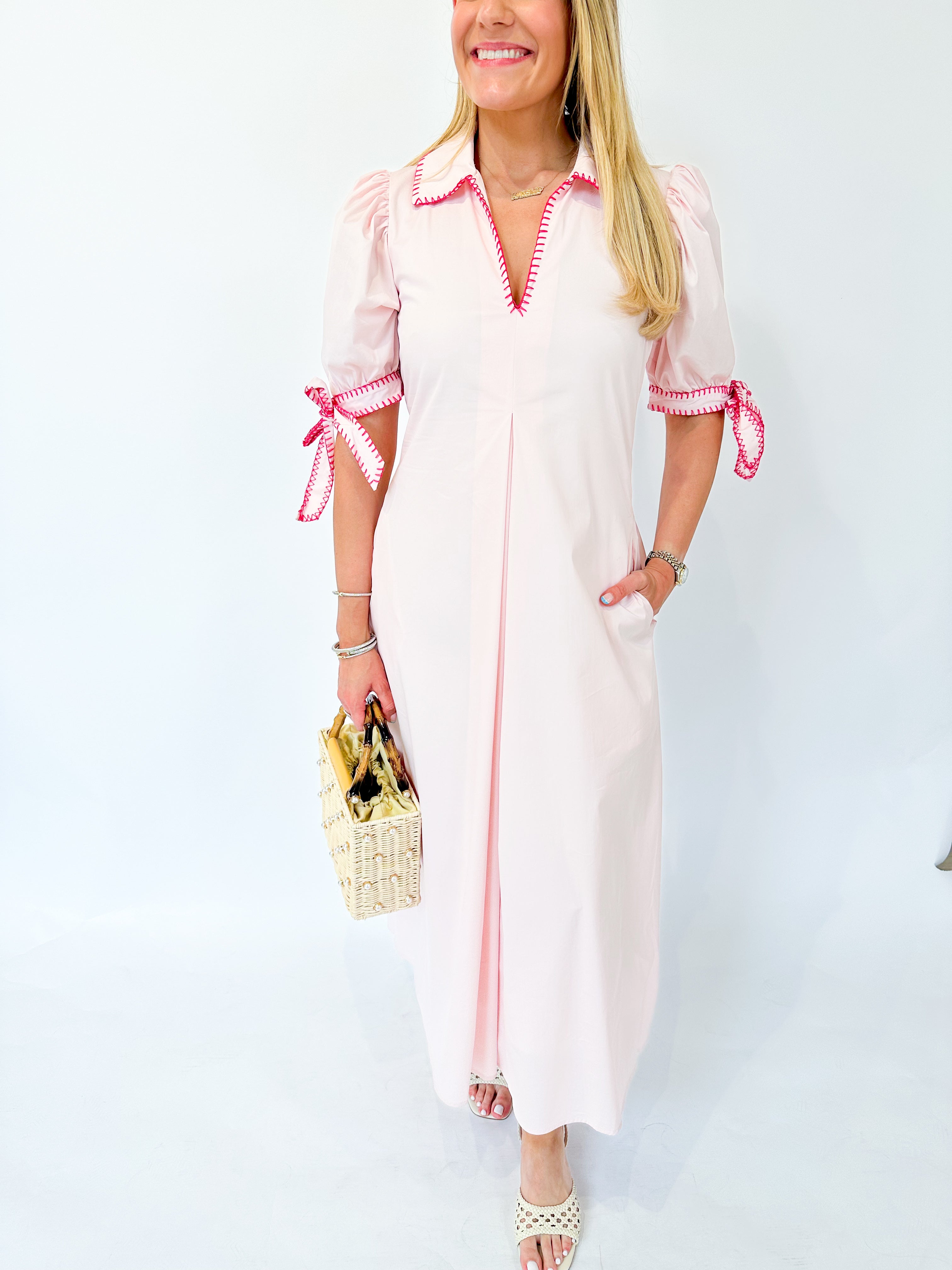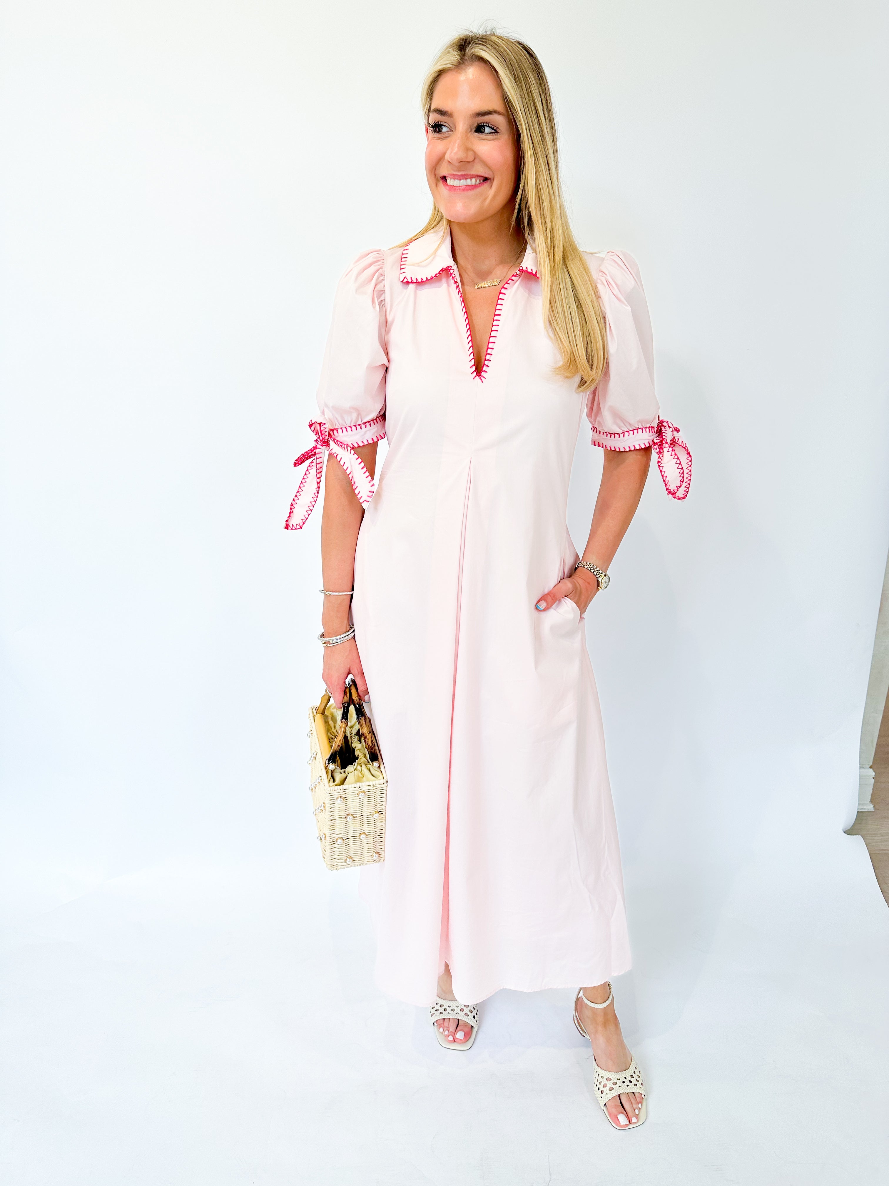 Effortless elegance in soft poplin. This light pink midi dress features three-quarter sleeves and a graceful silhouette, elevated by delicate contrast pink stitching that traces the collar and sleeve edges. Perfect for casual outings or dressed up for special occasions. The thoughtful stitch detailing adds dimension and visual interest to a timeless piece.