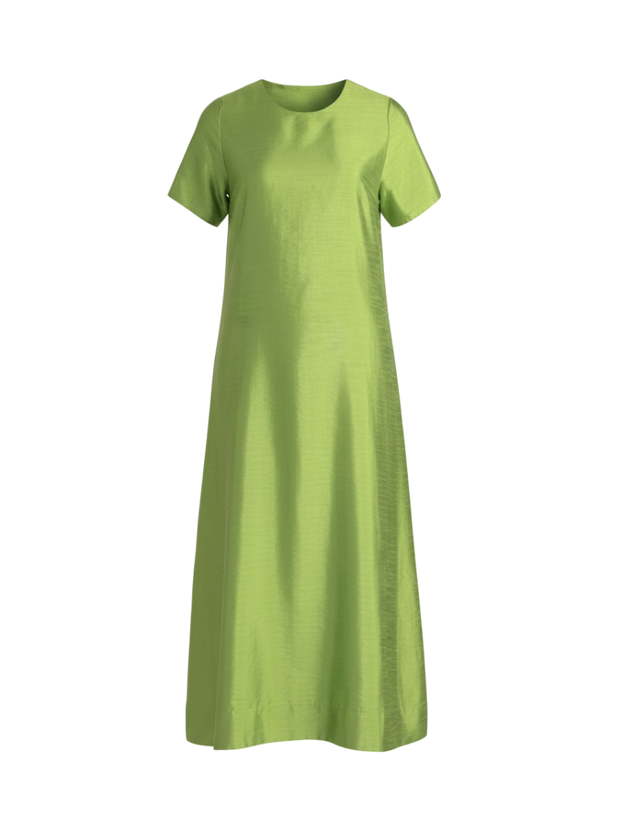 Introducing the Georgia Dress—a spring essential that effortlessly combines sophistication with ease. This short-sleeve maxi dress features a lush green hue and luxurious taffeta fabric that creates beautiful movement and texture. The refined silhouette feels elevated for any occasion, from brunch to evening events. Layer with delicate jewelry and statement pieces to personalize your look and let this versatile dress become the foundation of your seasonal wardrobe.