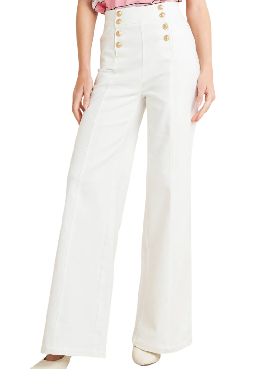 Elevate your wardrobe with these crisp white sailor pants featuring a flattering high-waisted silhouette and polished gold button details. Perfect for creating effortlessly chic looks, from casual outings to sophisticated occasions. The timeless nautical-inspired design pairs seamlessly with everything in your closet, making it an essential piece you'll reach for again and again.