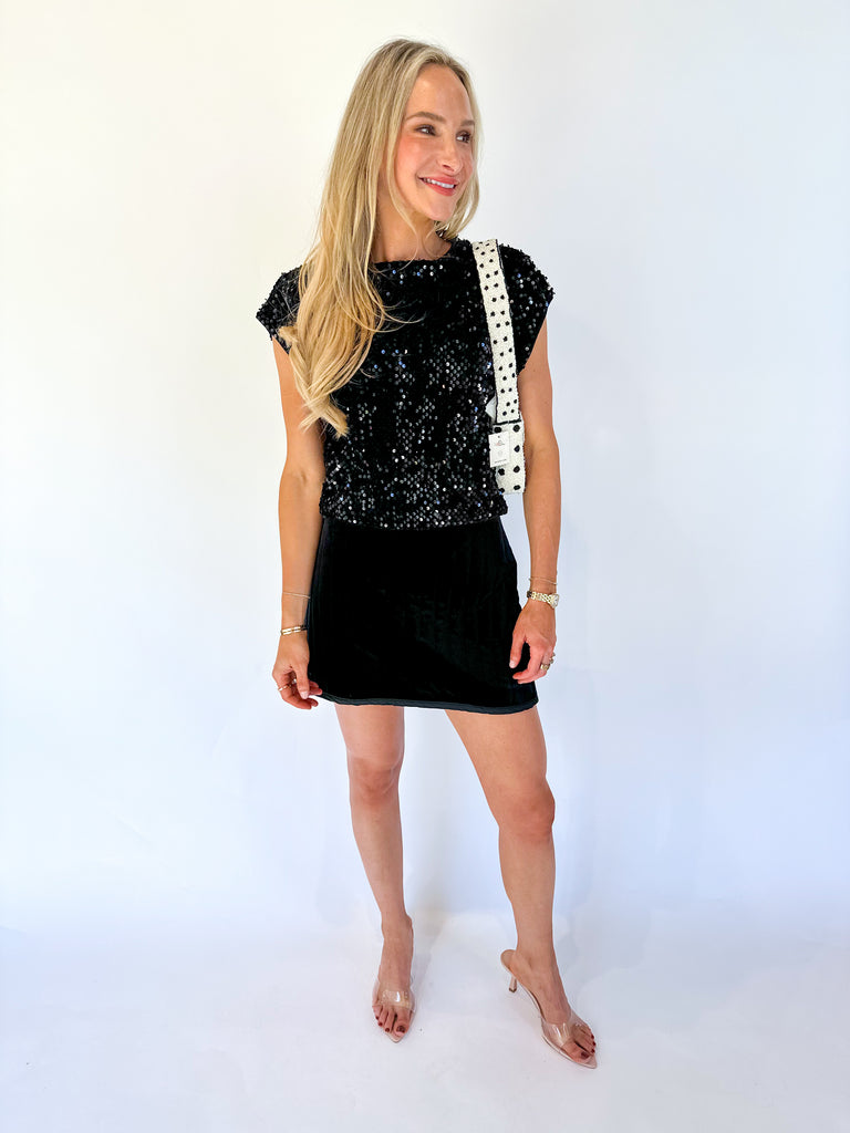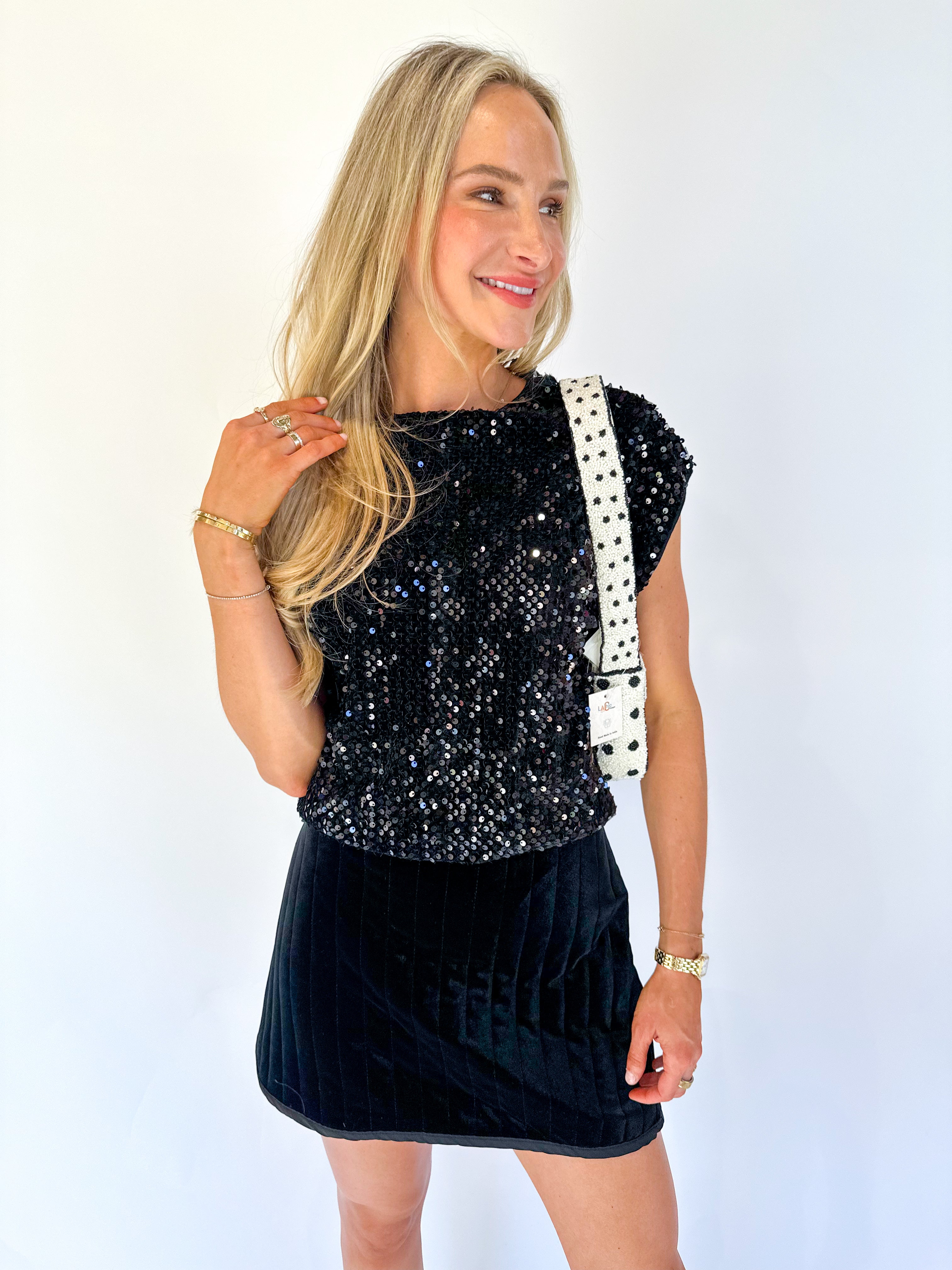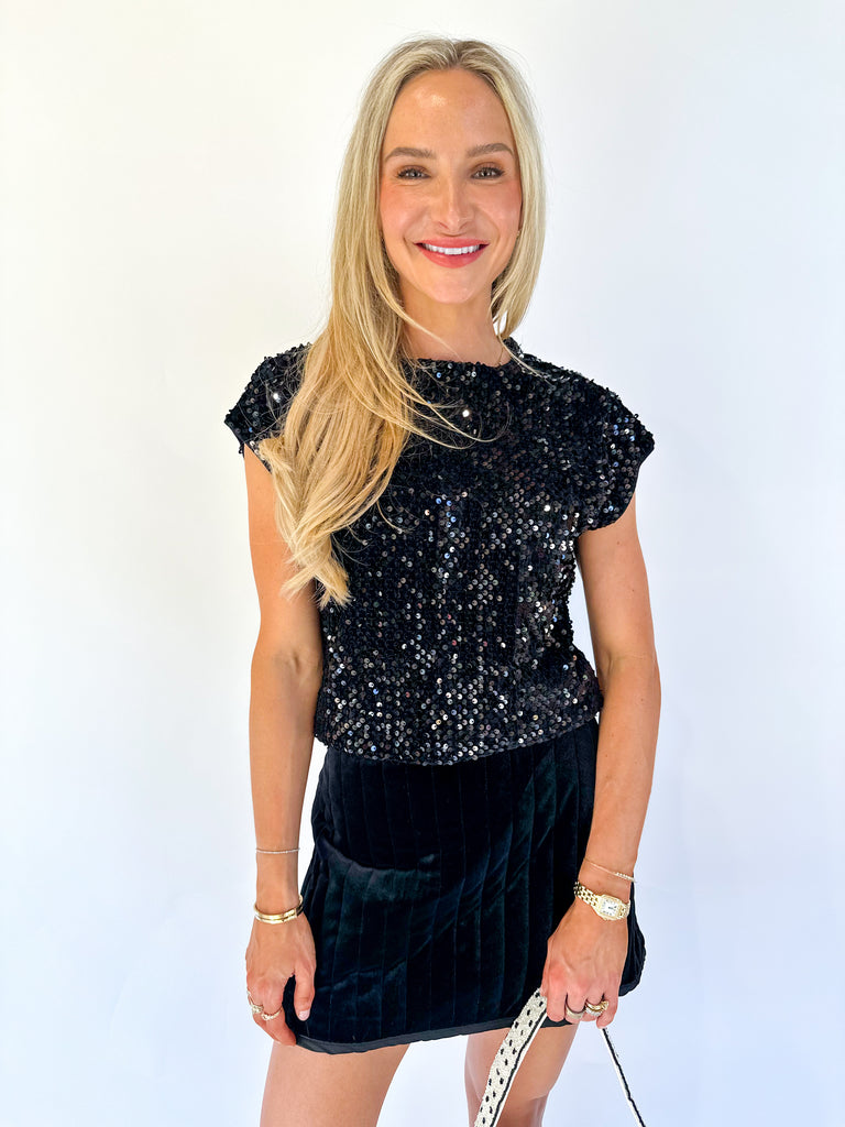 Elevate your evening wardrobe with this sleek black high-neck top featuring shimmering sequins and elegant cap sleeves. The drape neck design adds a sophisticated touch, making it perfect for glamorous nights out or special events. Its flattering fit accentuates your silhouette while the sparkling detail ensures you stand out with effortless style.