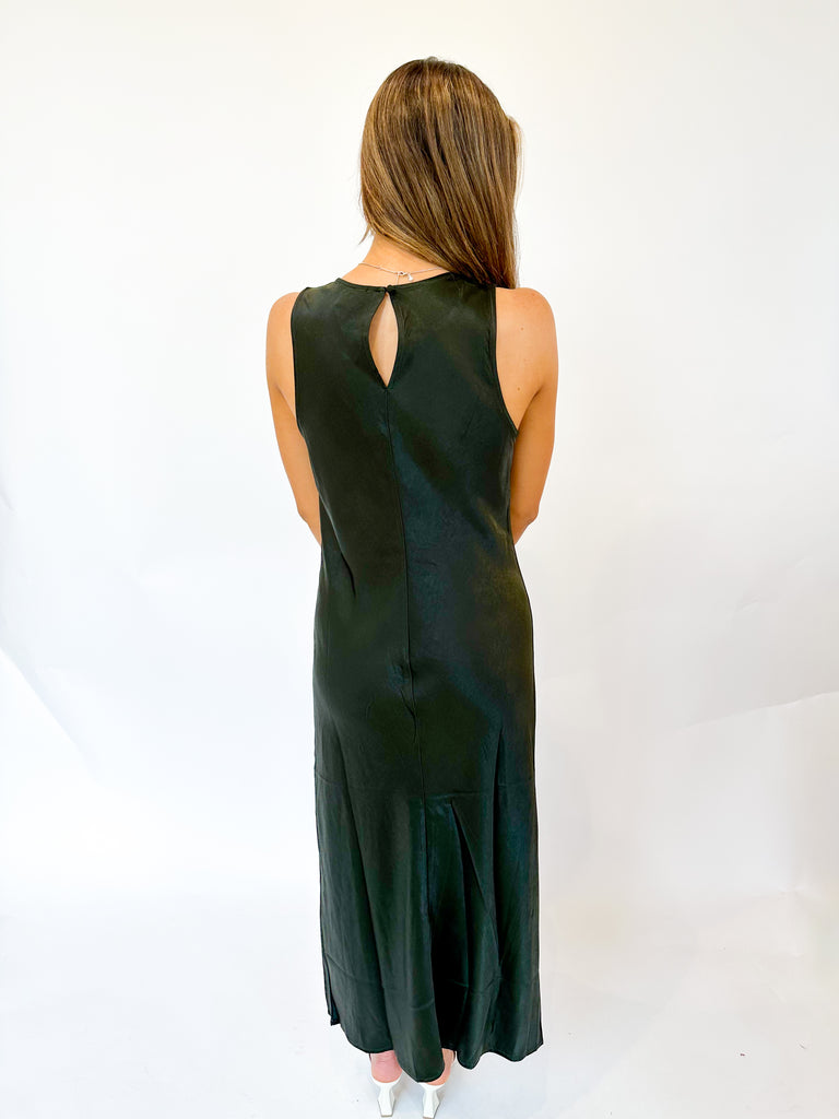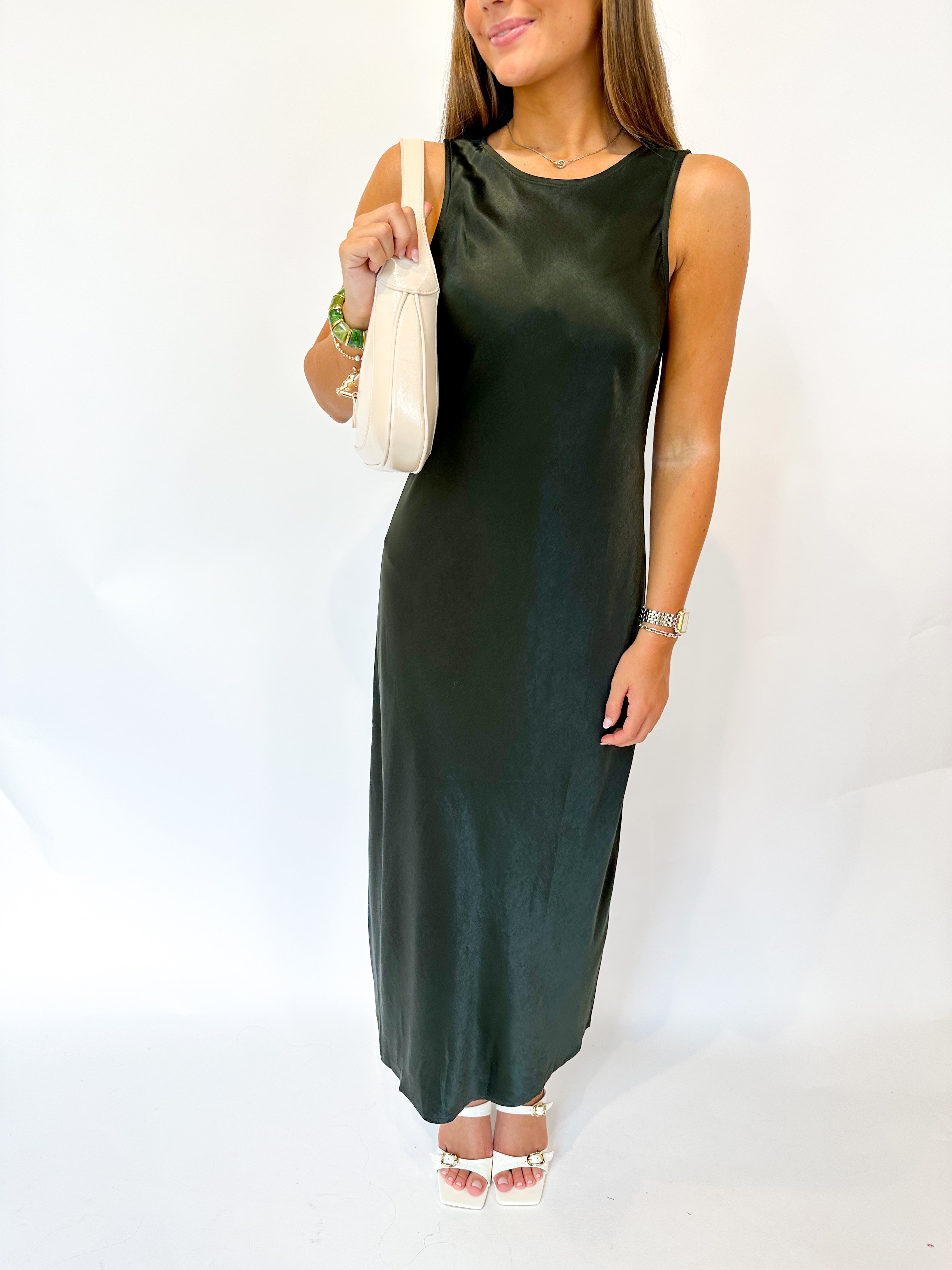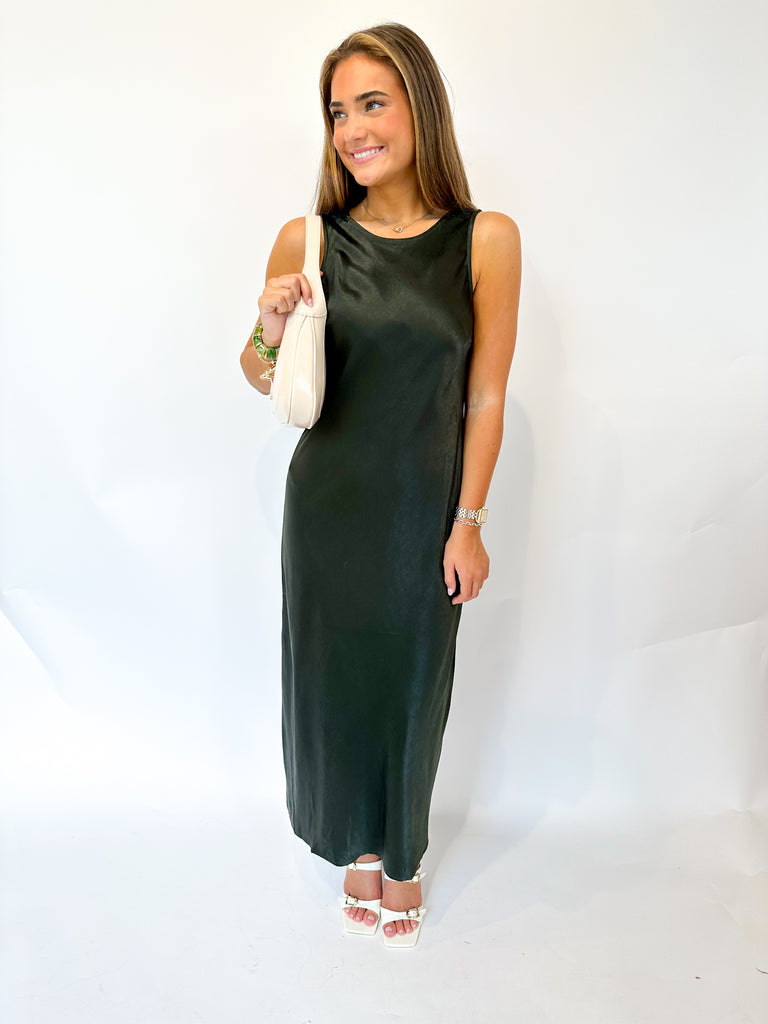 Elevate your evening look with the Everyday Satin Dress in a rich deep olive green. Its smooth satin fabric drapes beautifully in a classic shift silhouette, offering both comfort and effortless style. Designed to shine at any nighttime event, this dress pairs perfectly with your favorite accessories for a polished, confident appearance.
