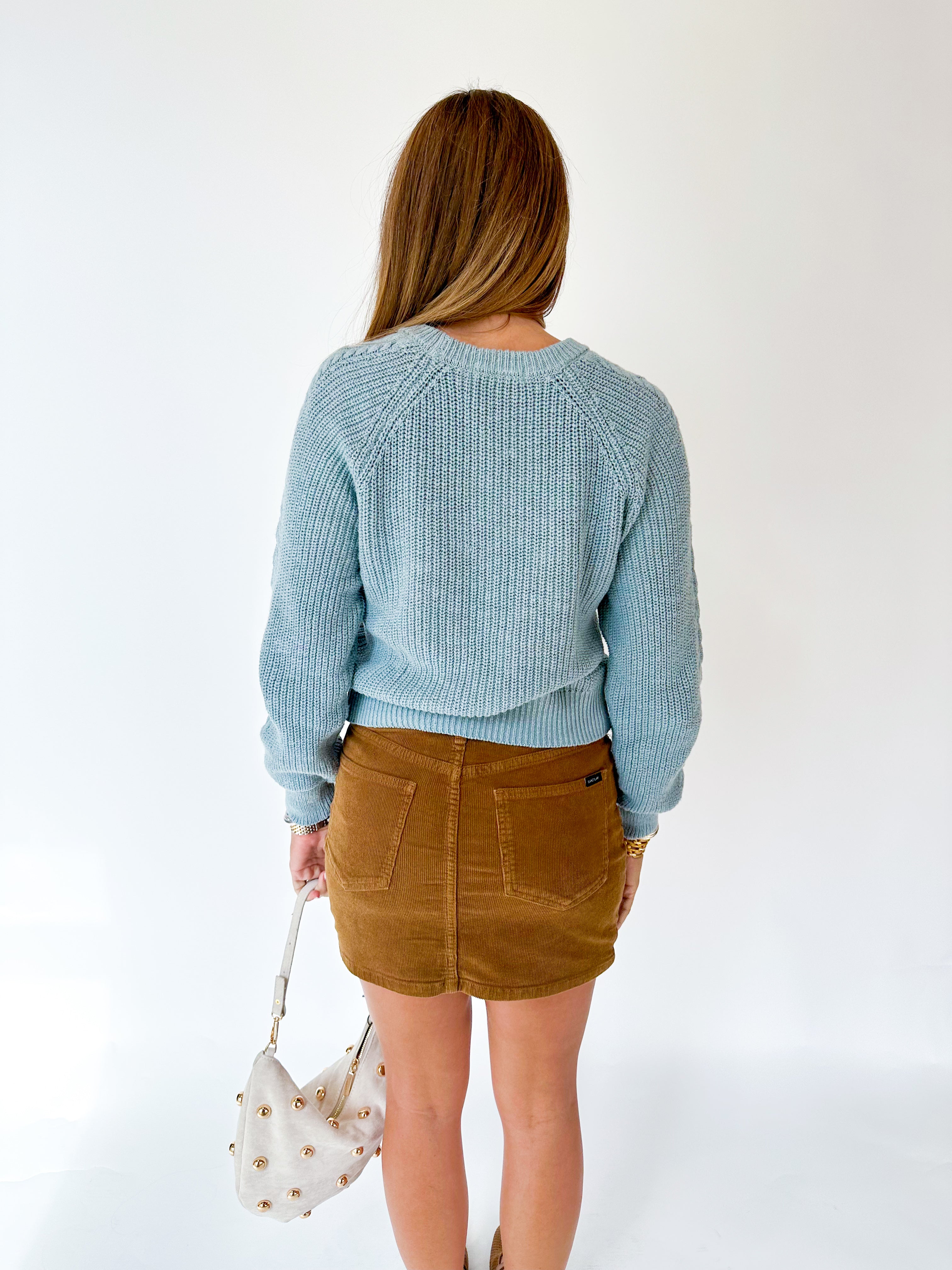 Embrace timeless comfort with the Nomad Cable Popover Sweater in a fresh sky blue hue. Its classic cable knit design pairs effortlessly with a skirt and ballet flats for an effortless daytime look, or layer it over your favorite jeans and boots as the weather cools. Soft, cozy, and versatile, this sweater is perfect for transitioning through seasons while keeping your style on point.