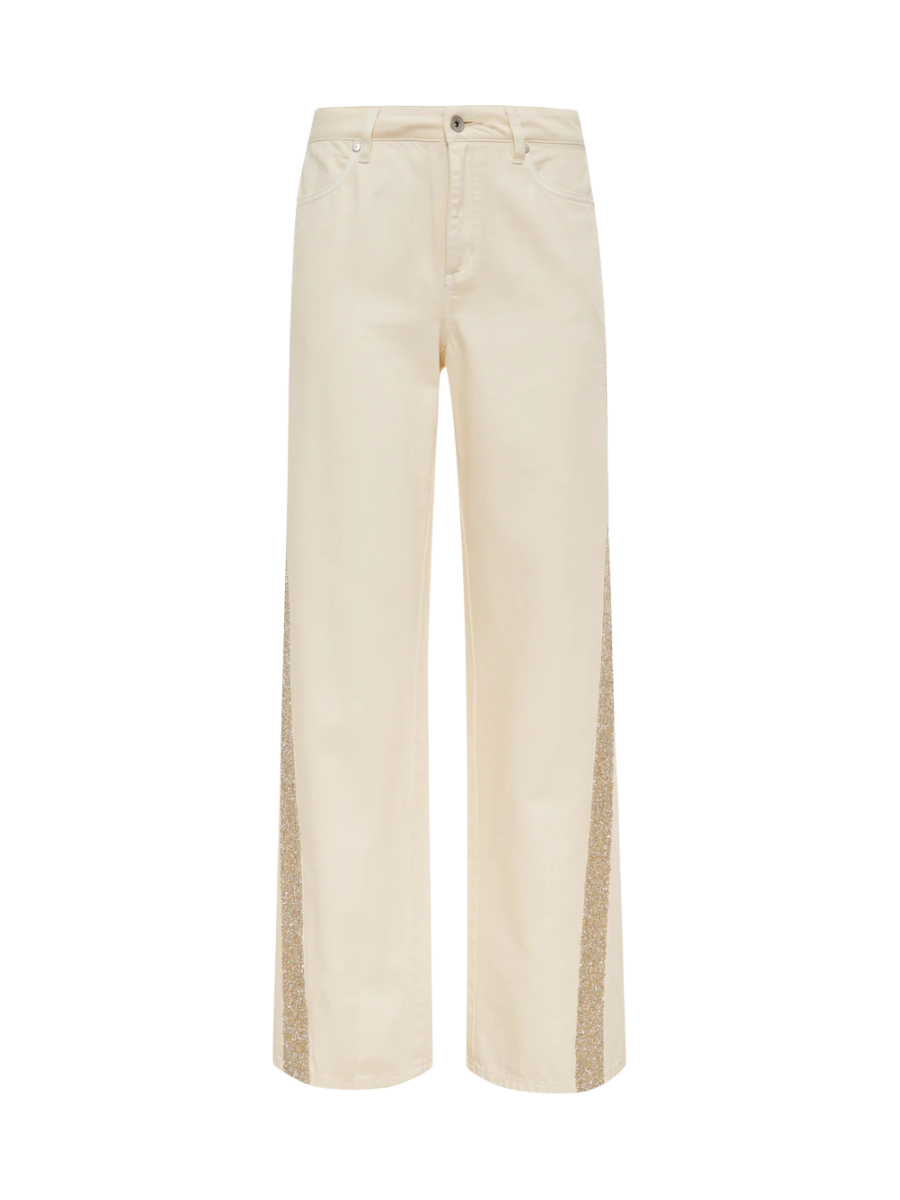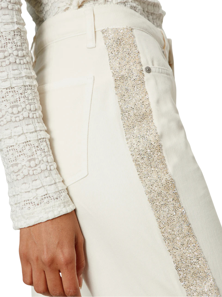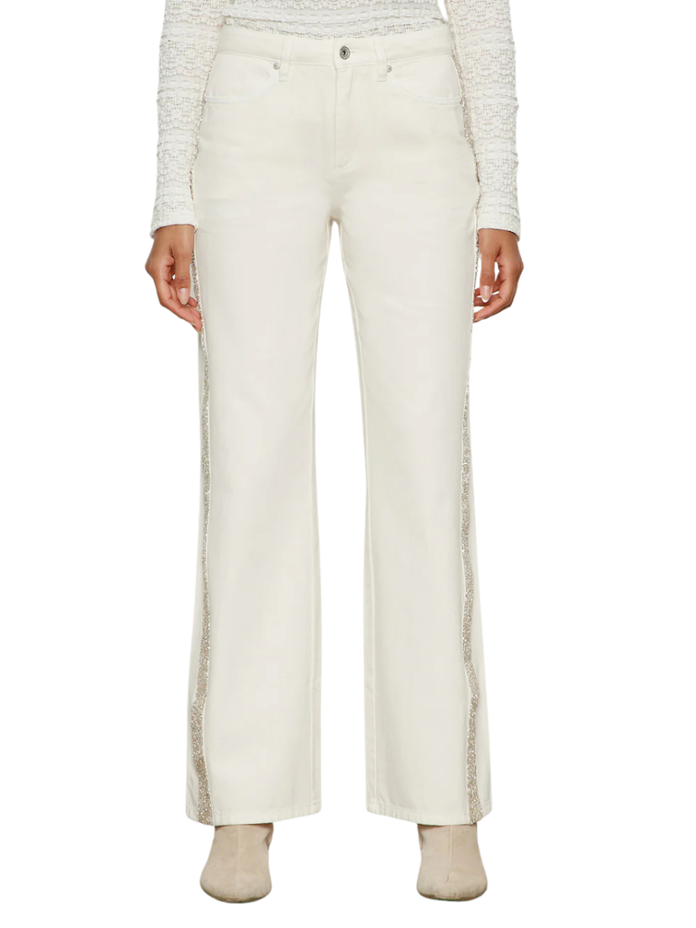 Introducing the Cadence Shimmer Stripe jeans. With a standard rise and straight leg design, these jeans offer a relaxed fit for all-day comfort. The unique twisted seam detail and beaded tape trim provide a touch of shimmer and style. Made with a lightweight fabric, these jeans are perfect for any occasion.
