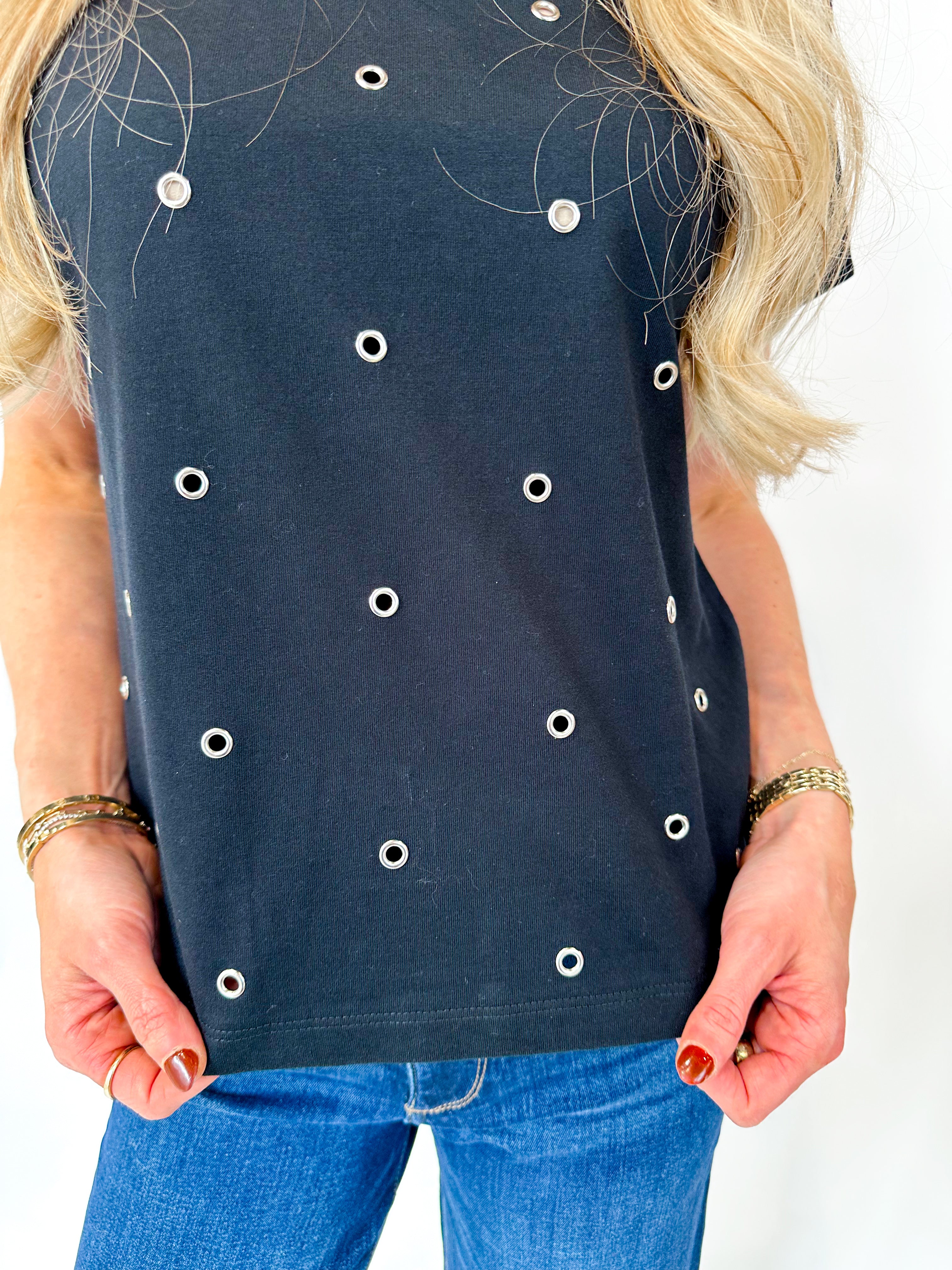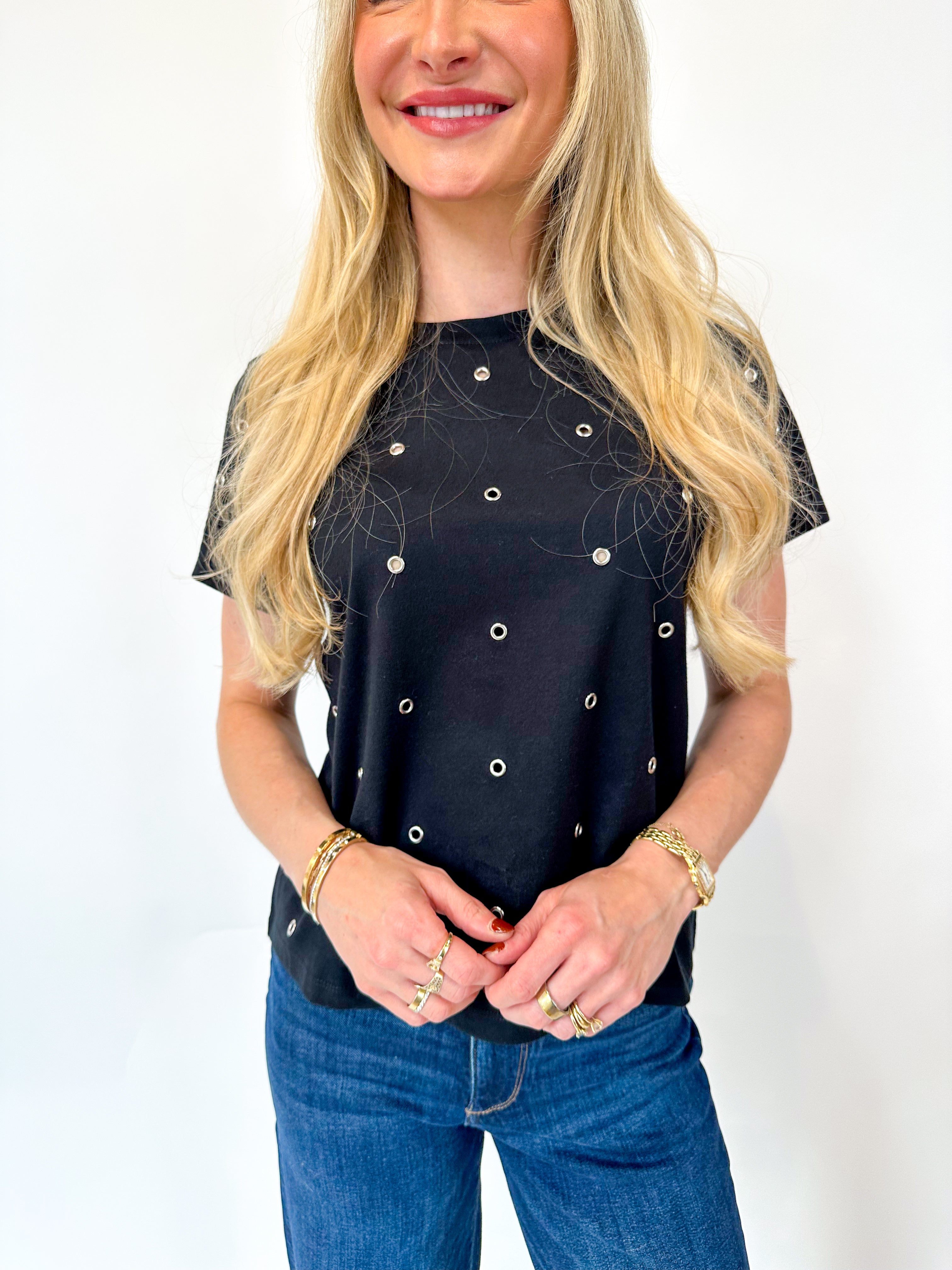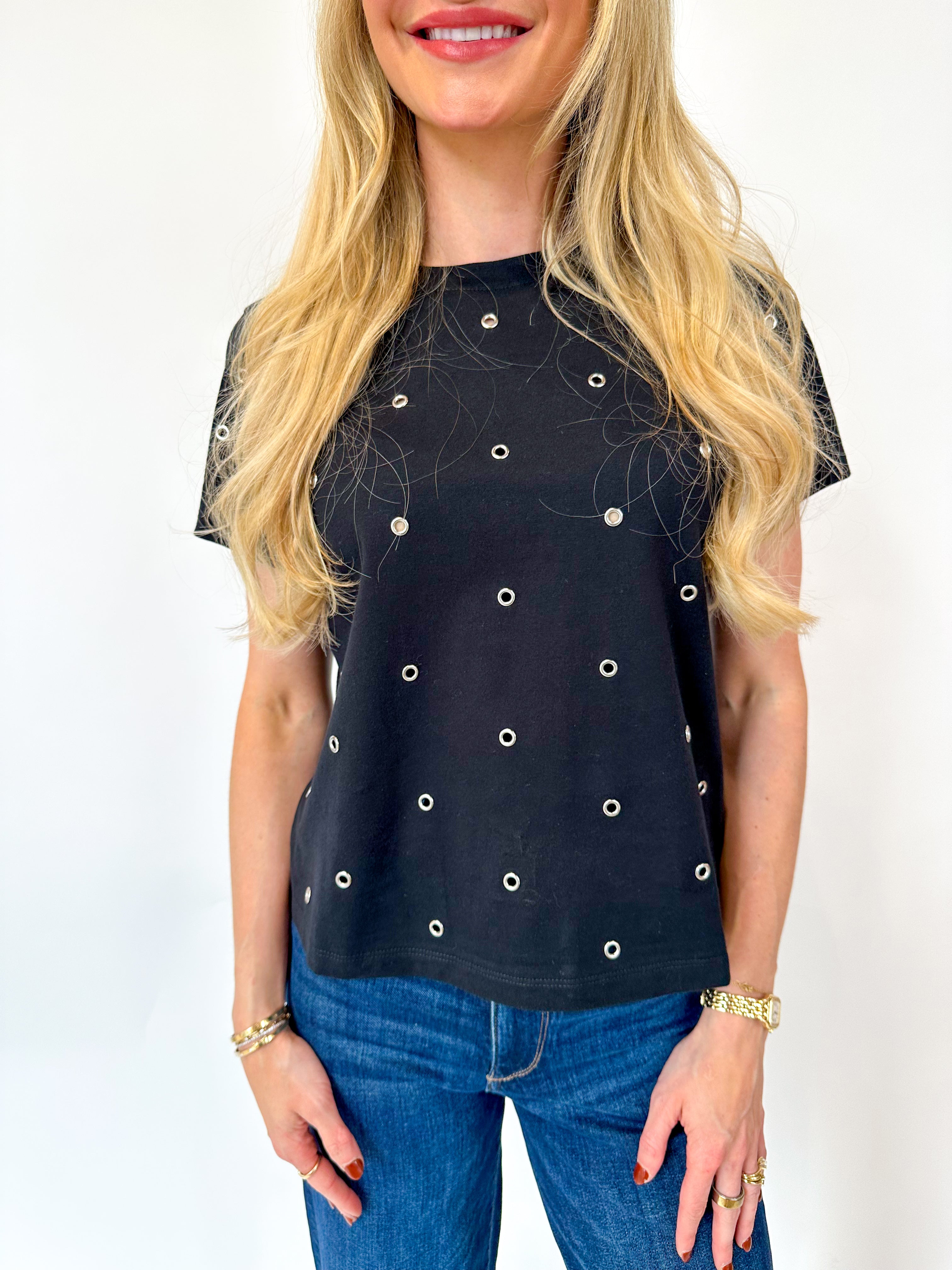 Elevate your basics with this faded black tee featuring striking silver grommet details across the front. The understated embellishment adds edge and visual interest to an everyday essential, making it perfect for layering or wearing solo. Versatile enough for casual outings yet distinctive enough to stand out, this piece bridges the gap between simple and statement-making.