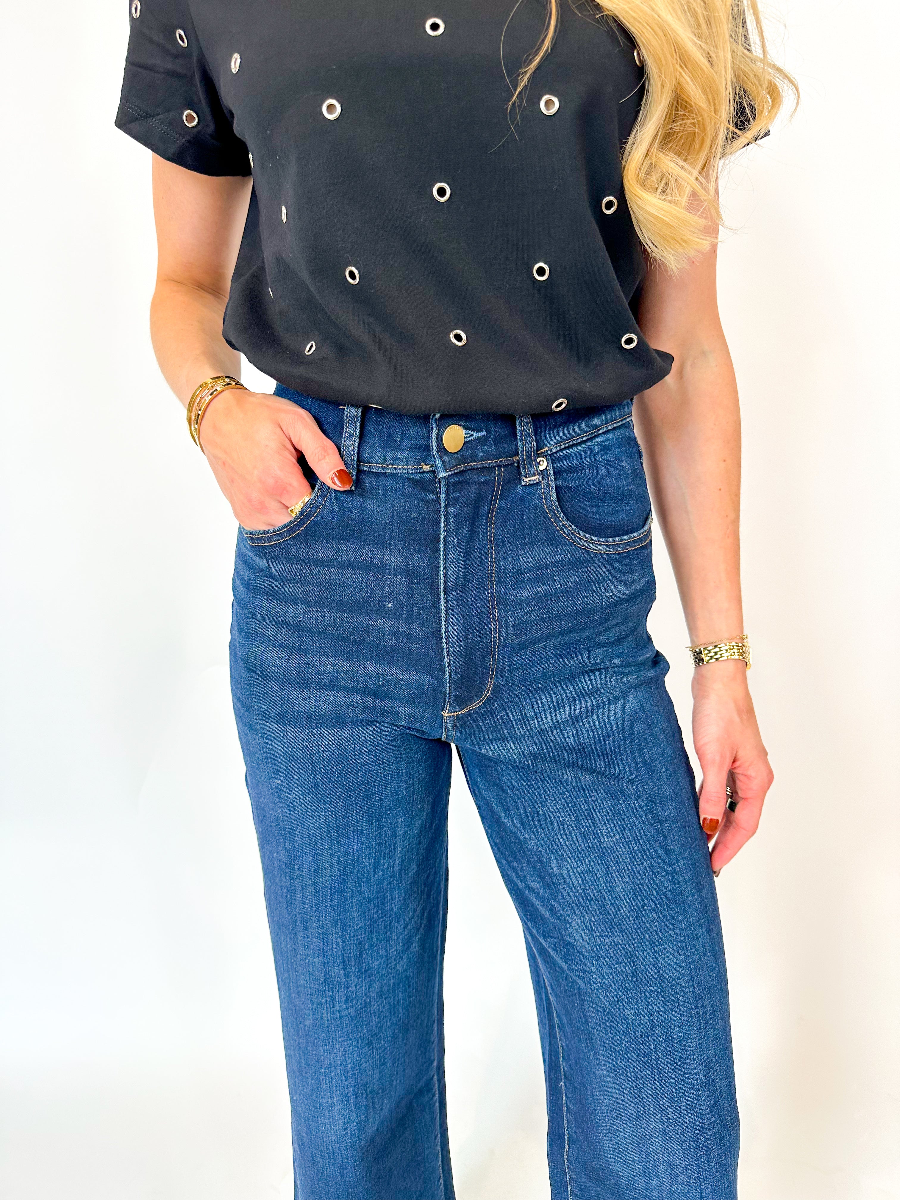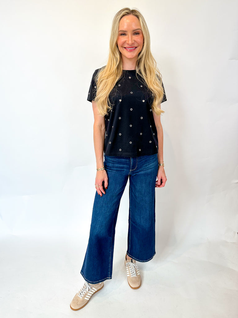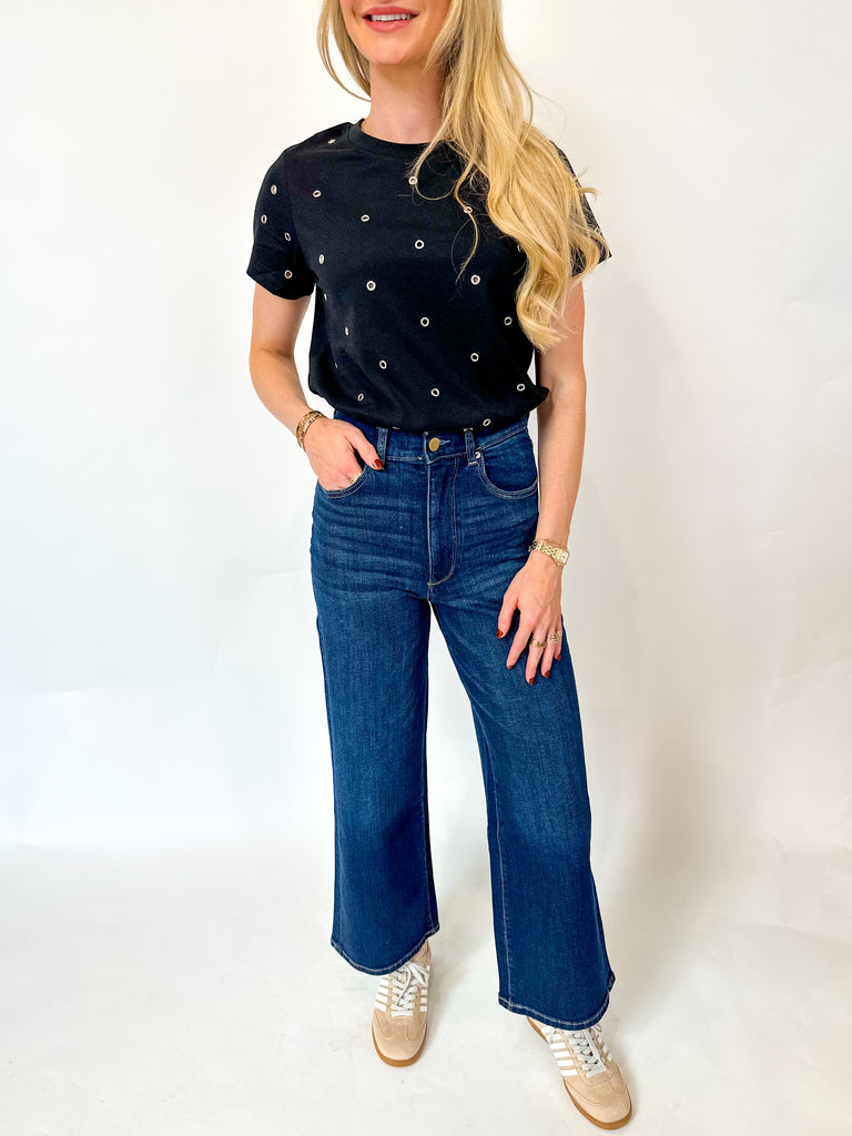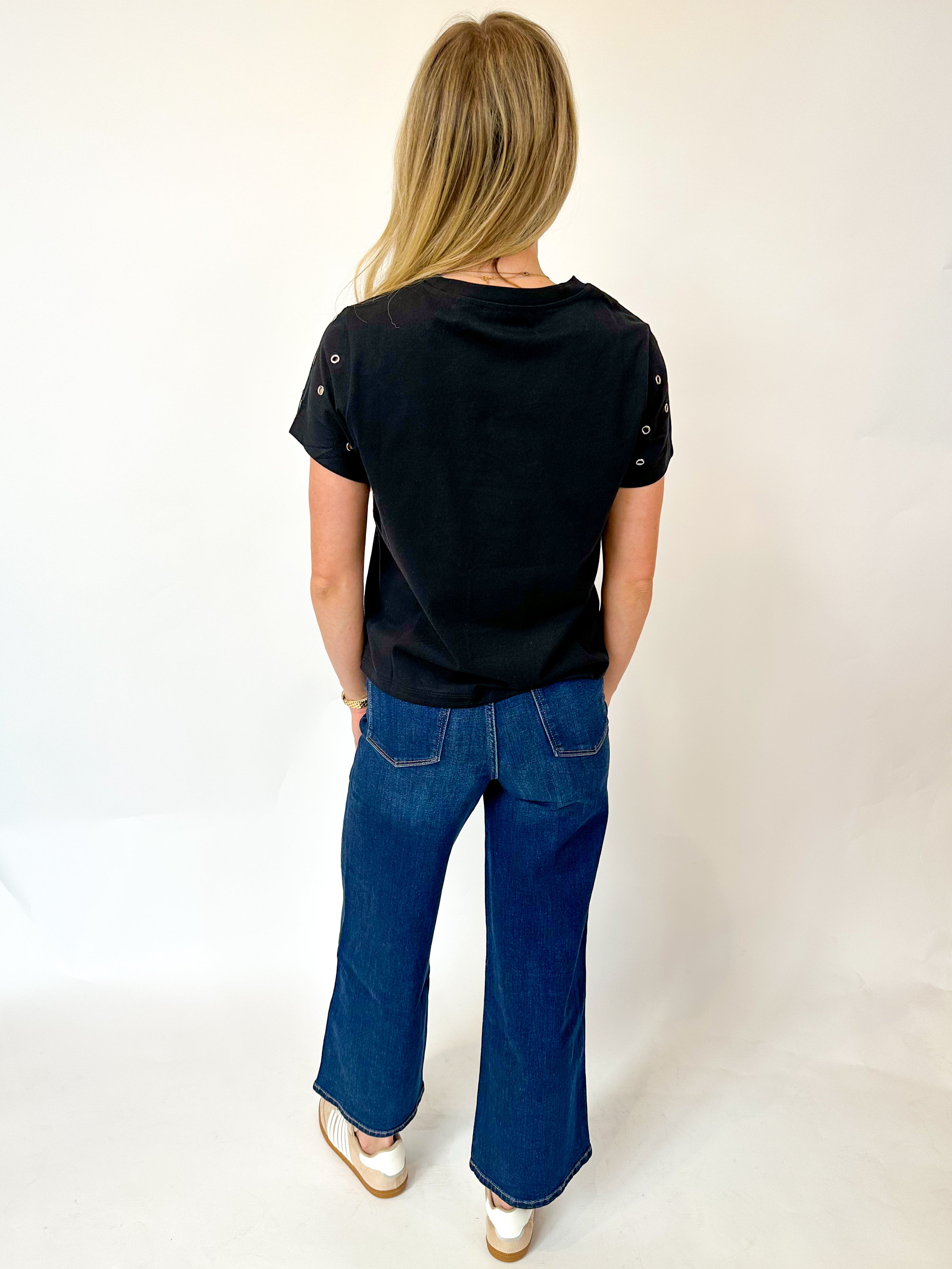 Elevate your basics with this faded black tee featuring striking silver grommet details across the front. The understated embellishment adds edge and visual interest to an everyday essential, making it perfect for layering or wearing solo. Versatile enough for casual outings yet distinctive enough to stand out, this piece bridges the gap between simple and statement-making.