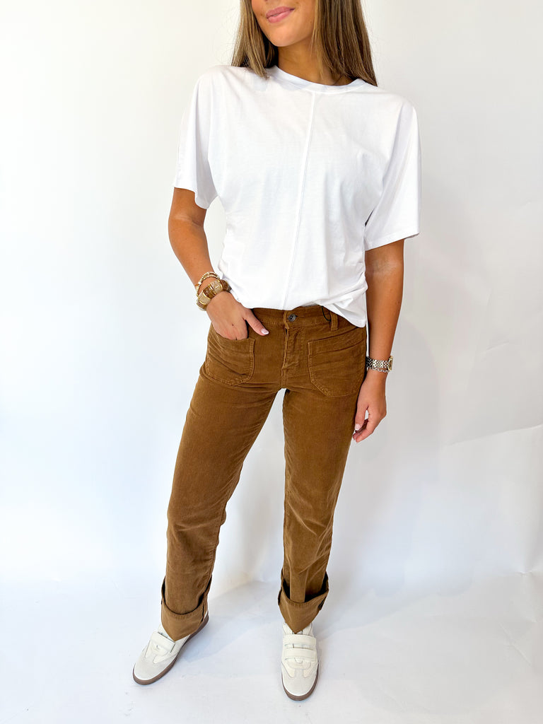 These full-length corduroy pants offer versatile style with rich texture in classic brown and crisp white. Wear them with heels for a polished look or cuff the hem to show off your favorite sneakers for casual comfort. Perfect for transition seasons, they combine timeless appeal with adaptable wearability.