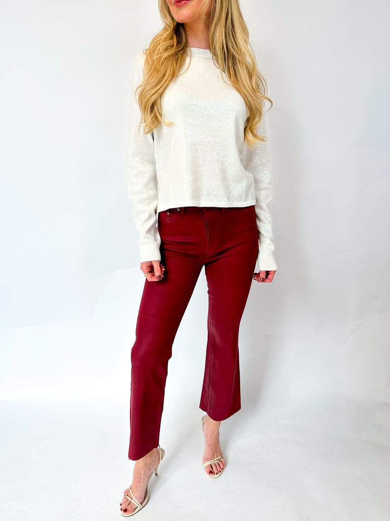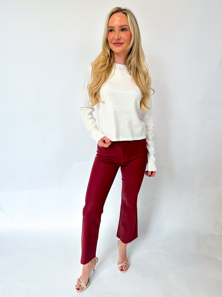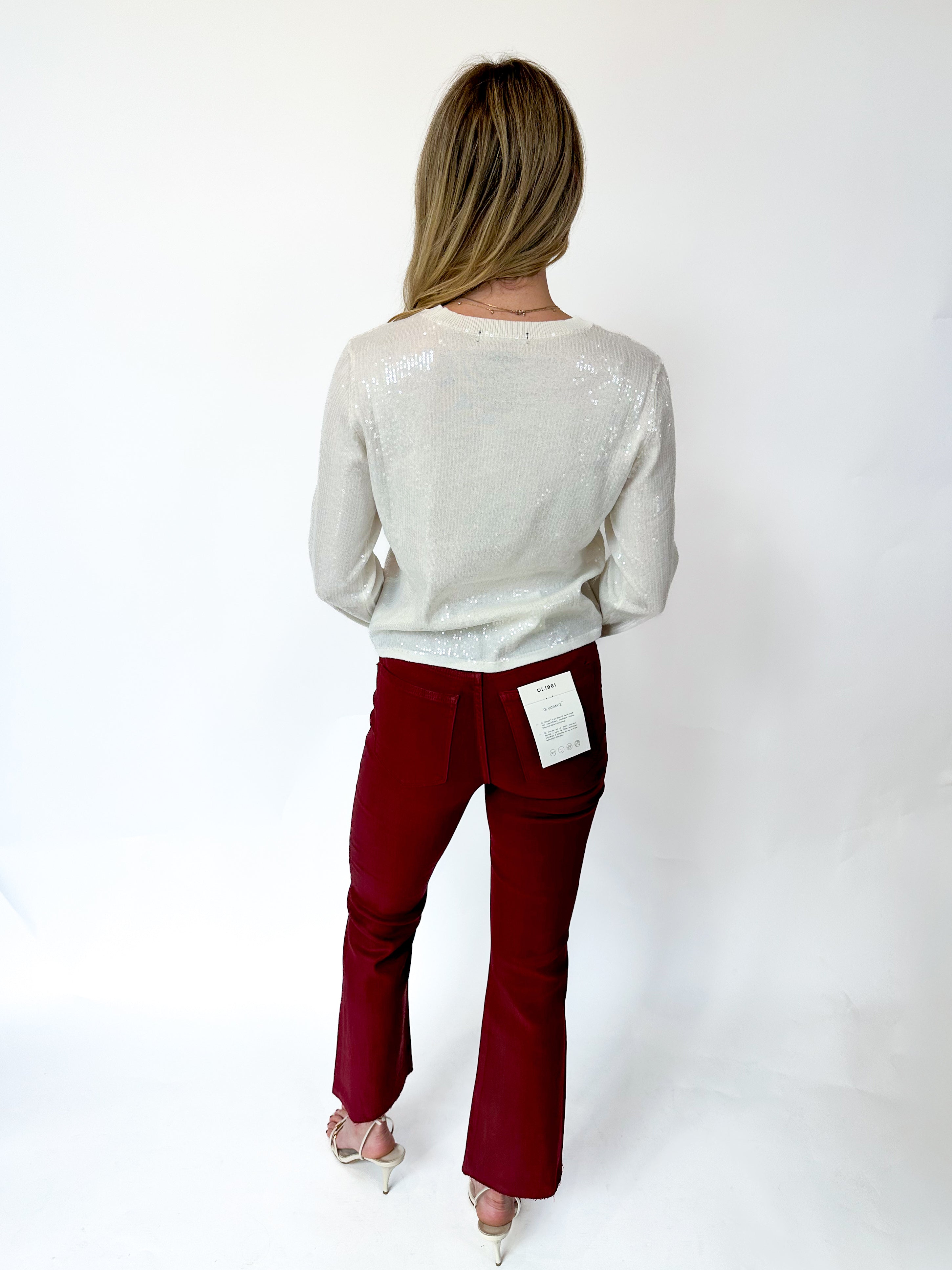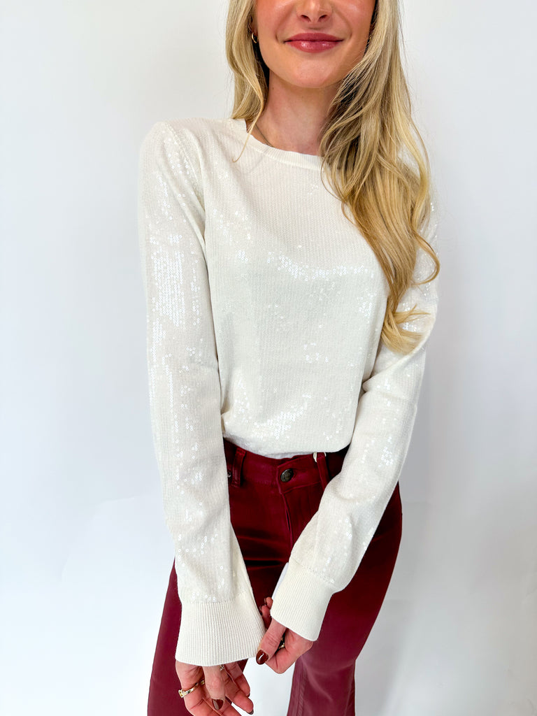 Shine bright in this eye-catching sequin top featuring a classic crew neck and relaxed fit that flatters every figure. The three-quarter sleeves offer the perfect balance of coverage and style, while ribbed hemlines and cuffs keep everything in place. Simply pull it on and go—effortless glamour for any occasion.