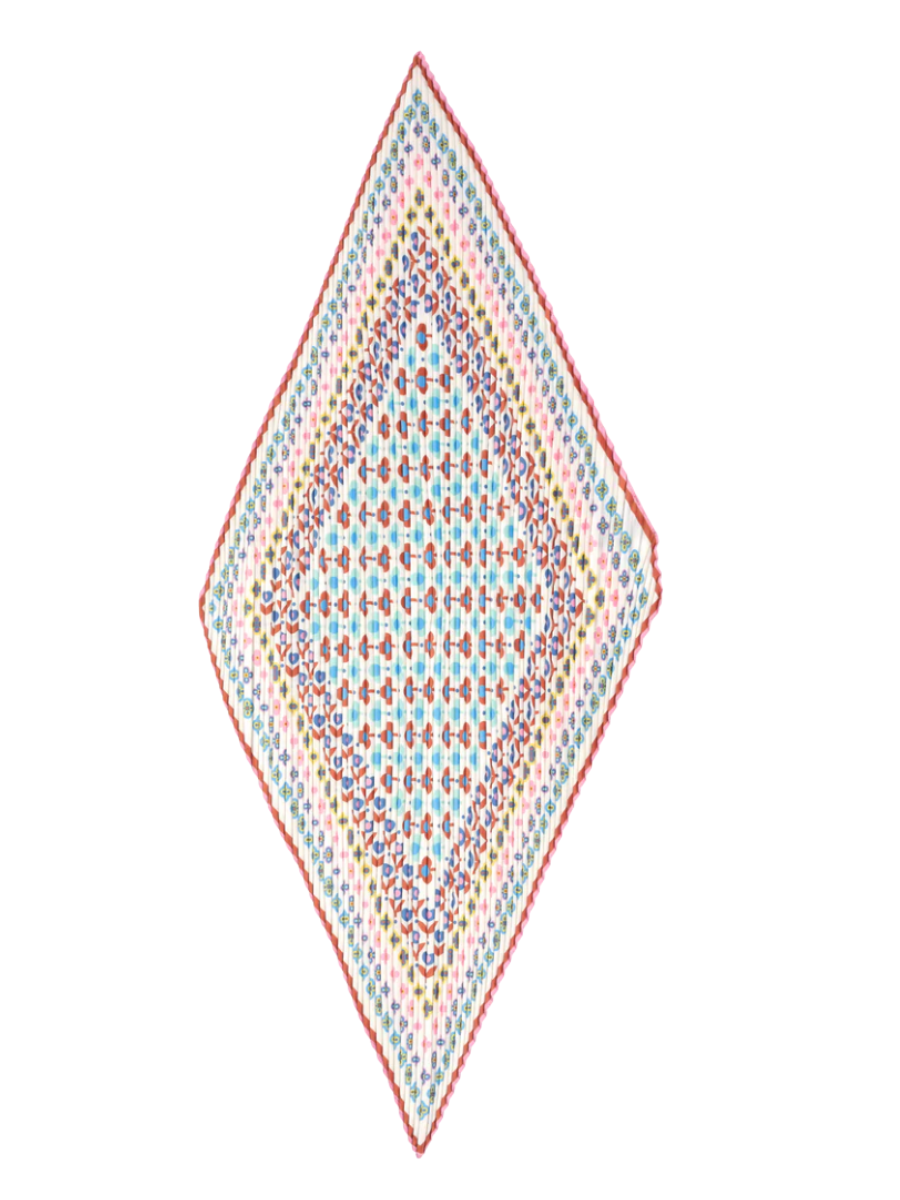 The Clover Pleated Diamond features a geometric floral motif set within decorative borders. Through its pleating, the design transforms, balancing both floral elegance and structured geometry.