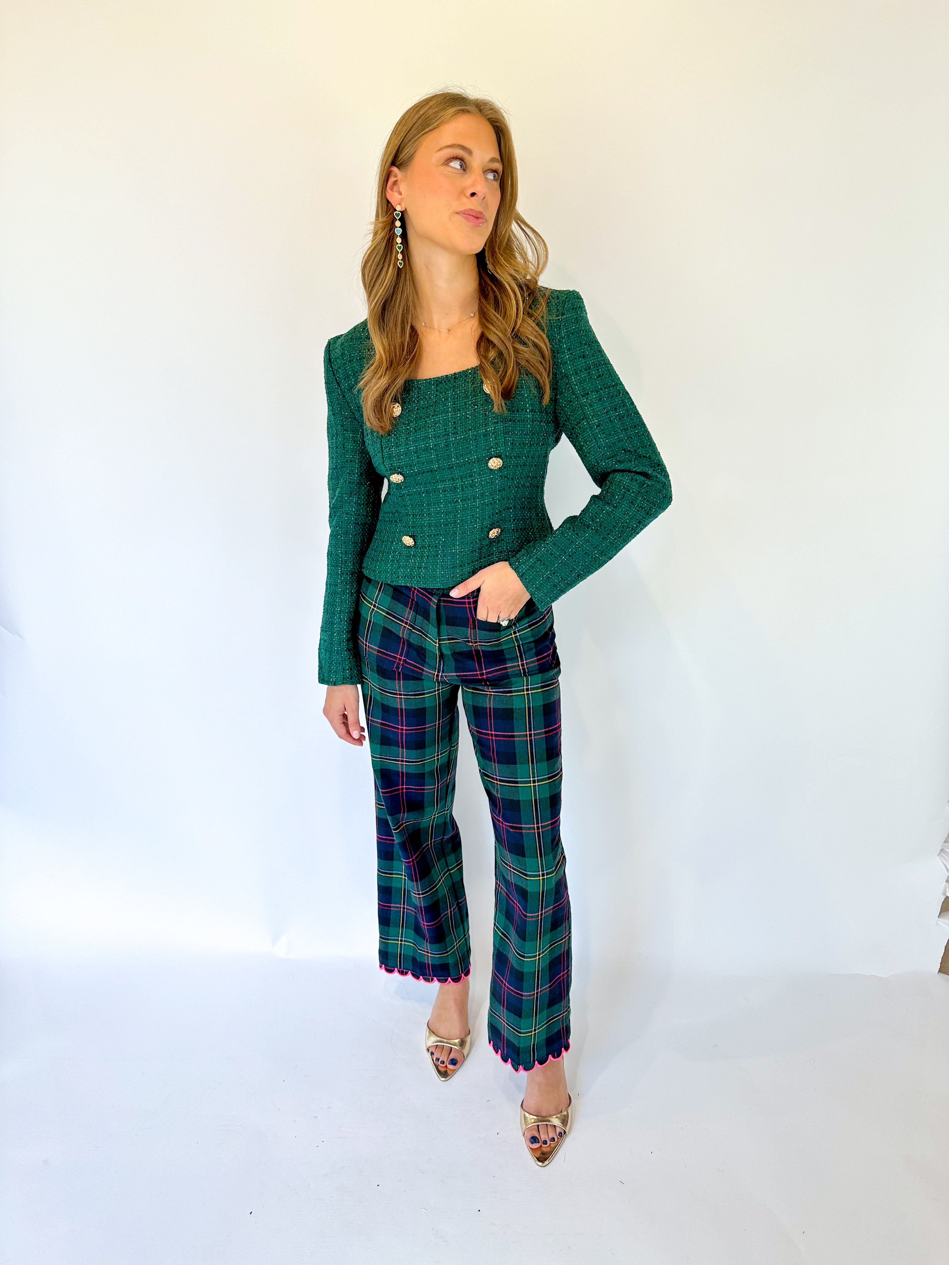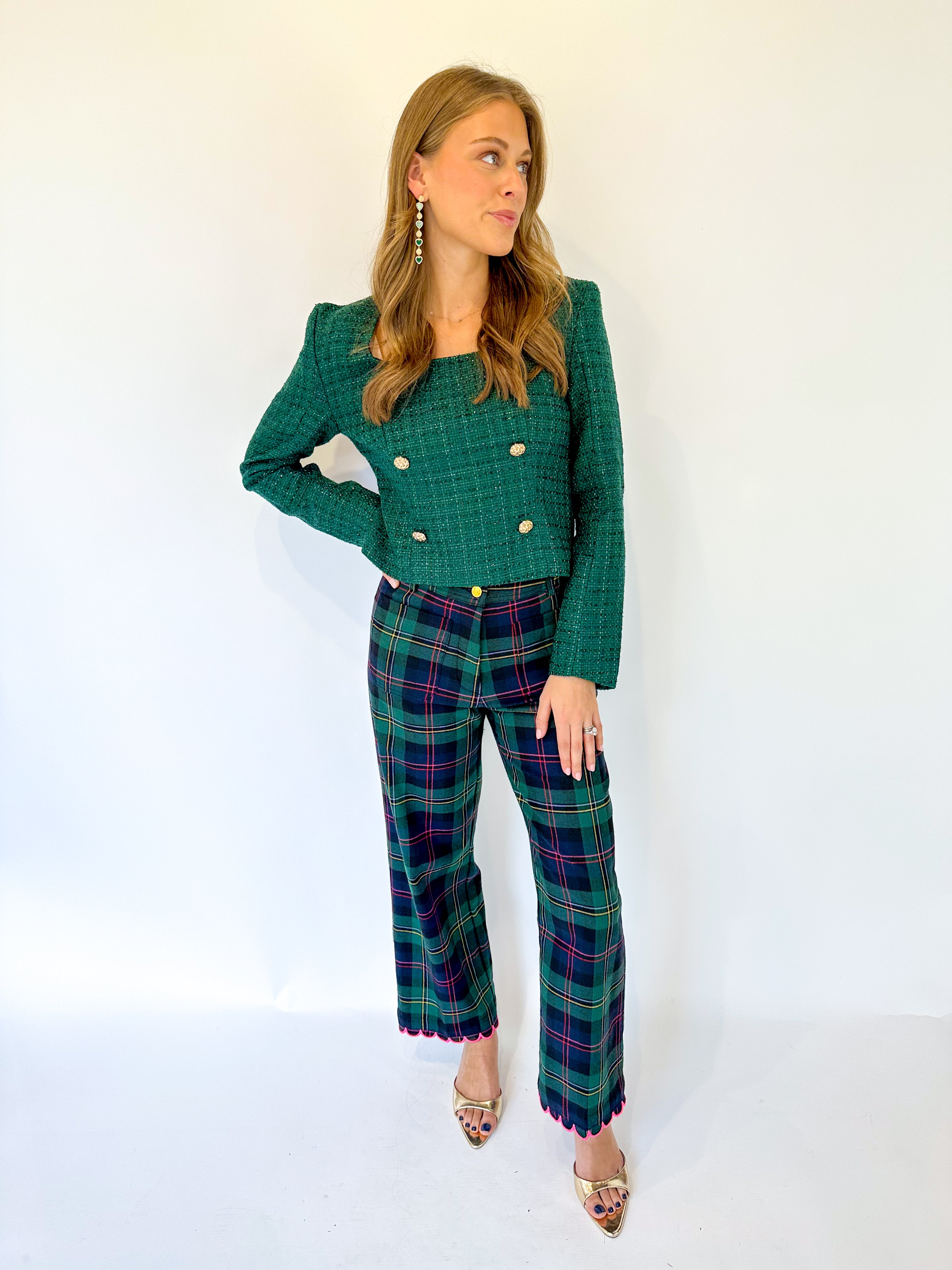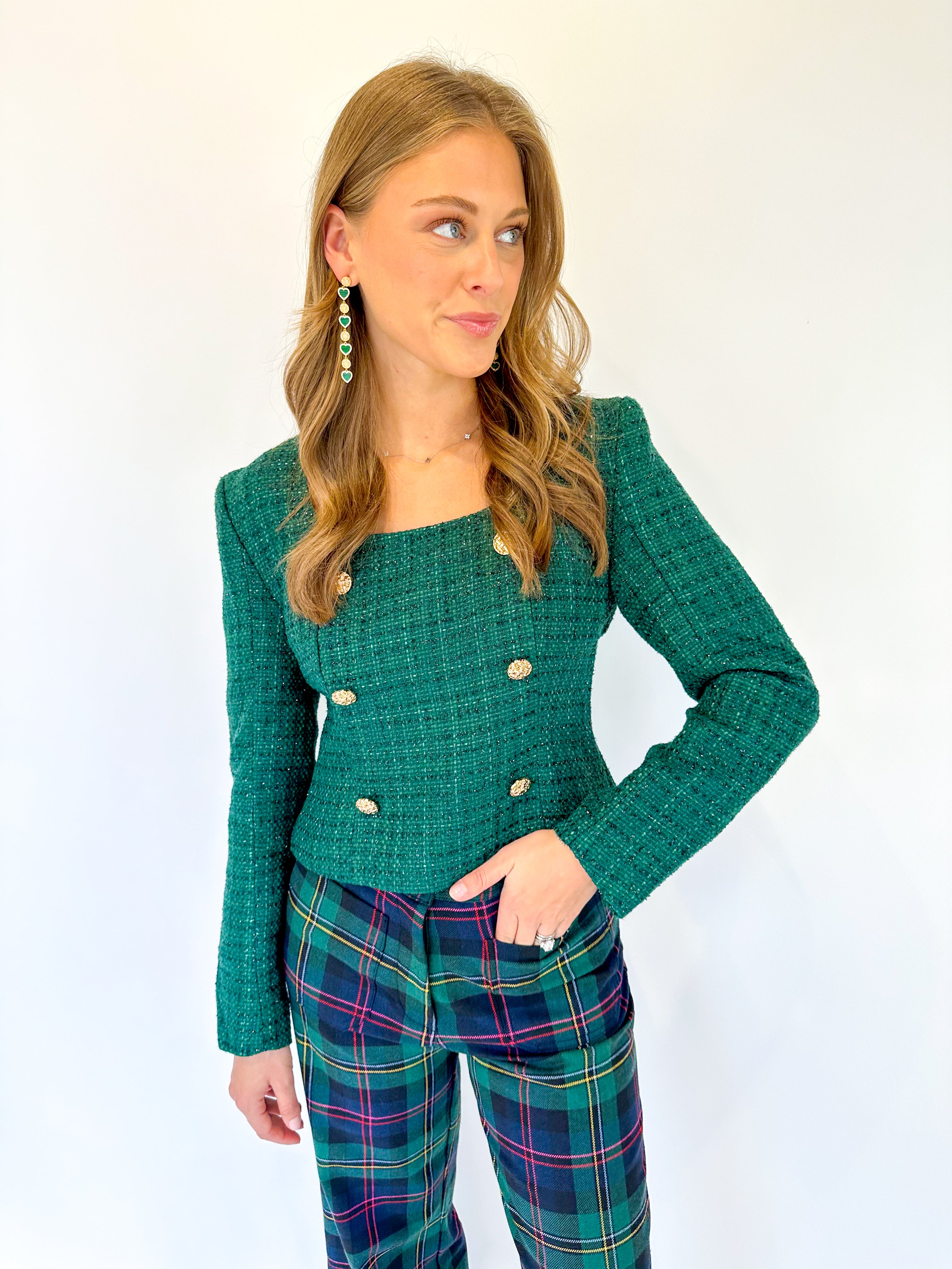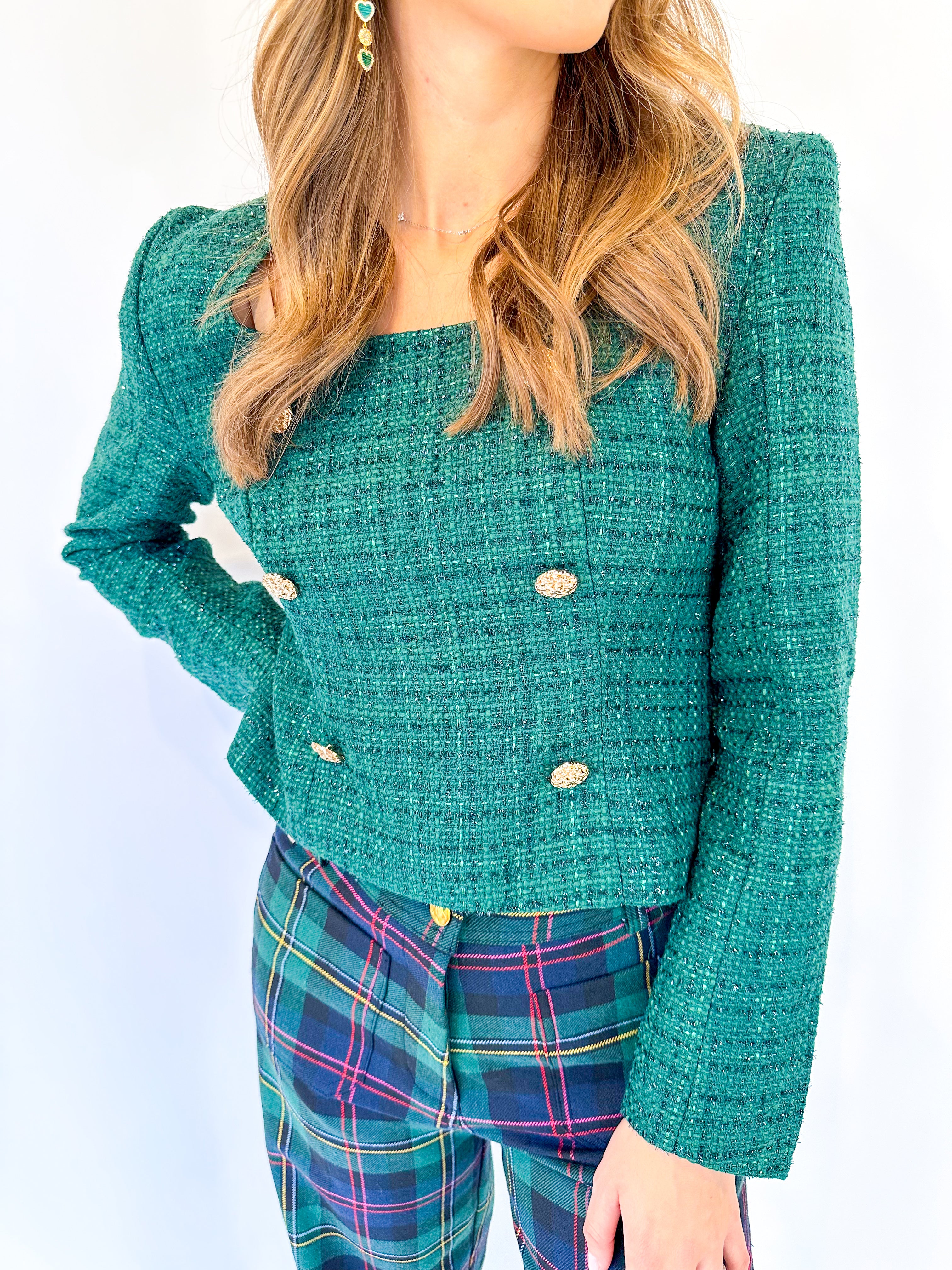 • Fabric: textured tweed with a subtle shimmer in evergreen