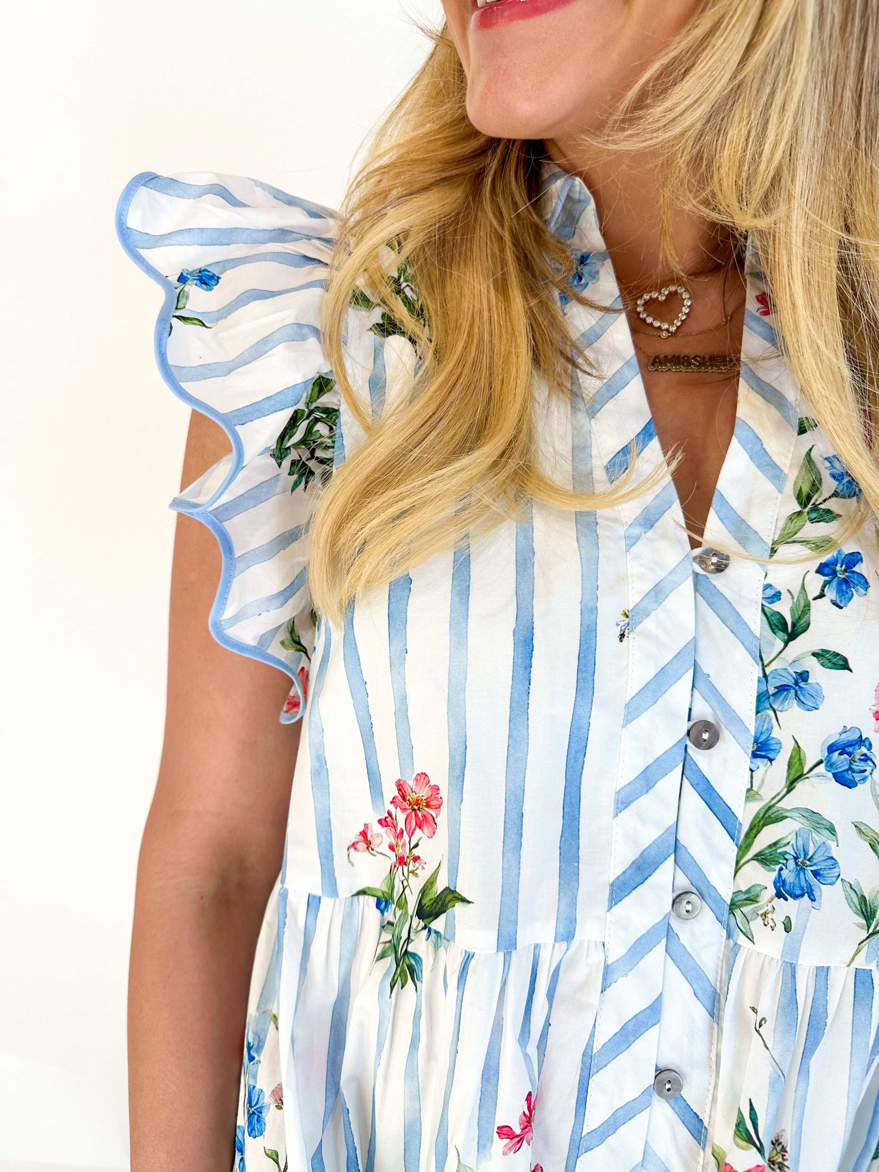 Twirl in this charming floral stripe mini dress, designed with delicate flutter sleeves that frame your shoulders beautifully. The front button closure offers easy styling, while scallop-trimmed edges add a feminine touch that catches every eye. Perfect for brunch dates, garden parties, or whenever you want to feel effortlessly put-together.