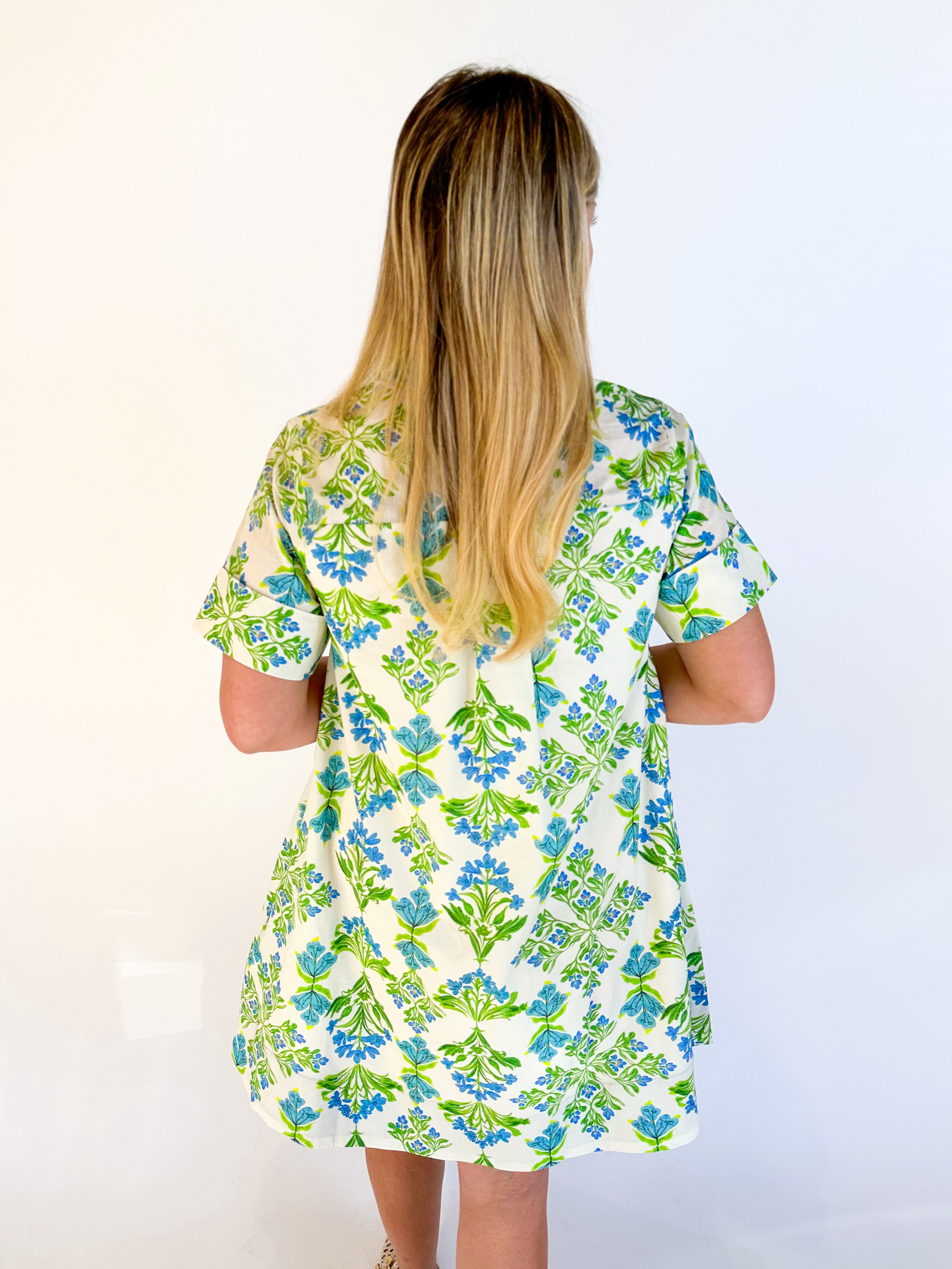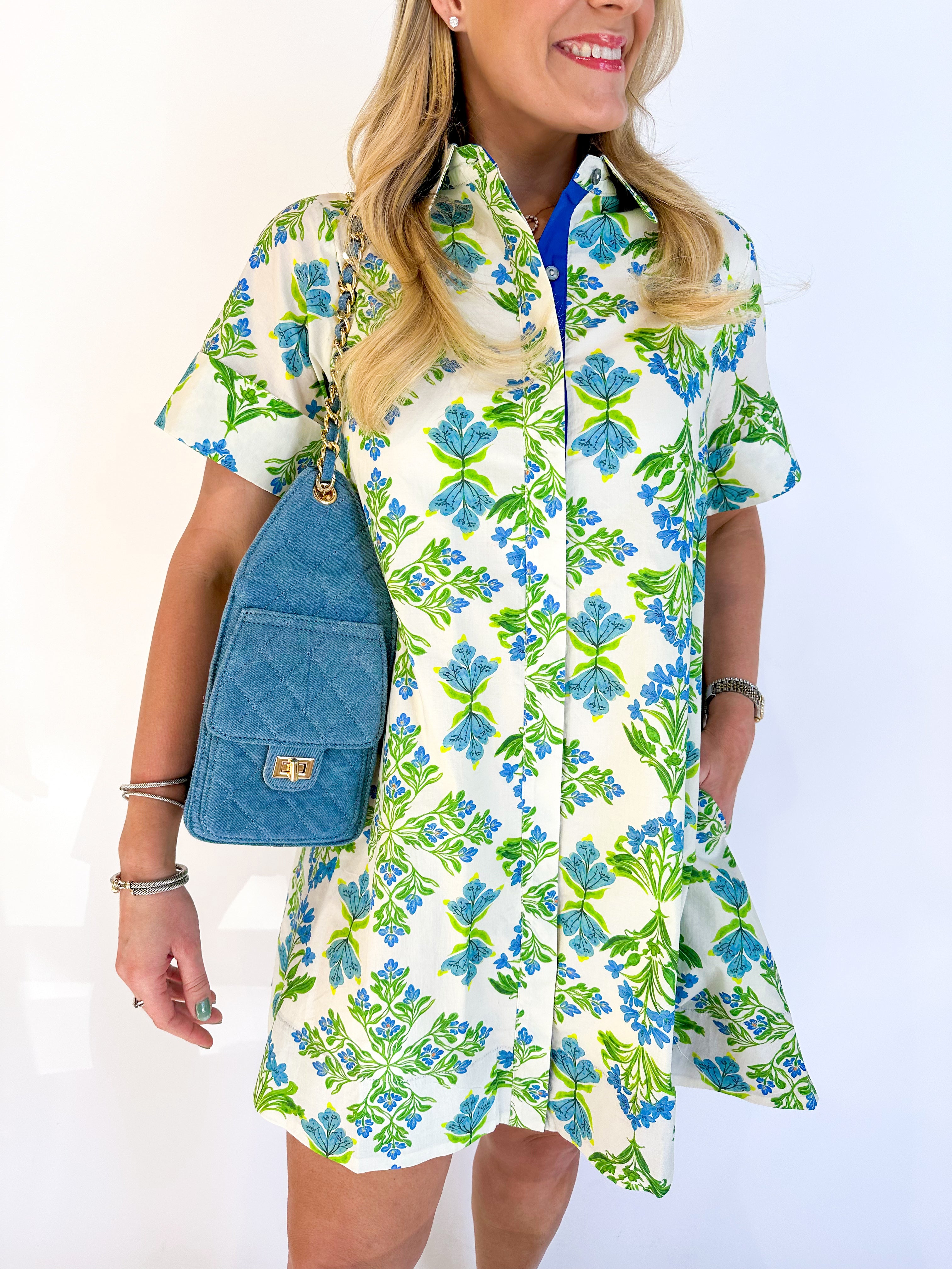 Effortlessly chic and ready for spring, this mini dress features a vibrant green and blue floral print that turns heads. The spread collar and hidden button front add polished detail, while side pockets deliver practical style. Perfect for casual outings or weekend adventures, this piece transitions seamlessly from day to night with minimal effort.